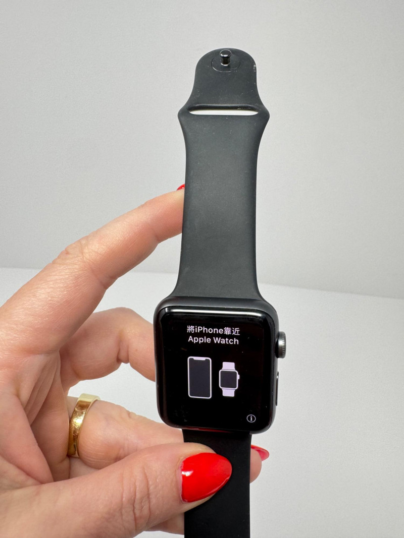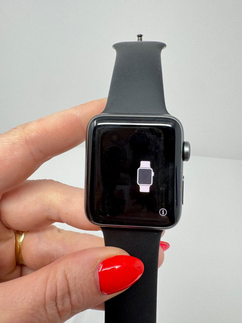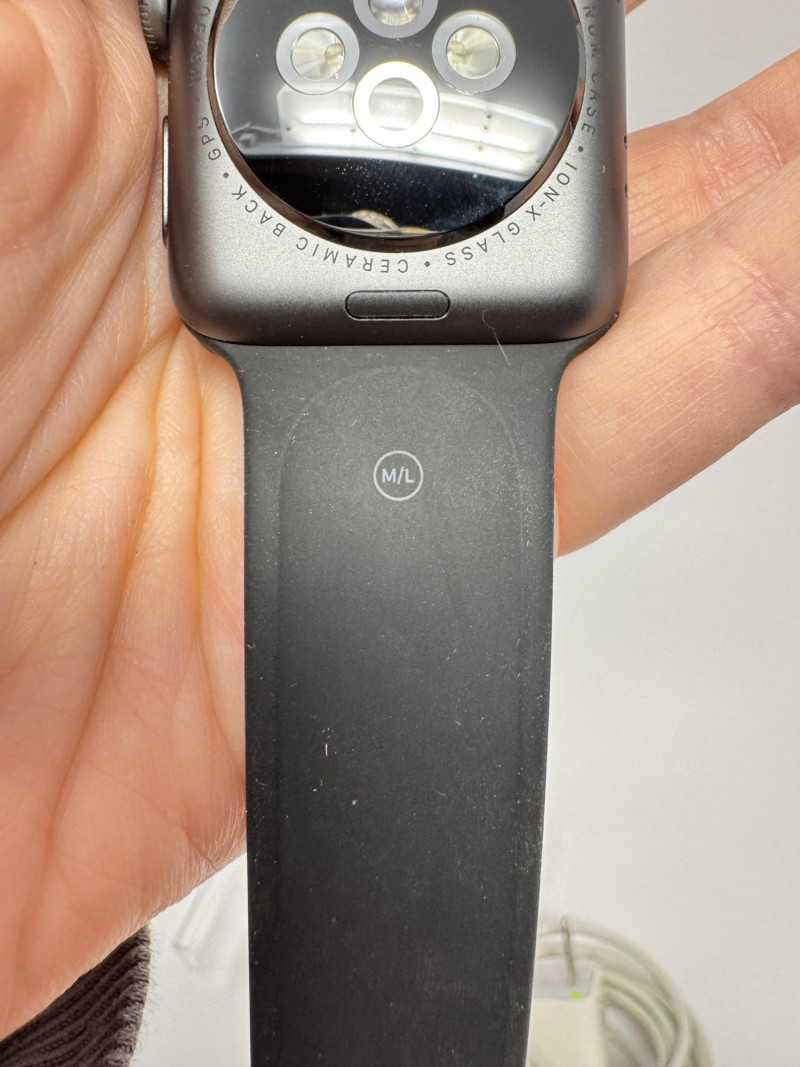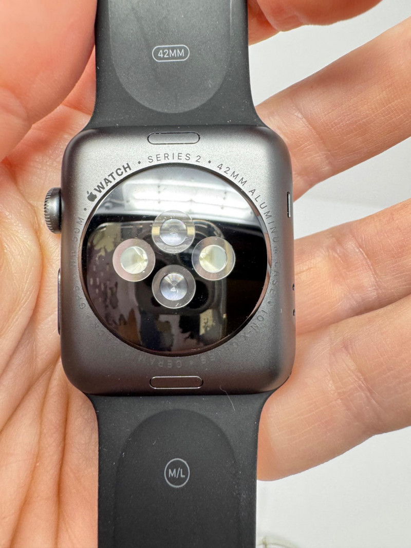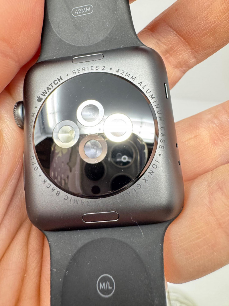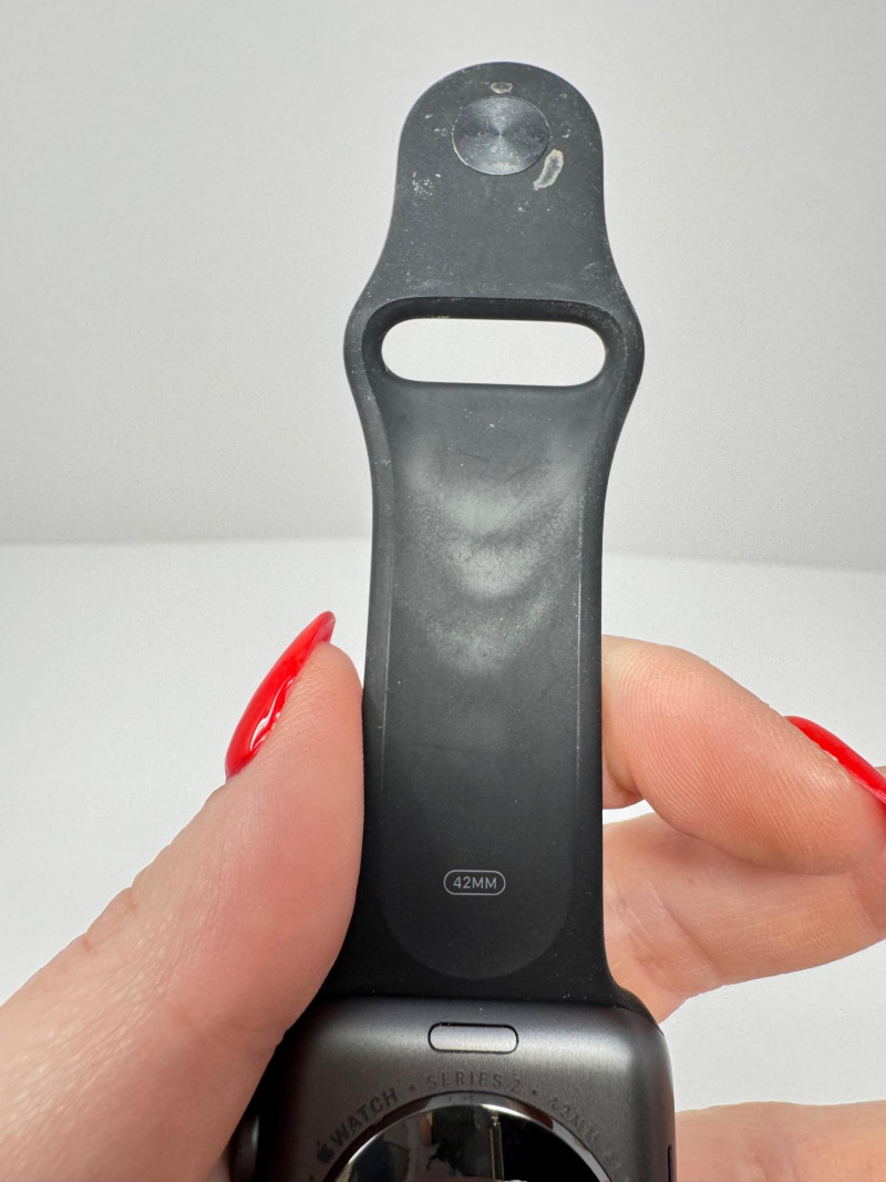 Apple Watch Series 2 GPS 42 mm Space Gray – Black Sport Band + Charger. Features Generation / case: Series 2, 42 mm space-gray aluminum, Ion-X glass Functions: Built-in GPS, WR-50 m water-resistant Band: Black Sport Band, size M/L (42 mm) Includes: Apple magnetic charging puck & USB power adapter Status: Powers on to pairing screen. Condition disclaimer: All pieces are previously used and may display light, unnoted wear—smudges, marks, or small surface scratches—with minor variations from item to item.