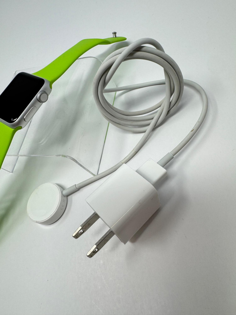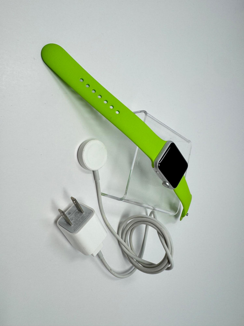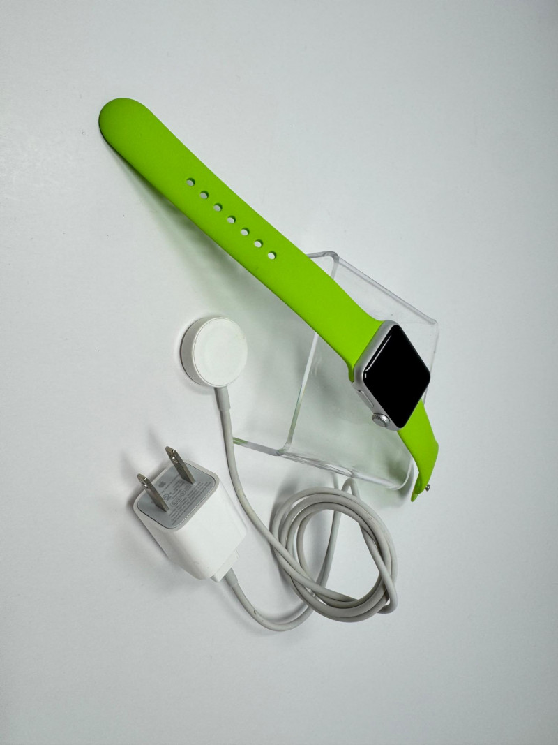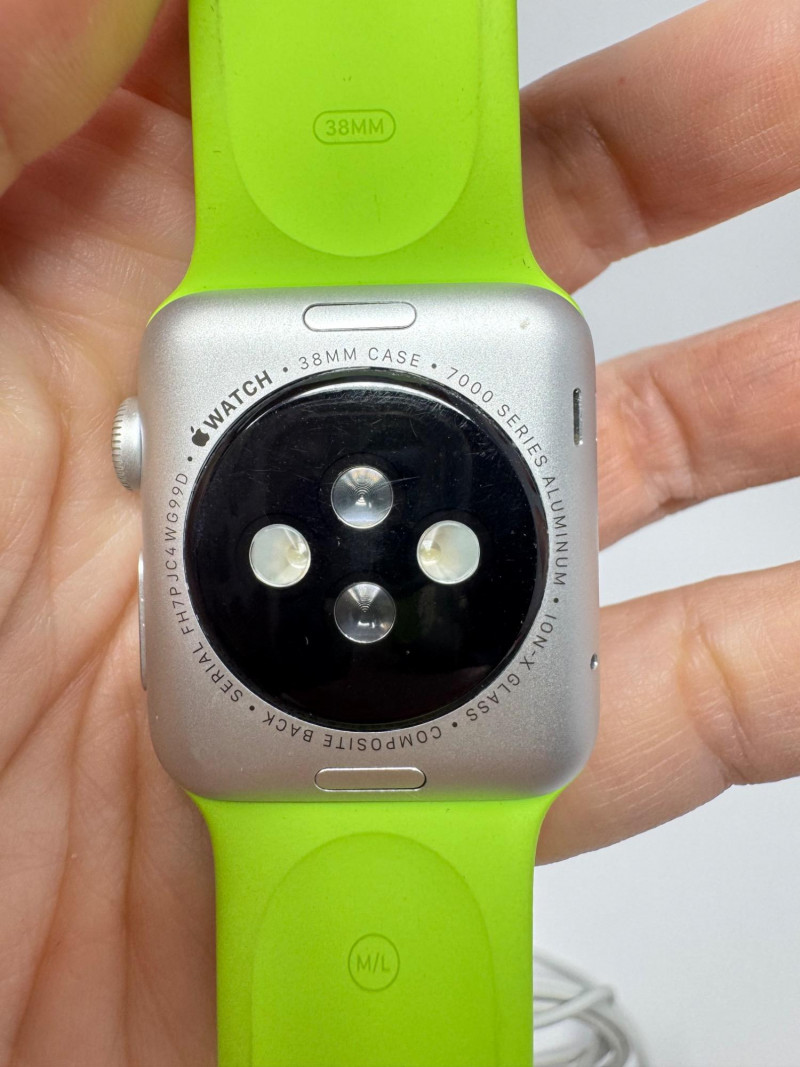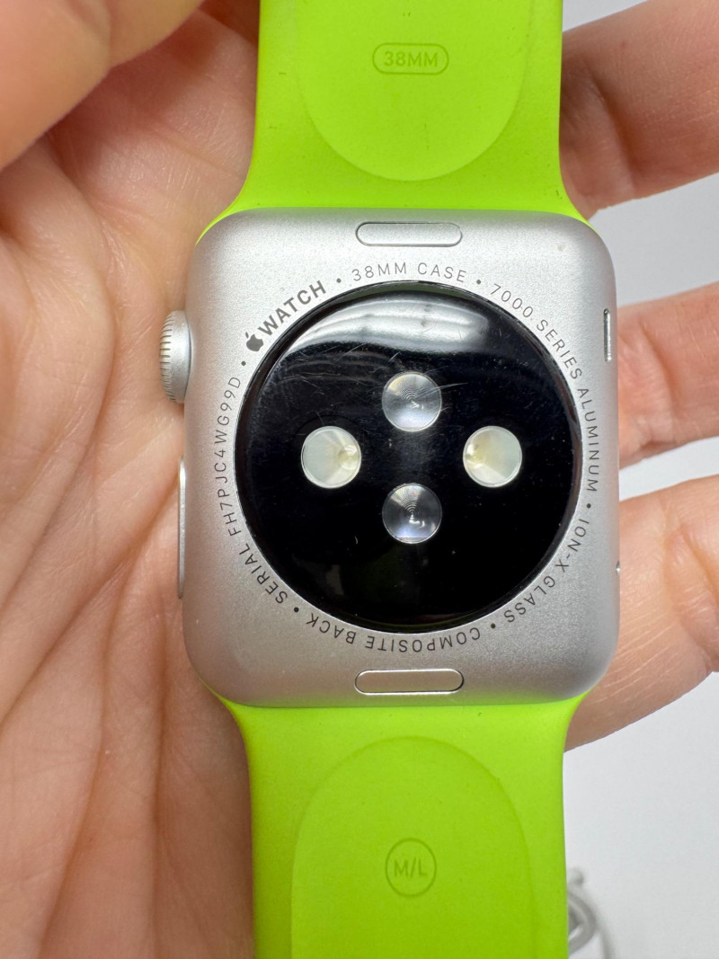 Apple Watch 38mm Aluminum (1st gen) + – Green Band, Charger & Cable. Features Generation / case:1st-gen Apple Watch Sport, 38 mm 7000-series aluminum Display: Ion-X glass touchscreen Band: Bright-green Sport Band, size M/L (38 mm) Serial number: FH7PJC4WG99D Includes: Apple magnetic charging puck + USB power adapter Status: Powers on to pairing screen. Condition disclaimer: All pieces are previously used and may display light, unnoted wear—smudges, marks, or small surface scratches—with minor variations from item to item.