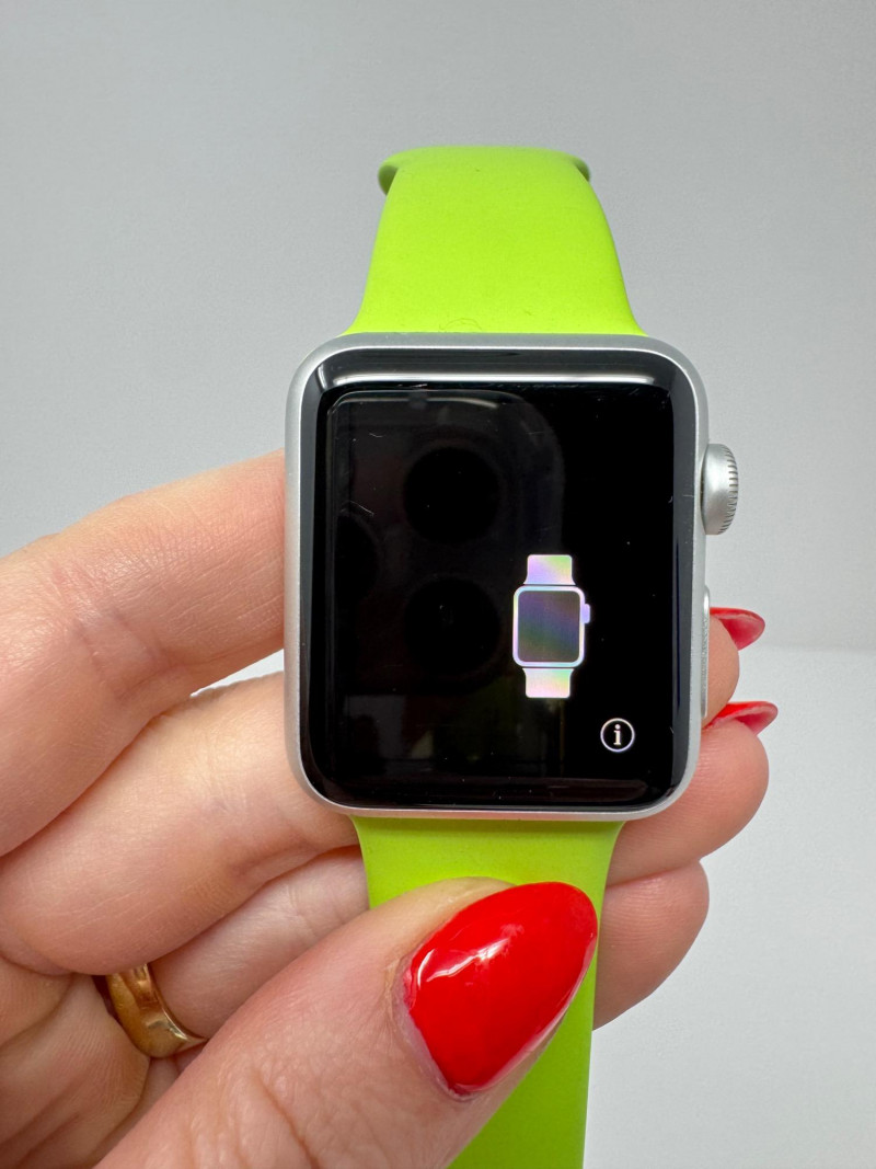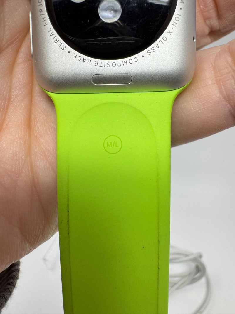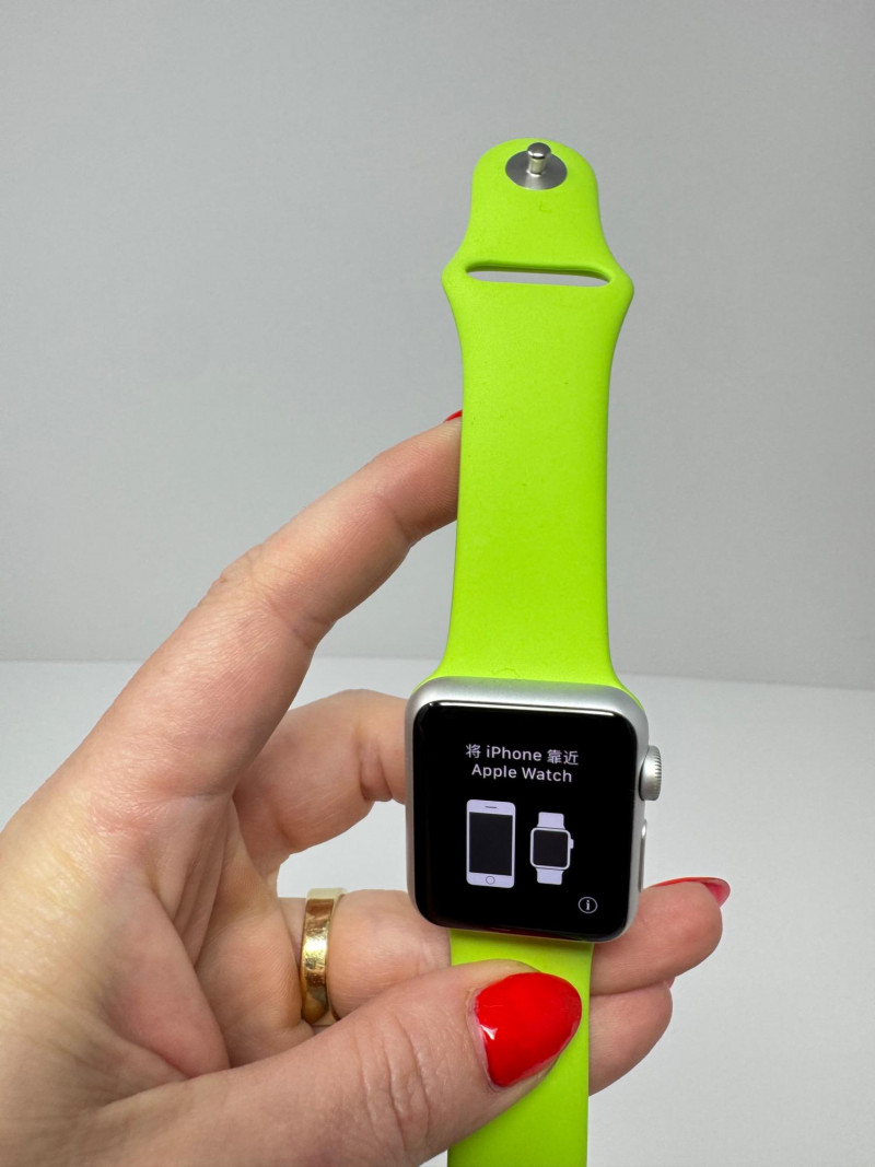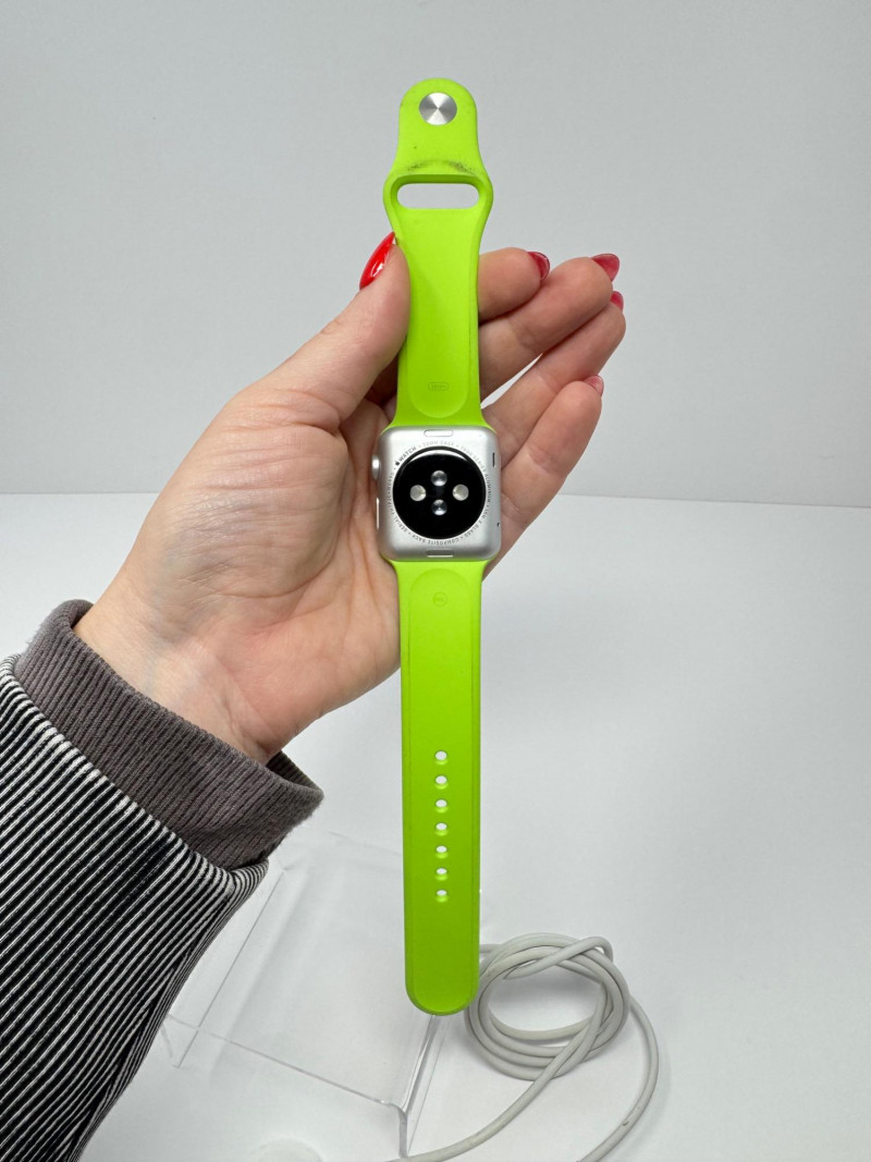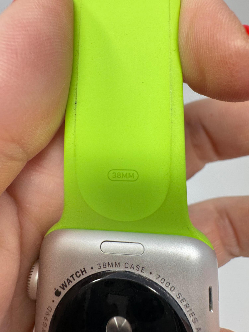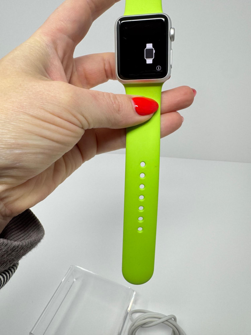 Apple Watch 38mm Aluminum (1st gen) + – Green Band, Charger & Cable. Features Generation / case:1st-gen Apple Watch Sport, 38 mm 7000-series aluminum Display: Ion-X glass touchscreen Band: Bright-green Sport Band, size M/L (38 mm) Serial number: FH7PJC4WG99D Includes: Apple magnetic charging puck + USB power adapter Status: Powers on to pairing screen. Condition disclaimer: All pieces are previously used and may display light, unnoted wear—smudges, marks, or small surface scratches—with minor variations from item to item.