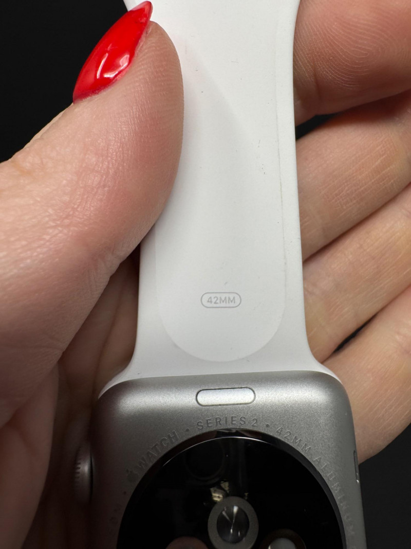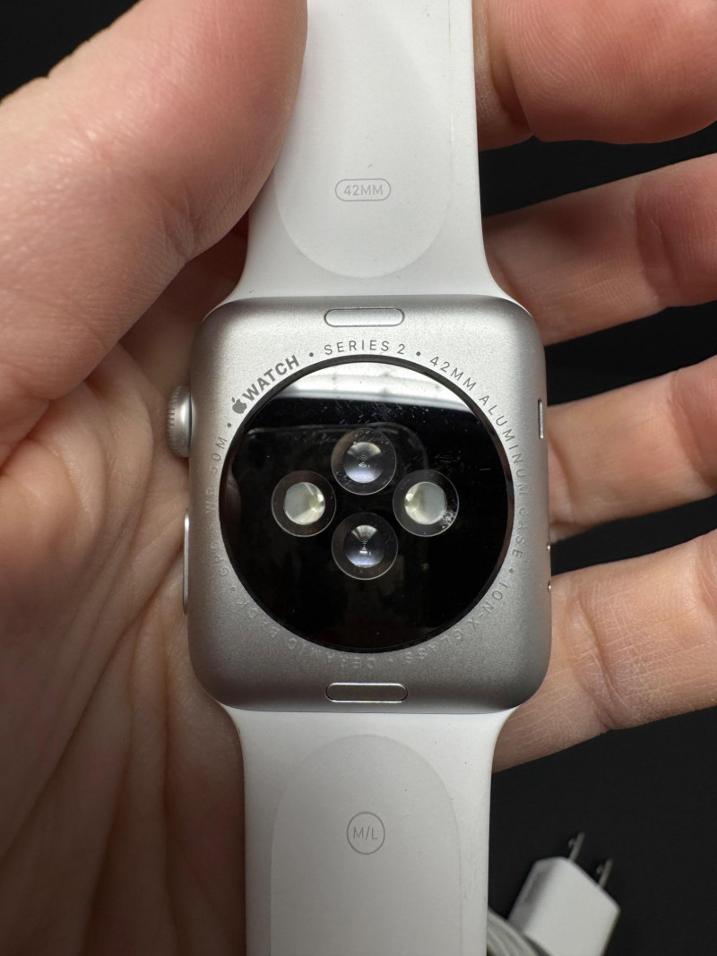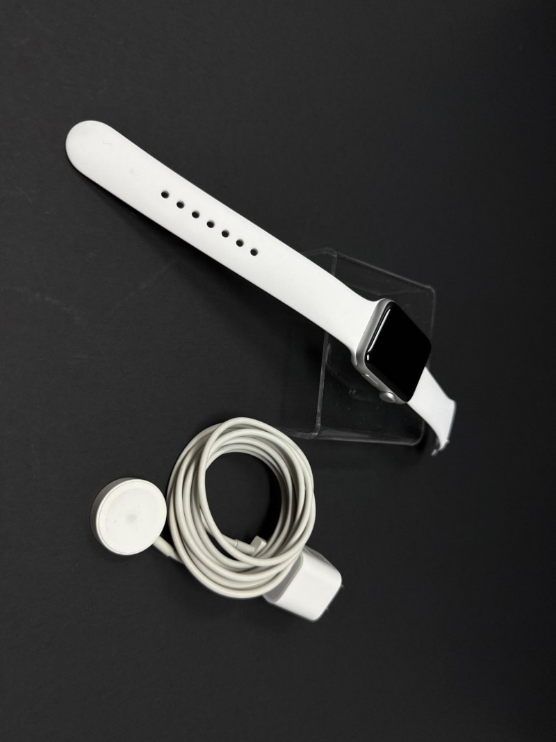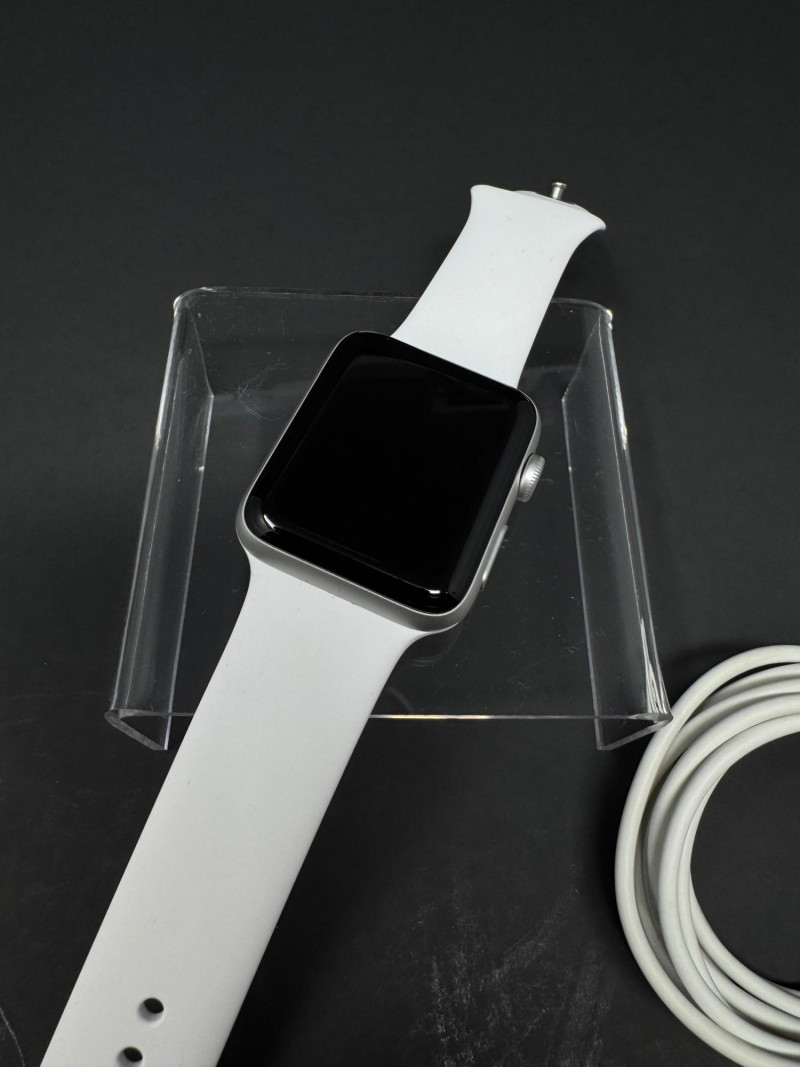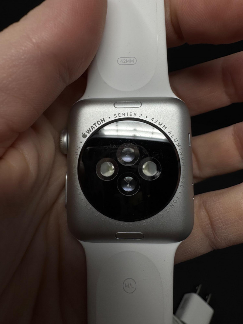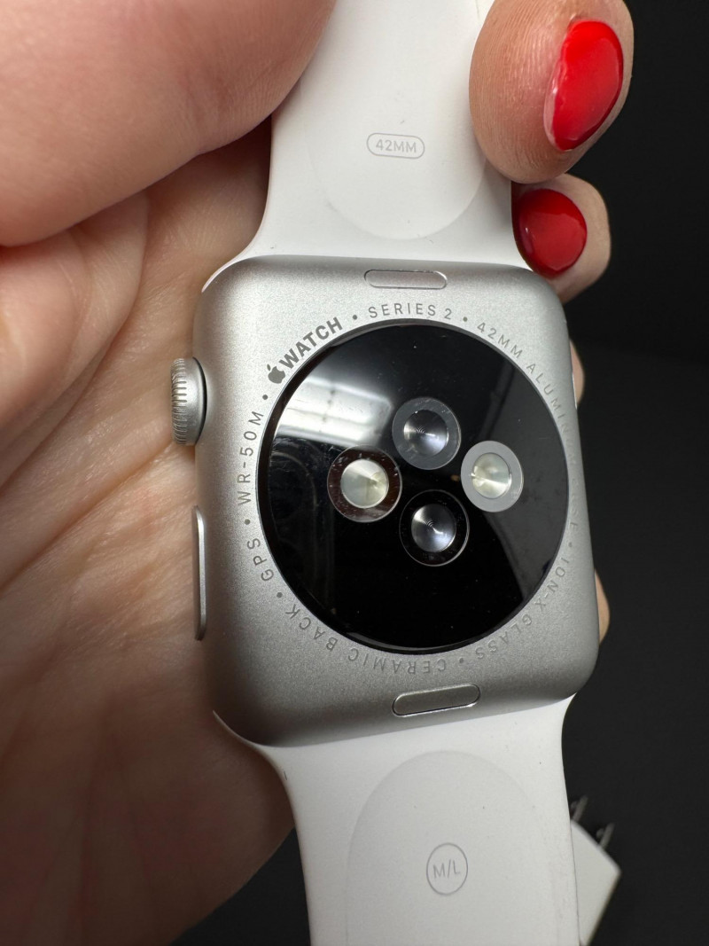 Apple Watch Series 2 GPS 42 mm Silver Alum – White Band + Charger. Features Generation / case: Series 2, 42 mm silver-aluminum, Ion-X glass Functions: Built-in GPS, WR-50 m water-resistant Band: White Sport Band, size M/L (42 mm) Includes: Apple magnetic charging puck & USB power adapter Status: Powers on to pairing screen. Condition disclaimer: All pieces are previously used and may display light, unnoted wear—smudges, marks, or small surface scratches—with minor variations from item to item.