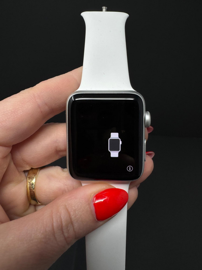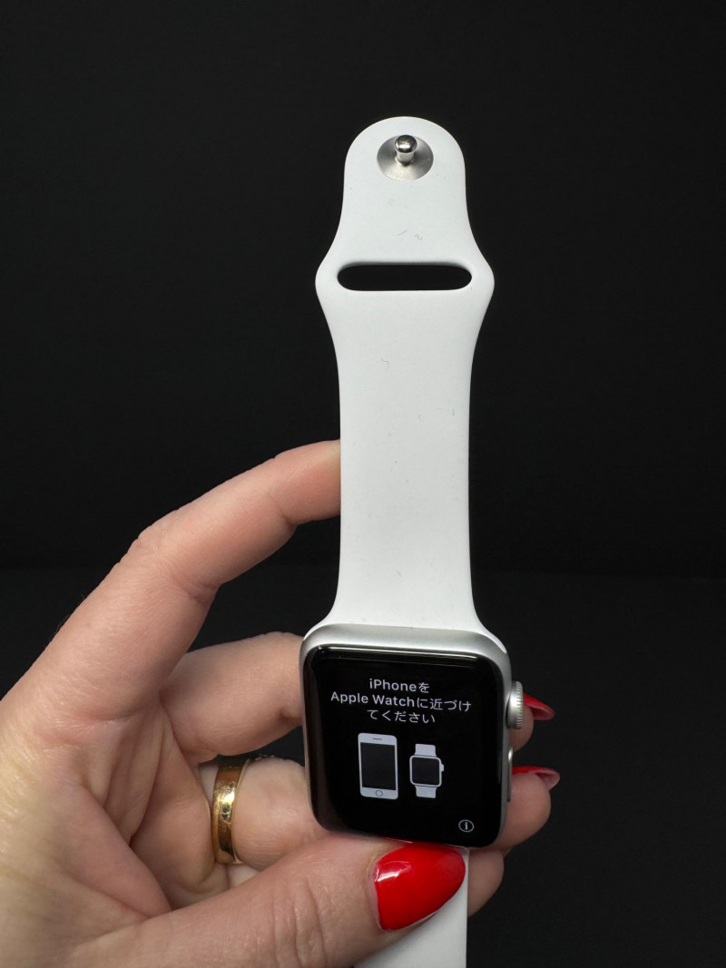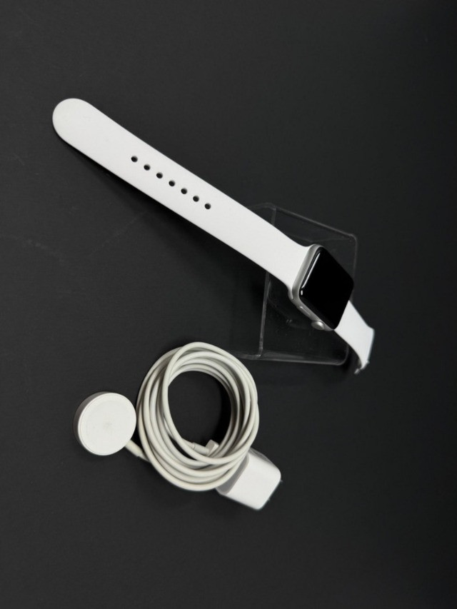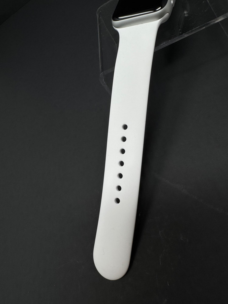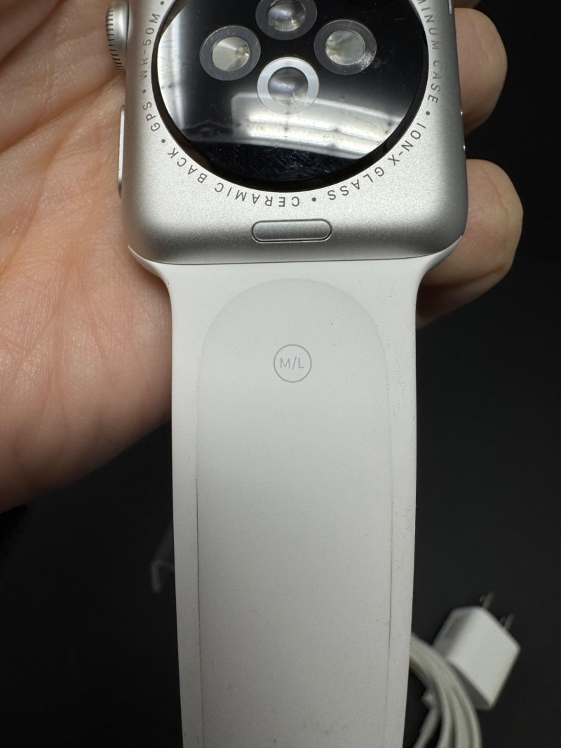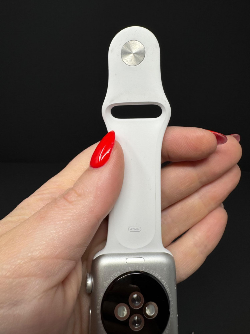 Apple Watch Series 2 GPS 42 mm Silver Alum – White Band + Charger. Features Generation / case: Series 2, 42 mm silver-aluminum, Ion-X glass Functions: Built-in GPS, WR-50 m water-resistant Band: White Sport Band, size M/L (42 mm) Includes: Apple magnetic charging puck & USB power adapter Status: Powers on to pairing screen. Condition disclaimer: All pieces are previously used and may display light, unnoted wear—smudges, marks, or small surface scratches—with minor variations from item to item.