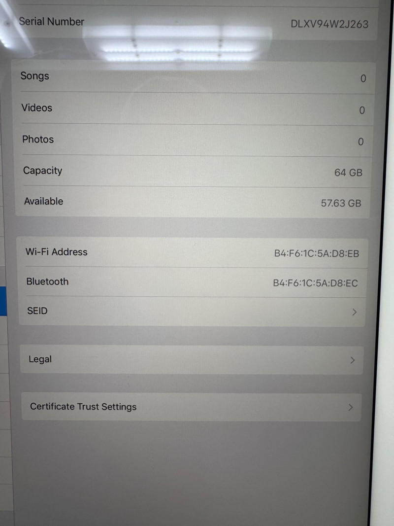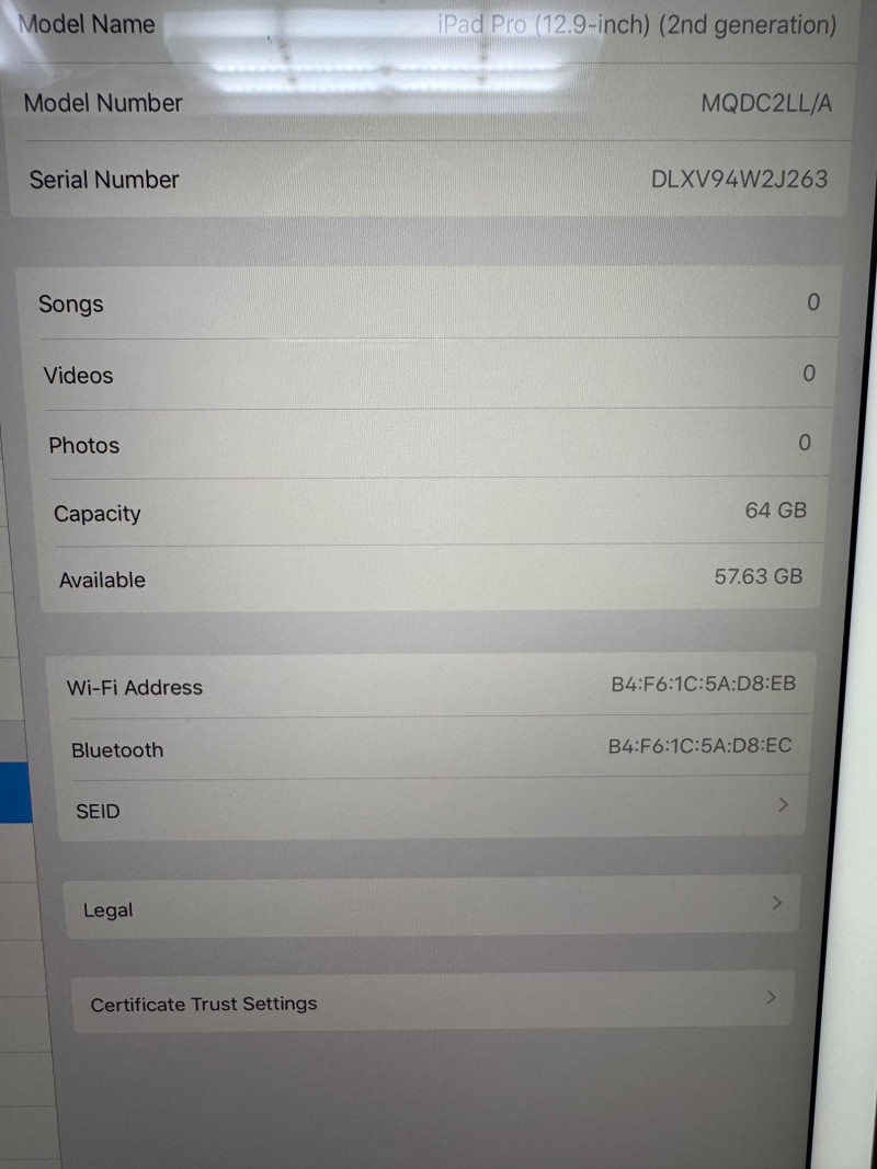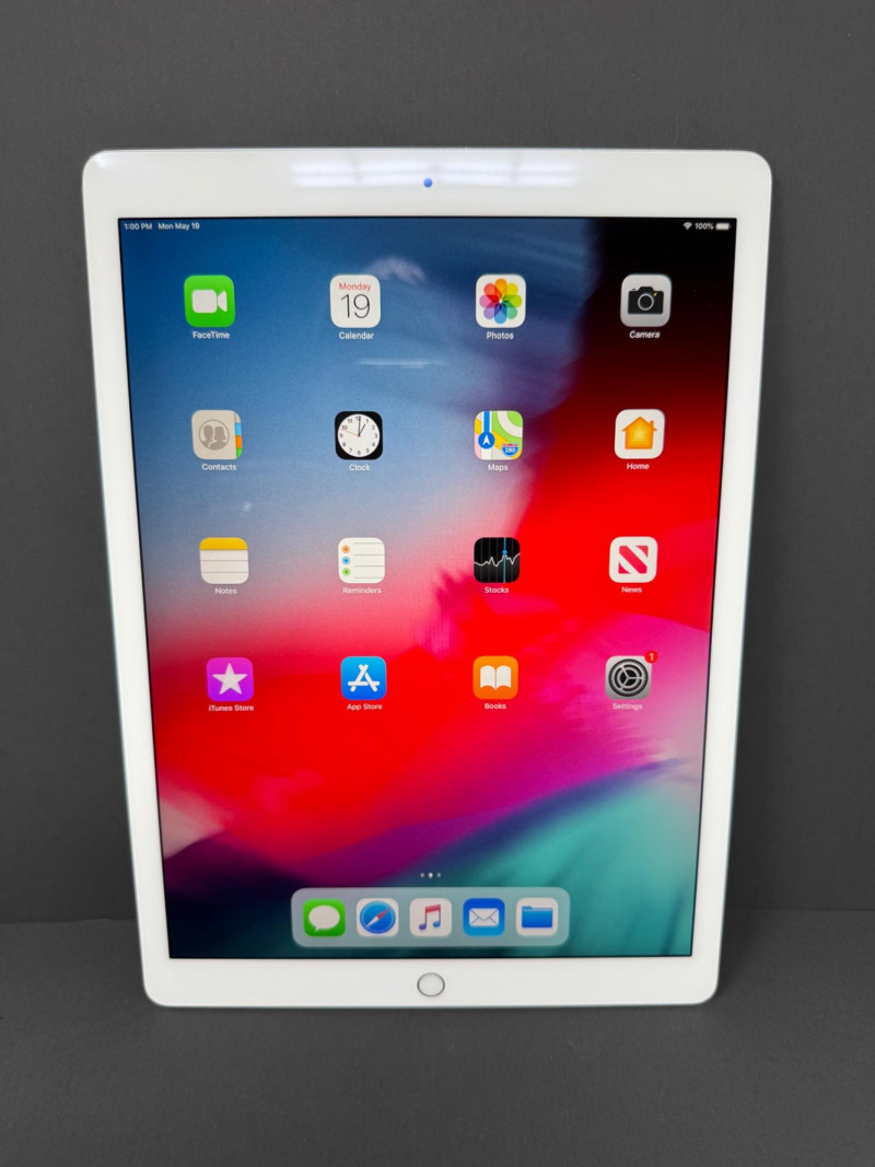 Apple iPad Pro 12.9-in (2nd Gen, Silver) – iOS 12.4, 57 GB Free. Features Model:iPad Pro 12.9-inch (2nd generation) – MQDC2LL/A, Silver iOS version:12.4 Capacity (formatted):64 GB — 57.63 GB available Serial number:DLXV94W2J263 Condition disclaimer: Previously used; light, shallow surface scratches are visible on the screen (see close-up photo). All items may show minor smudges or marks consistent with office use.