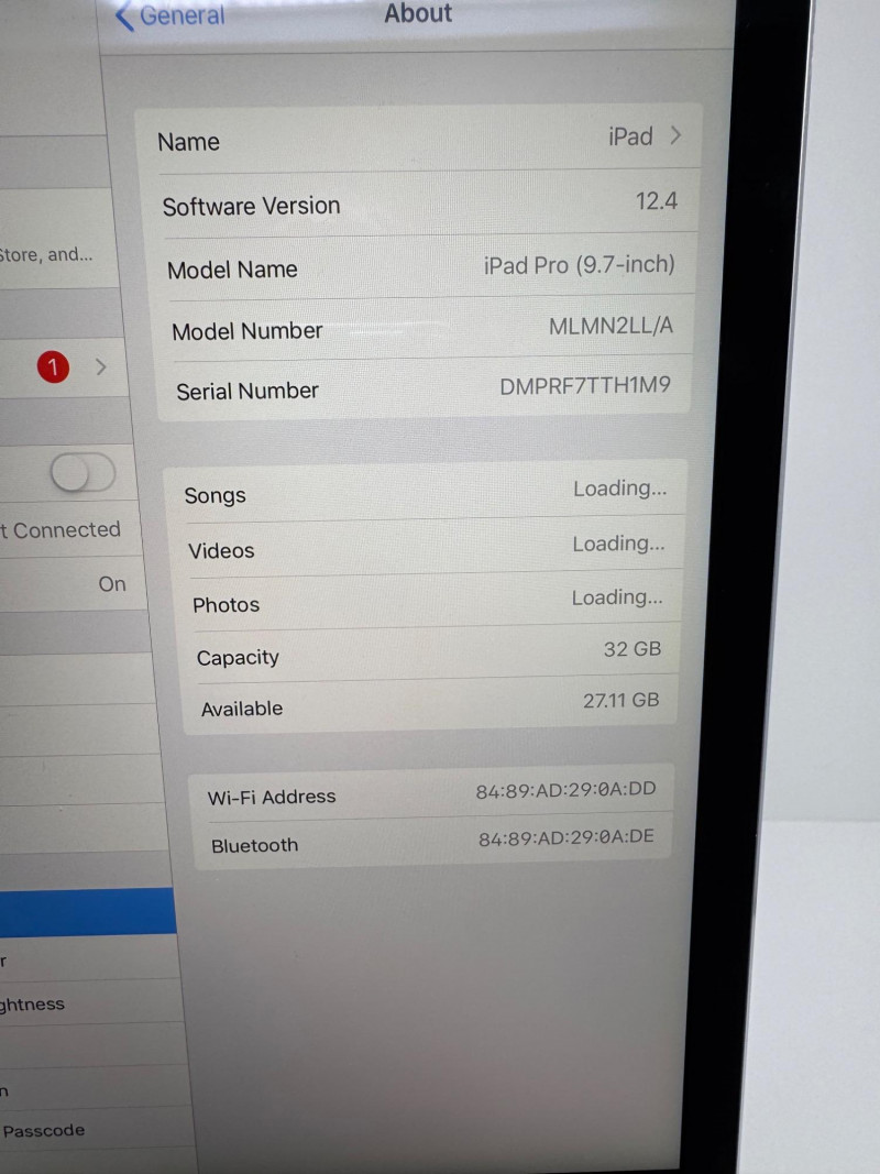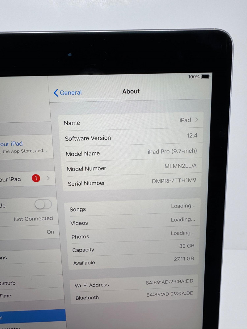 Apple iPad Pro 9.7-inch (Wi-Fi, Space Gray) – iOS 12.4, 27.11 GB Free. Features Model: iPad Pro 9.7-inch — MLMN2LL/A, Space Gray, Wi-Fi-only iOS version:12.4 Capacity:32 GB — 27.11 GB available Serial number:DMPRF7TTHM9 Condition disclaimer: Previously used; items may show light, unnoted wear such as smudges, minor scratches, or small marks consistent with office use.
