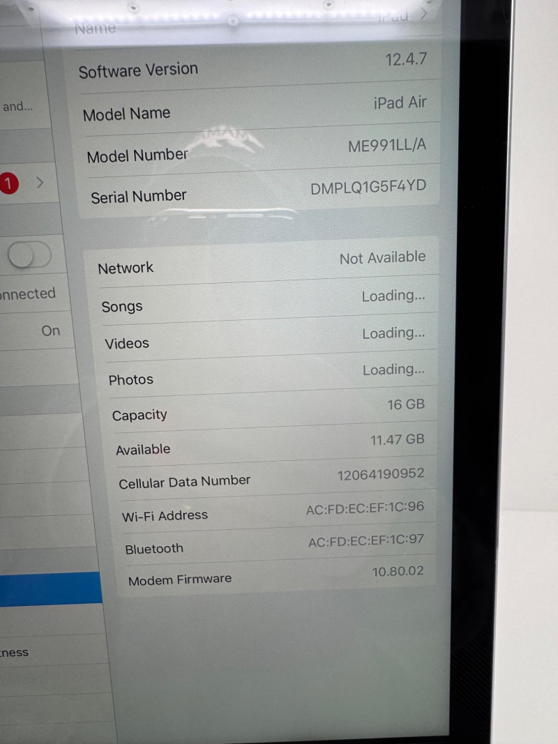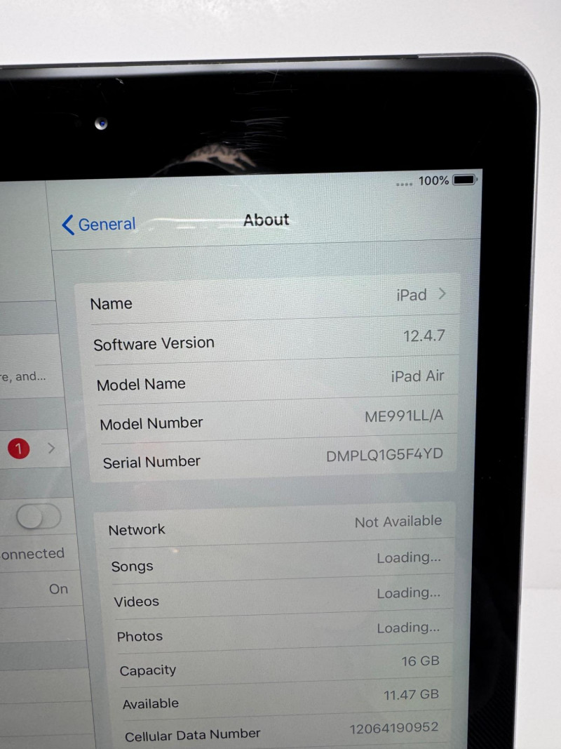 Apple iPad Air (Wi-Fi + Cellular) – iOS 12.4.7, 11.47 GB Free. Features Model: iPad Air — ME991LL/A, Space Gray, Wi-Fi + Cellular iOS version:12.4.7 Capacity :16 GB — 11.47 GB available Serial number:DMPLQ1G5F4YD Condition disclaimer: Previously used; items may show light, unnoted wear such as smudges, minor scratches, or small marks consistent with office use.