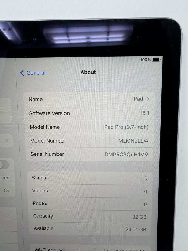 Apple iPad Pro (9.7-inch, Space Gray) – iPadOS 15.1, 24 GB Free. Features Model:iPad Pro (9.7-inch) — MLMN2LL/A, Space Gray, Wi-Fi only iPadOS version:15.1 Capacity:32 GB — 24.01 GB available Serial number:DMPRC9Q6H1M9 Condition disclaimer: Previously used; items may show light, unnoted wear such as smudges, minor scratches, or small marks consistent with office use.