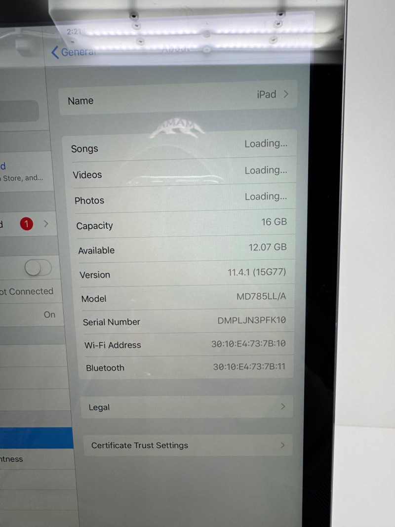 Apple iPad Air (Wi-Fi, Space Gray) – iOS 11.4.1, 12 GB Free. Features Model:iPad Air — MD785LL/A, Space Gray, Wi-Fi only iOS version:11.4.1 (15G77) Capacity:16 GB — 12.07 GB available Serial number:DMPLJN3PFK10 Condition disclaimer: Previously used; items may show light, unnoted wear such as smudges, minor scratches, or small marks consistent with office use.