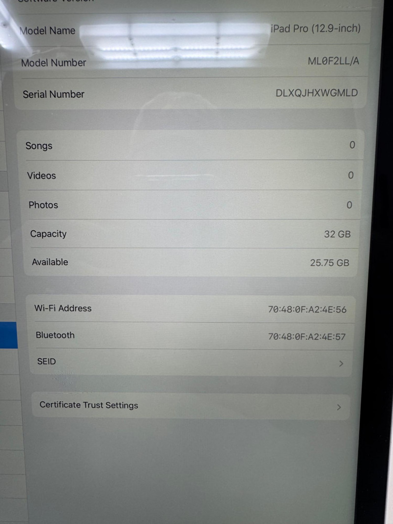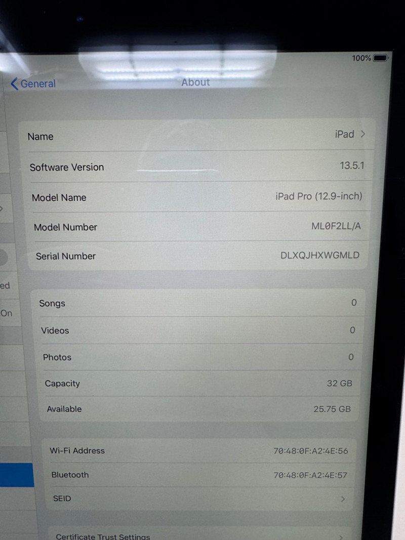 Apple iPad Pro (12.9-inch, Space Gray) – iOS 13.5.1, 25.75 GB Free. Features Model:iPad Pro (12.9-inch) — ML0F2LL/A, Space Gray, Wi-Fi iOS version:13.5.1 Capacity:32 GB — 25.75 GB available Serial number: DLXQJHXWGMLD Condition disclaimer: Previously used; items may show light, unnoted wear such as smudges, minor scratches, or small marks consistent with office use. Minor surface scratches noted (see close-up photo).