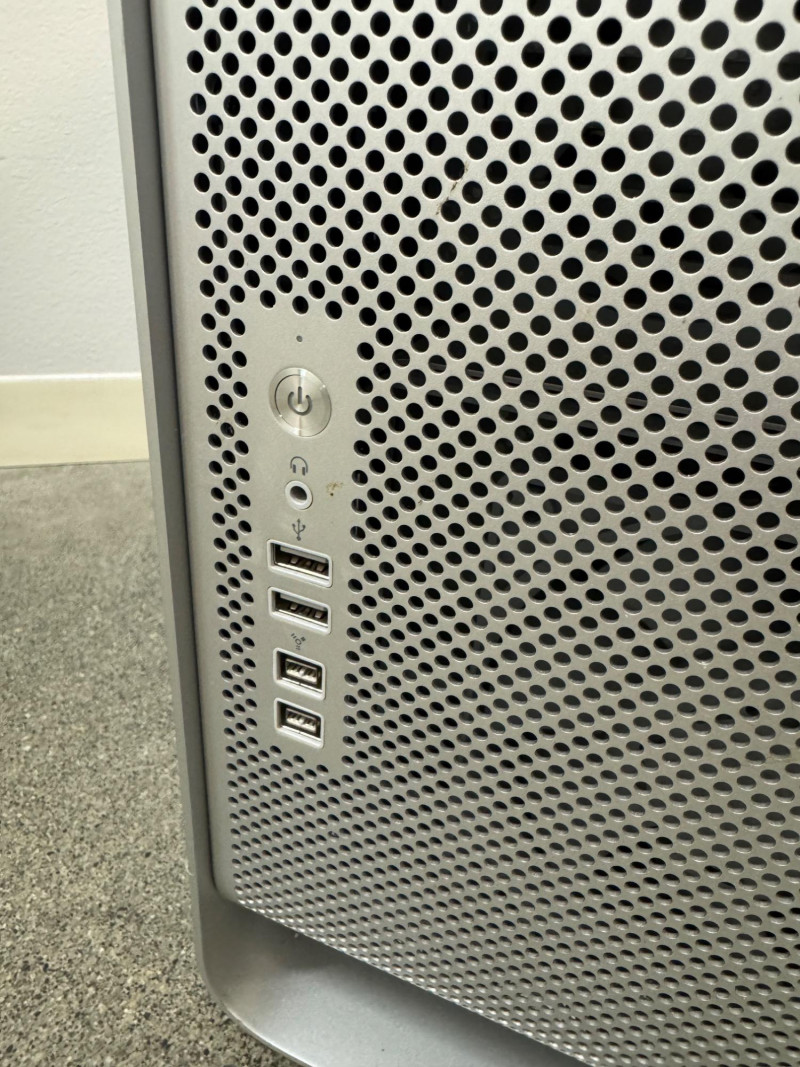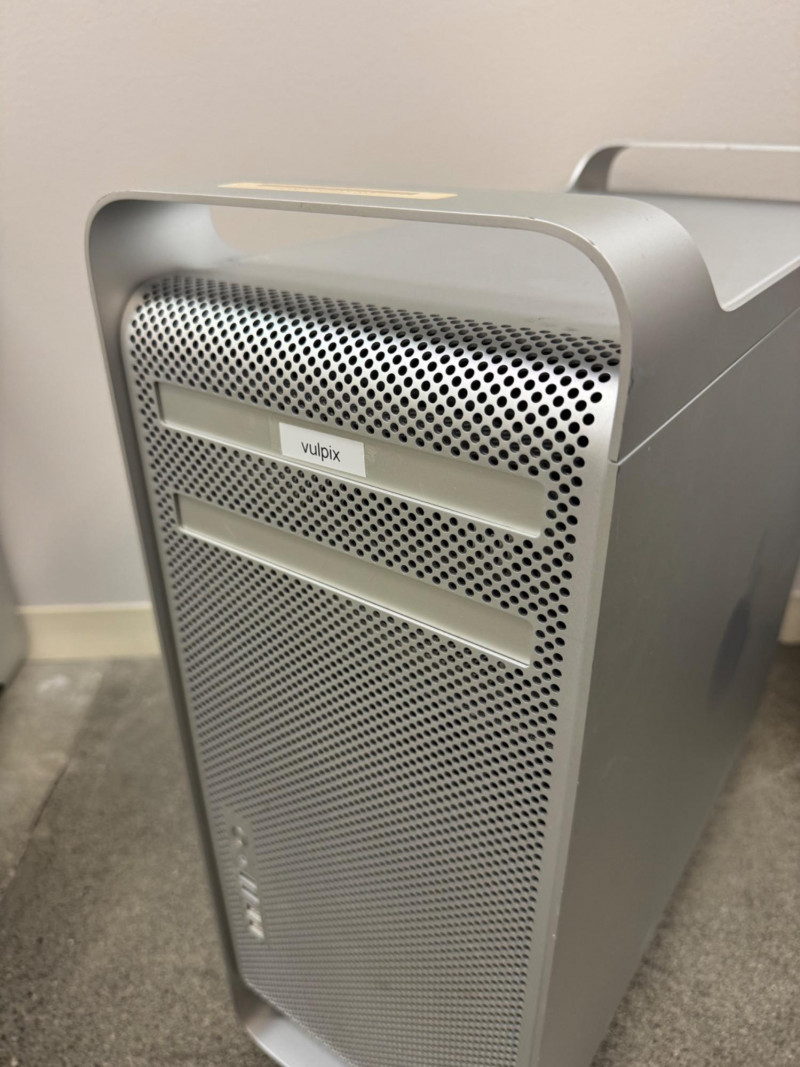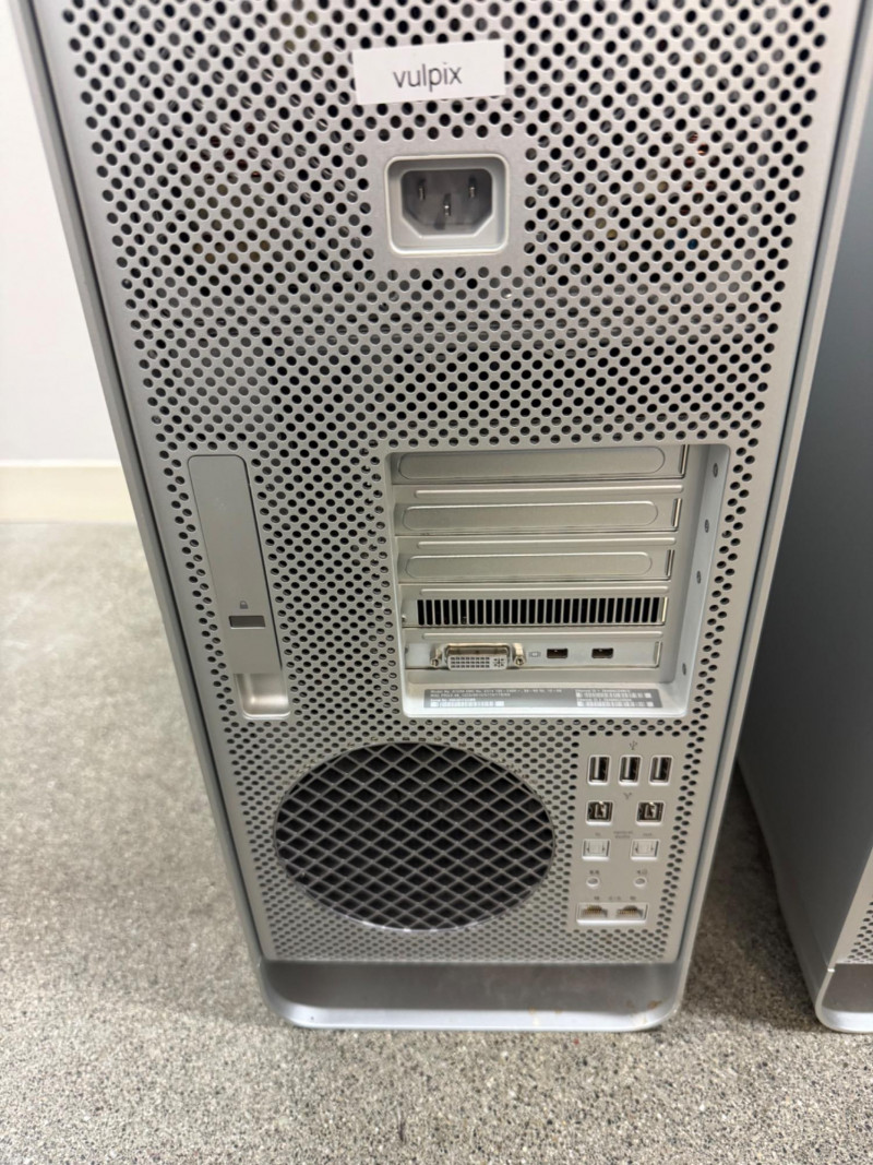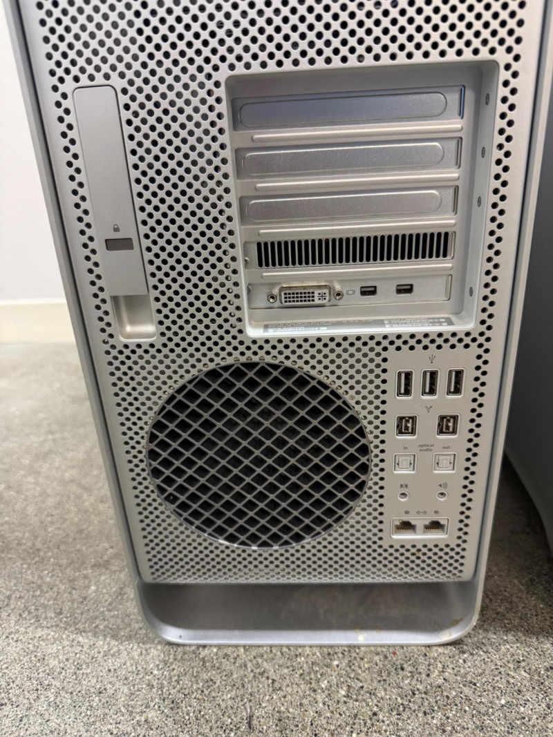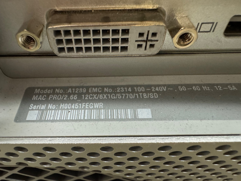 Apple Mac Pro 2.66 GHz 12-Core Xeon | H00451FEGWR – No HDD/Storage. Specifications: Model Identifier:MacPro5,1 Model Number:A1289 Serial No.:H00451FEGWR Processor:Two 2.66 GHz 6-Core Intel Xeon (12 cores total) USB Ports:5 × USB 2.0 (2 front, 3 back) Dimensions:20″ Tall × 19″ Deep × 8″ Wide Condition note: No hard drives or other storage devices are installed – buyer must provide their own. Any labels or asset stickers visible in photos can be removed.