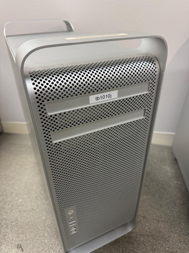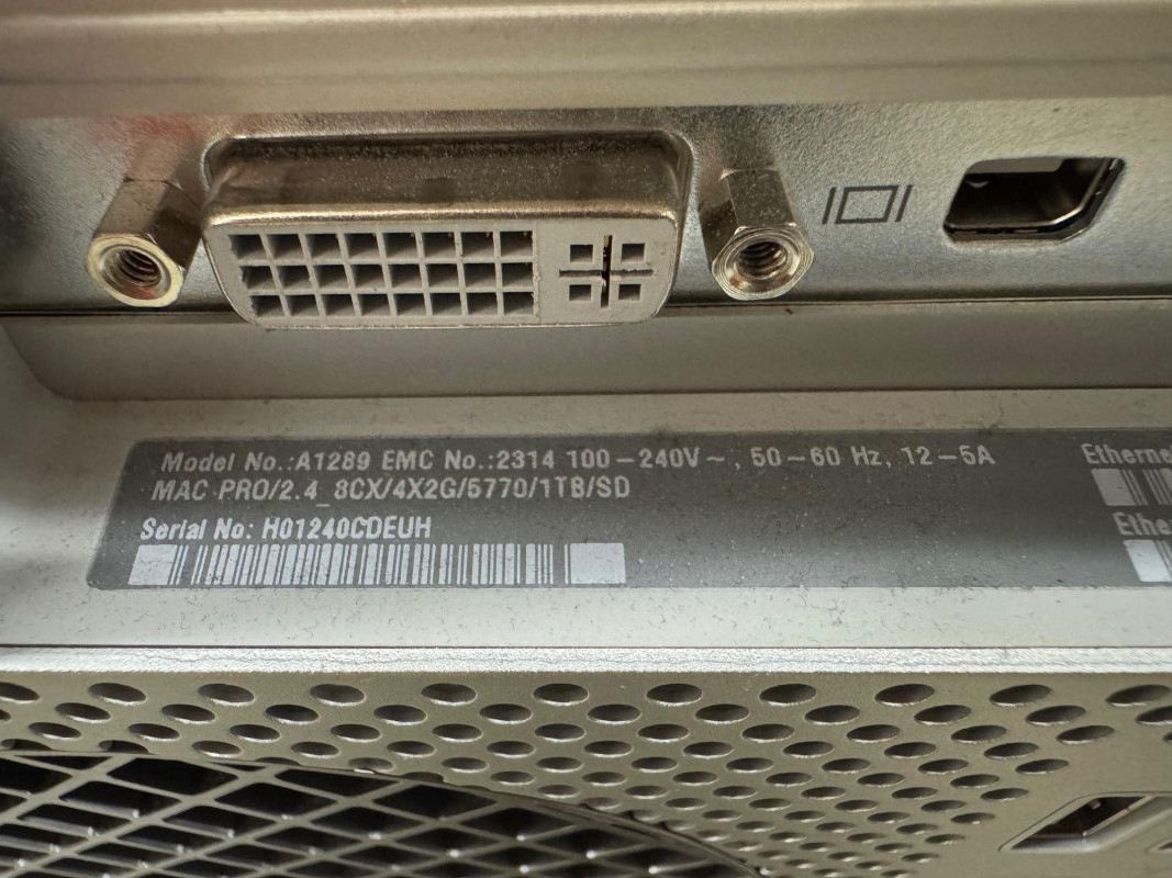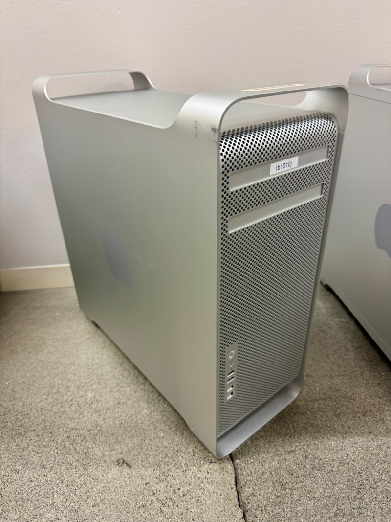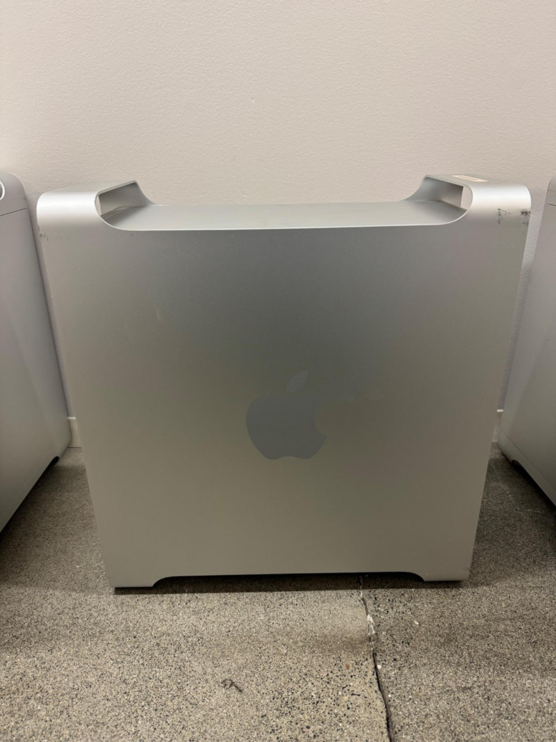 Mac Pro 2.4 GHz 8-Core Xeon | Serial No. H01240CDEUH – No HDD/Storage. Specifications: Model Identifier:MacPro5,1 Model Number:A1289 Serial No.:H01240CDEUH Processor:Two 2.4 GHz Quad-Core Intel Xeon (8 cores total) USB Ports:5 × USB 2.0 (2 front, 3 back) Dimensions:20″ Tall × 19″ Deep × 8″ Wide Condition note: No hard drives or other storage devices are installed – buyer must provide their own. Any stickers or asset labels shown in the photos can be removed.