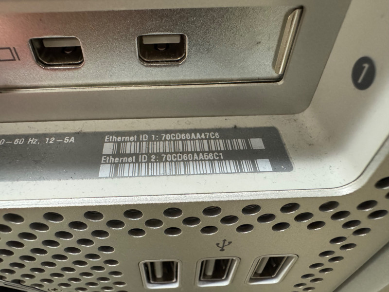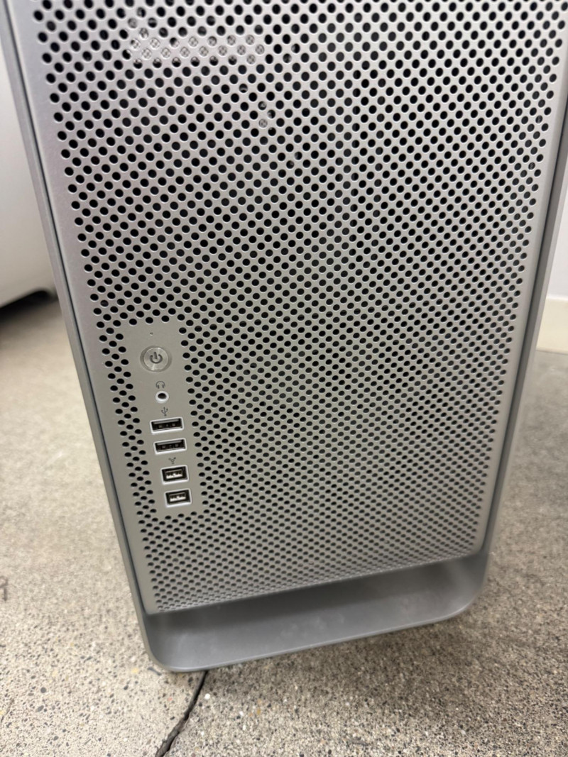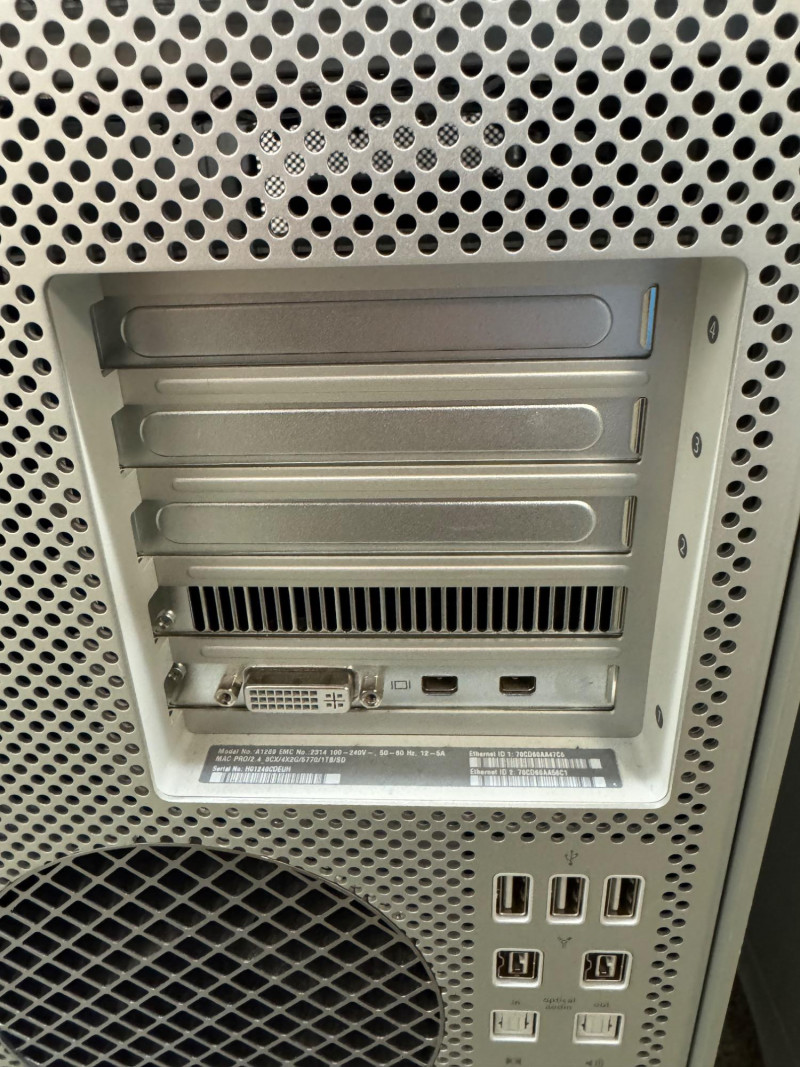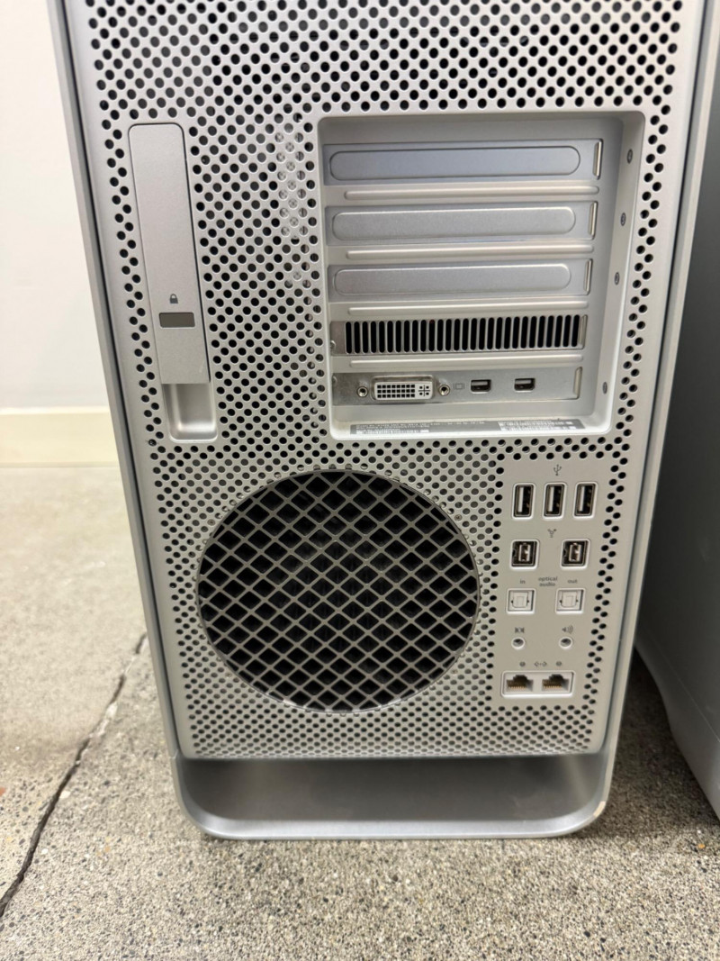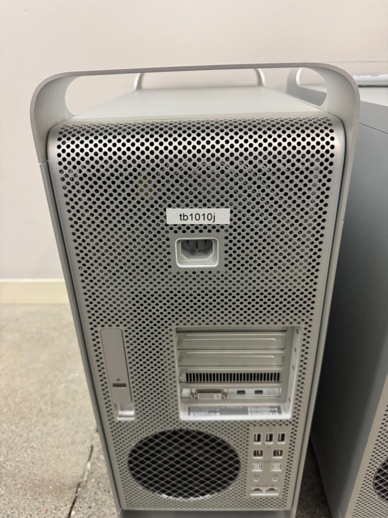 Mac Pro 2.4 GHz 8-Core Xeon | Serial No. H01240CDEUH – No HDD/Storage. Specifications: Model Identifier:MacPro5,1 Model Number:A1289 Serial No.:H01240CDEUH Processor:Two 2.4 GHz Quad-Core Intel Xeon (8 cores total) USB Ports:5 × USB 2.0 (2 front, 3 back) Dimensions:20″ Tall × 19″ Deep × 8″ Wide Condition note: No hard drives or other storage devices are installed – buyer must provide their own. Any stickers or asset labels shown in the photos can be removed.