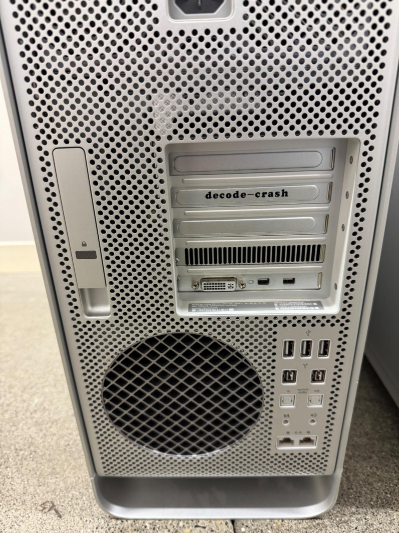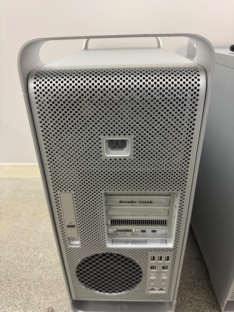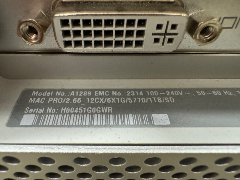 Apple Mac Pro 2.66 GHz 12-Core Xeon | H00451G0GWR – No HDD/Storage. Specifications: Model Identifier:MacPro5,1 Model Number:A1289 Serial No.:H00451G0GWR Processor:Two 2.66 GHz 6-Core Intel Xeon (12 cores total) USB Ports:5 × USB 2.0 (2 front, 3 back) Dimensions:20″ Tall × 19″ Deep × 8″ Wide Condition note: No hard drives or other storage devices are installed – buyer will need to supply their own. Any stickers or asset labels shown in the photos can be removed.