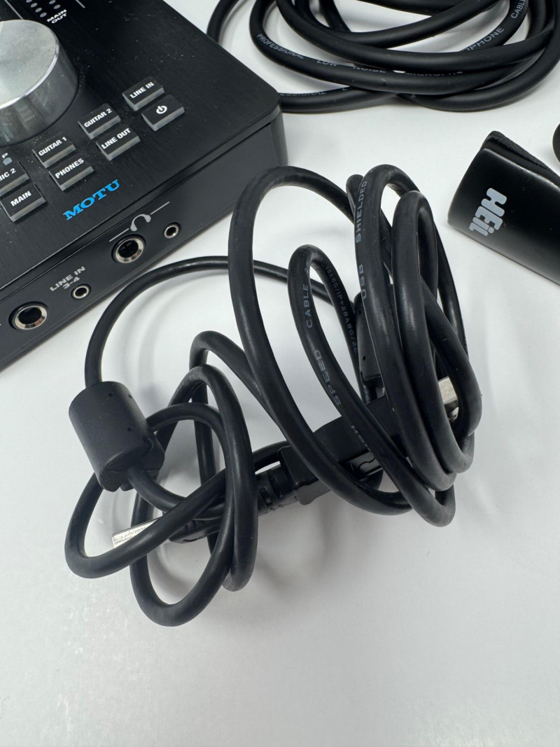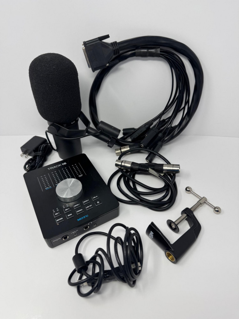 Shure SM7B Broadcast Mic + MOTU Track16 USB Interface & Cables. Included Shure SM7B dynamic broadcast microphone w/ foam windscreen Heil-style desk-mount clamp MOTU Track16 USB audio interface + power adapter DB-25 → XLR breakout cable XLR mic cable, USB cable & assorted patch leads (as pictured) Note: Only the items shown in photos are guaranteed included
