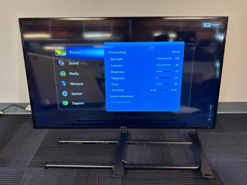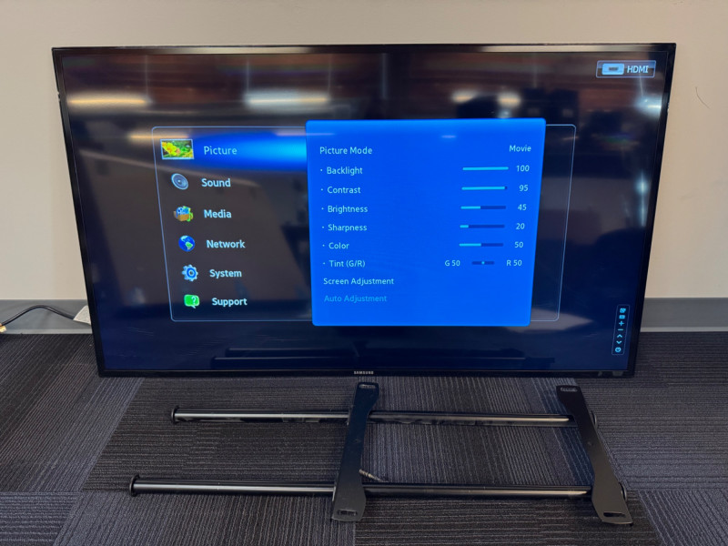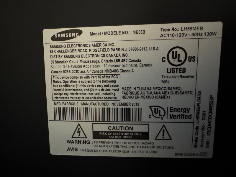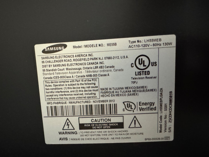 Samsung ME55B 55″ Commercial Display (LH55MEB) w/ Floor Stand #2. No Remote/Stand (Was previously wall mounted for commercial use) Features: Model: ME55B Type No.: LH55MEB Power: AC 110–120 V ⎓ 60 Hz, 130 W Inputs: HDMI, Composite AV, Audio Out, Coax RF, Ethernet (RJ-45) UL-listed commercial television receiver Manufactured November 2012 Condition Disclaimer: No remote control Minor surface wear consistent with light office use Sold “as-is” – powers on and displays menu (see photos)