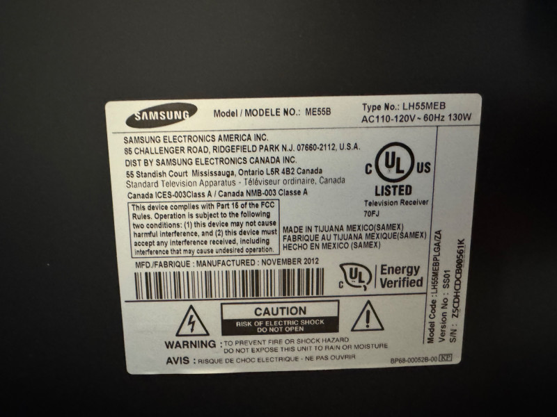 Samsung ME55B 55″ Commercial Display (LH55MEB) #3. No Remote/Stand (Was previously wall mounted for commercial use) Features: Model: ME55B Type No.: LH55MEB Power: AC 110–120 V ⎓ 60 Hz, 130 W Inputs: HDMI, Composite AV, Audio Out, Coax RF, Ethernet (RJ-45) UL-listed commercial television receiver Manufactured November 2012 Condition Disclaimer: No remote control or stand included Minor surface wear consistent with light office use Sold “as-is” – powers on and displays menu (see photos)
