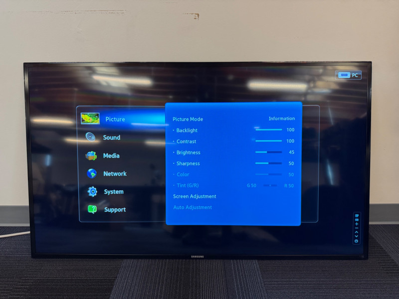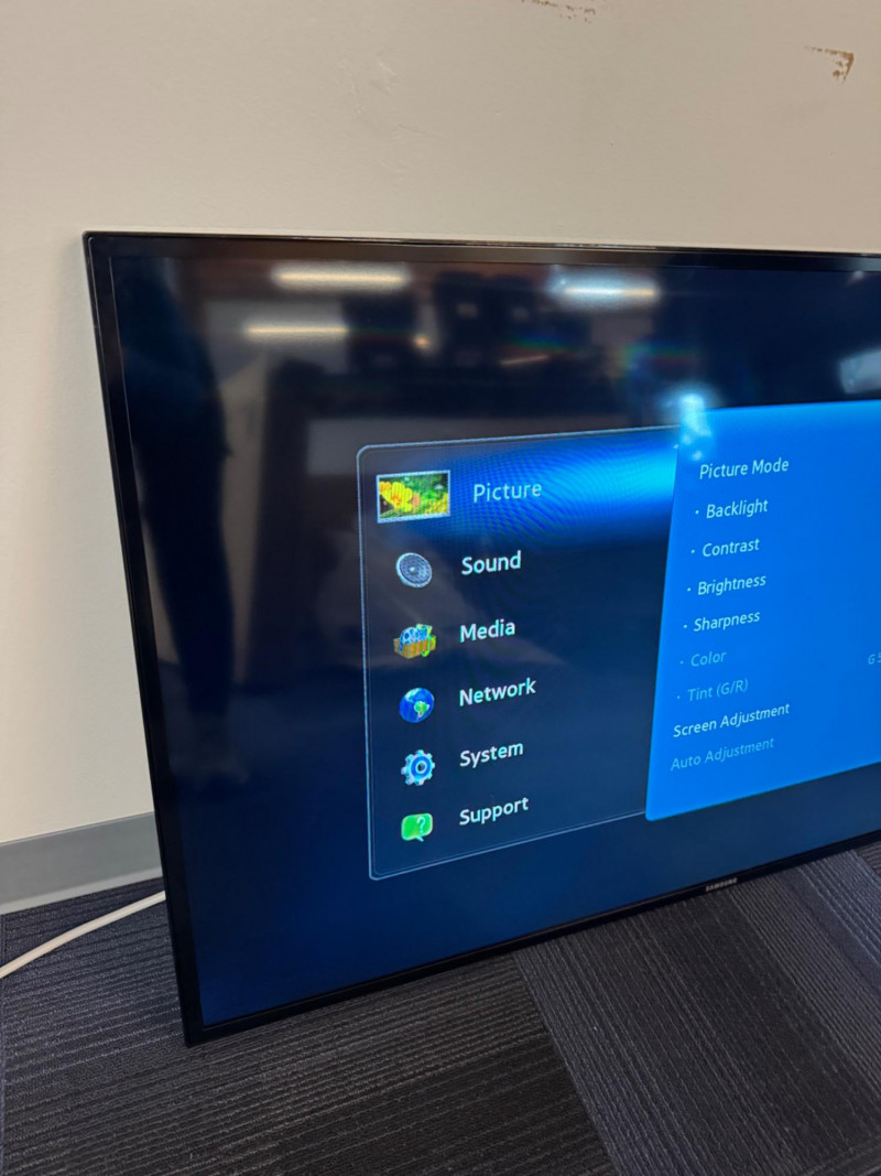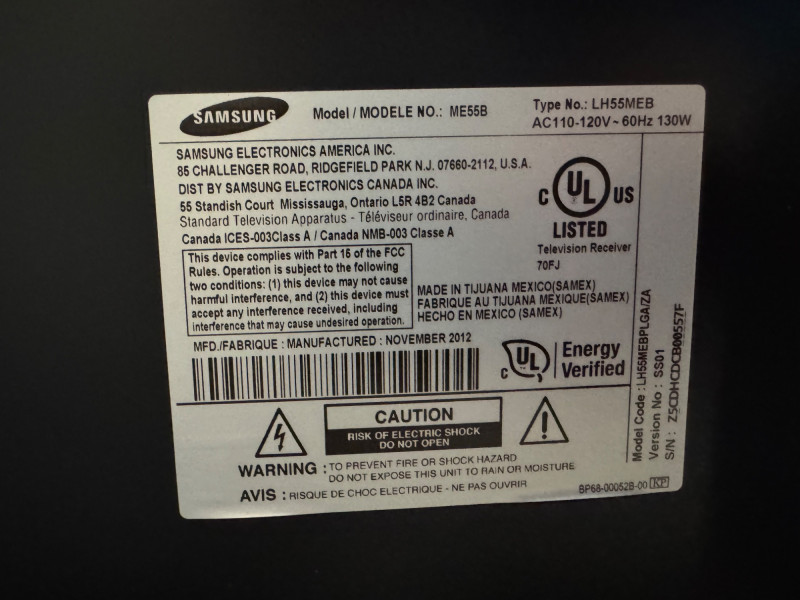 Samsung ME55B 55″ Commercial Display (LH55MEB) #4. No Remote/Stand (Was previously wall mounted for commercial use) Features: Model: ME55B Type No.: LH55MEB Power: AC 110–120 V ⎓ 60 Hz, 130 W Inputs: HDMI, Composite AV, Audio Out, Coax RF, Ethernet (RJ-45) UL-listed commercial television receiver Manufactured November 2012 Condition Disclaimer: No remote control or stand included Minor surface wear consistent with light office use Sold “as-is” – powers on and displays menu (see photos)