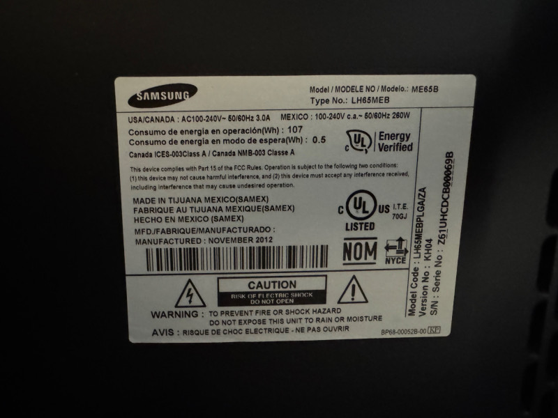 Samsung 65” Commercial LED Display ME65B (LH65MEB) No Remote/Stand (Was previously wall mounted for commercial use) Model Number:ME65B Type No.:LH65MEB Serial No.:ZSHDCB5052P Display Size:65″ Inputs:HDMI, Composite Video, Audio Out, Ethernet Power:AC 110–120 V ∼ 60 Hz 260 W Manufactured:November 2012 Condition Note: No remote or stand included; minor surface wear; sold as-is.