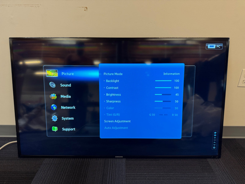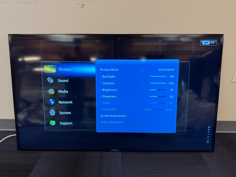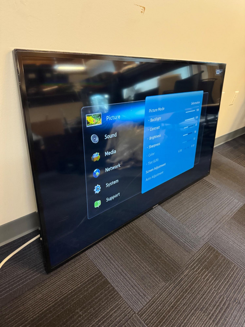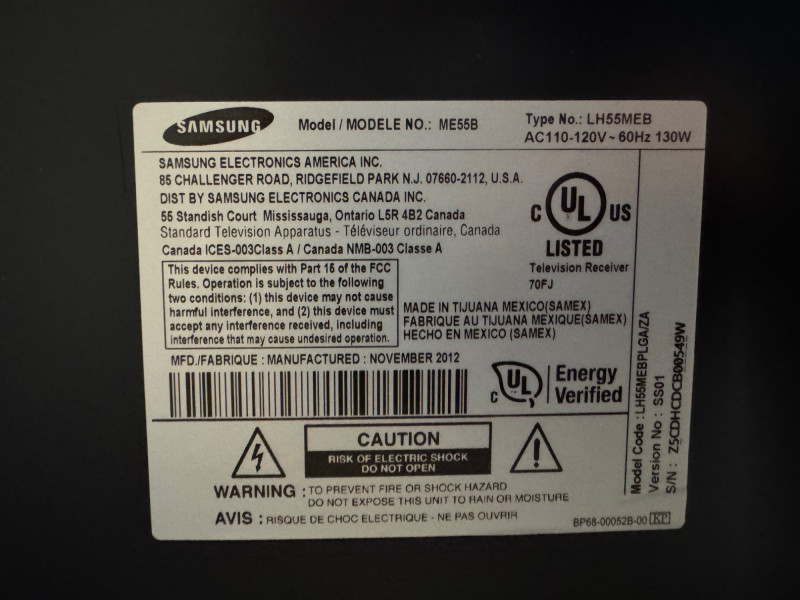 Samsung ME55B 55″ Commercial Display (LH55MEB) #7. No Remote/Stand (Was previously wall mounted for commercial use) Features: Model: ME55B Type No.: LH55MEB Power: AC 110–120 V ⎓ 60 Hz, 130 W Inputs: HDMI, Composite AV, Audio Out, Coax RF, Ethernet (RJ-45) UL-listed commercial television receiver Manufactured November 2012 Condition Disclaimer: No remote control or stand included Minor surface wear consistent with light office use Sold “as-is” – powers on and displays menu (see photos)