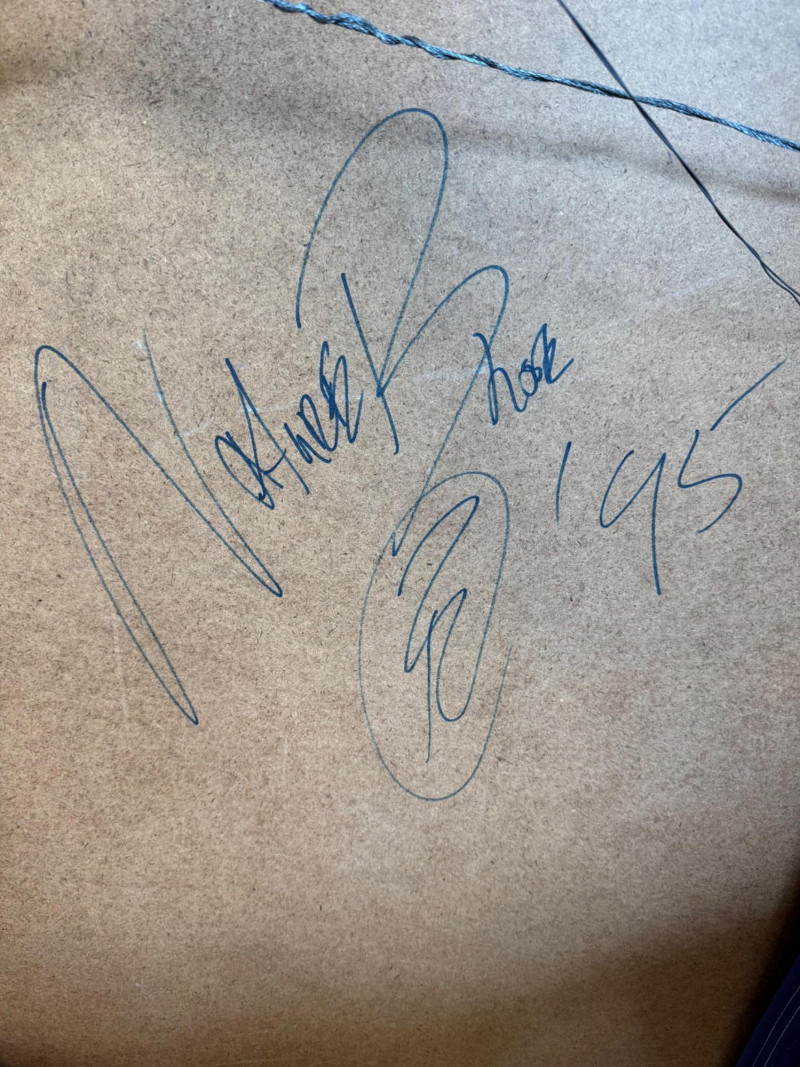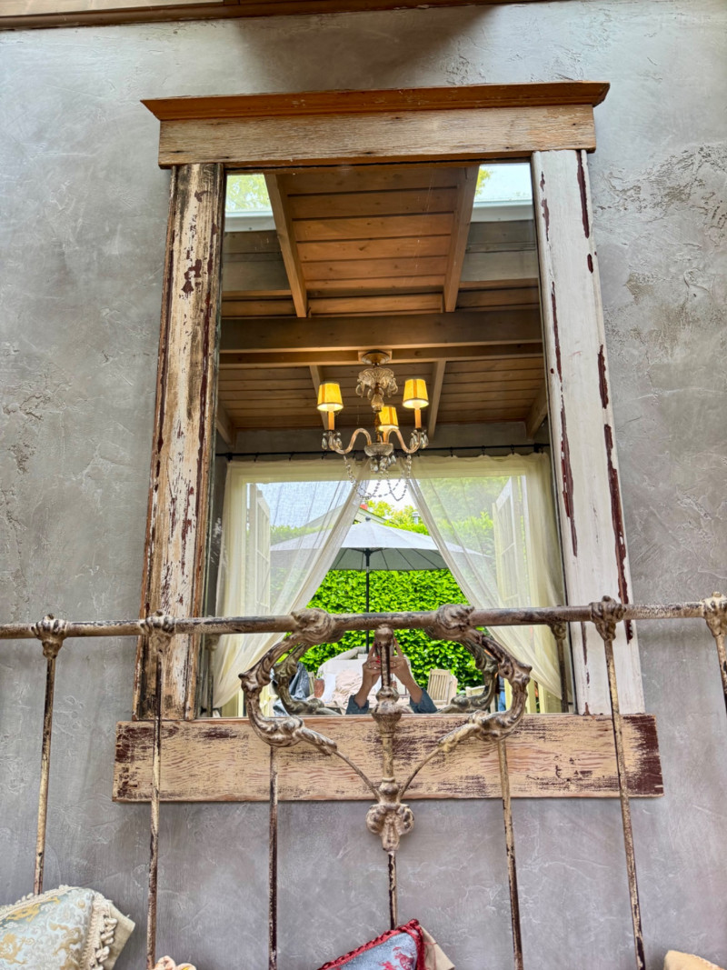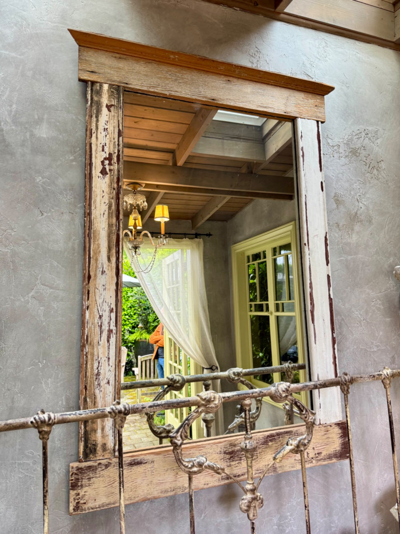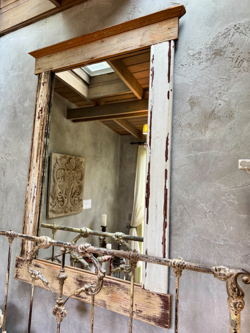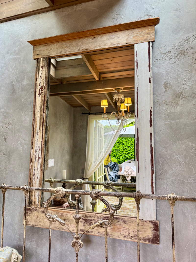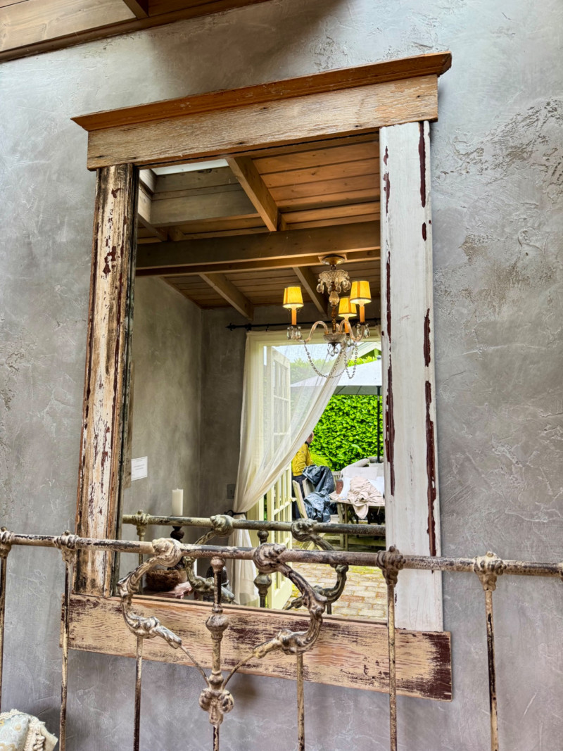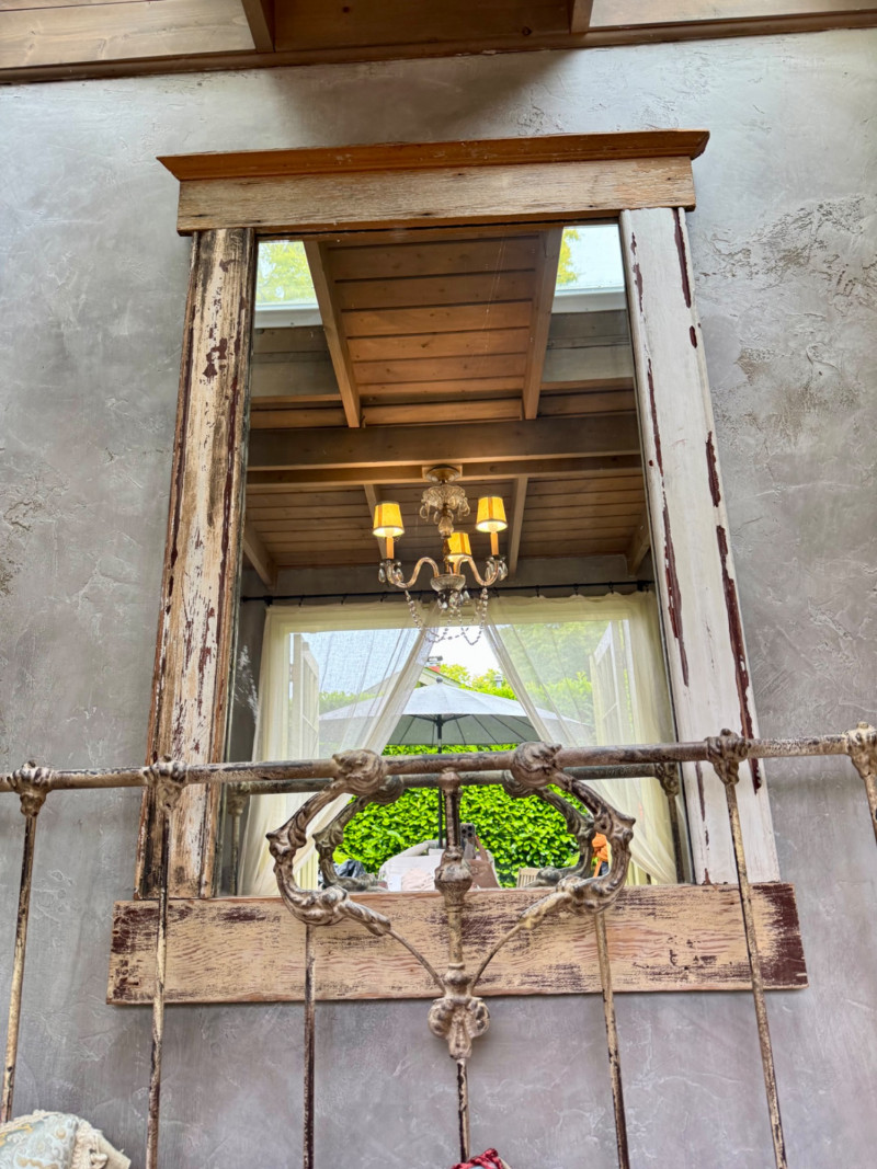 Large Distressed Wood Framed Mirror w/ Artist-Signed Back. 58” x 39” Disclaimer: