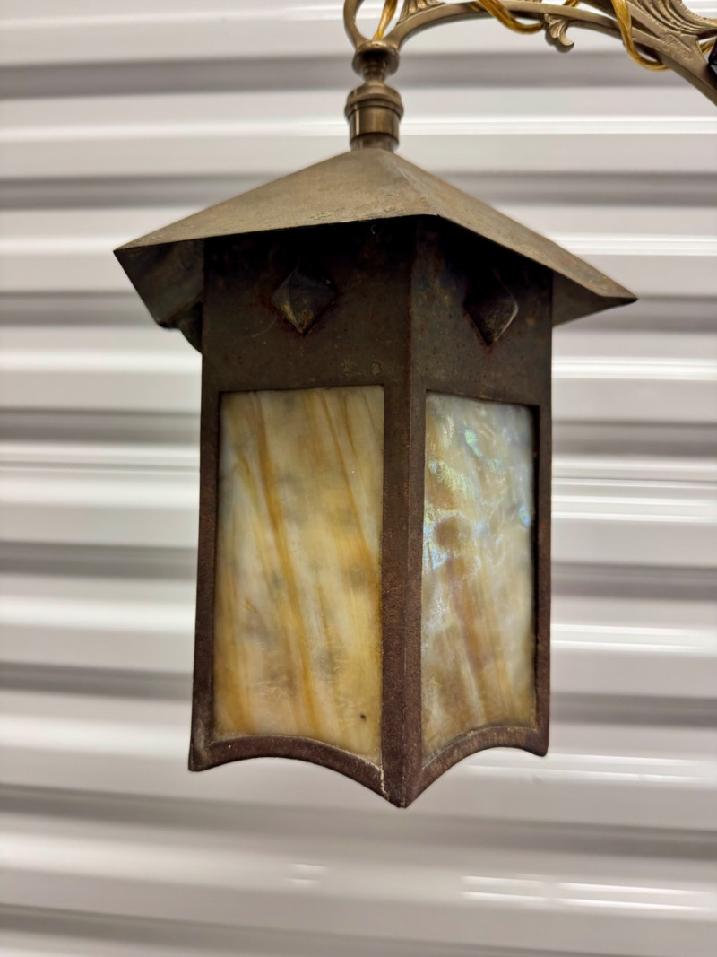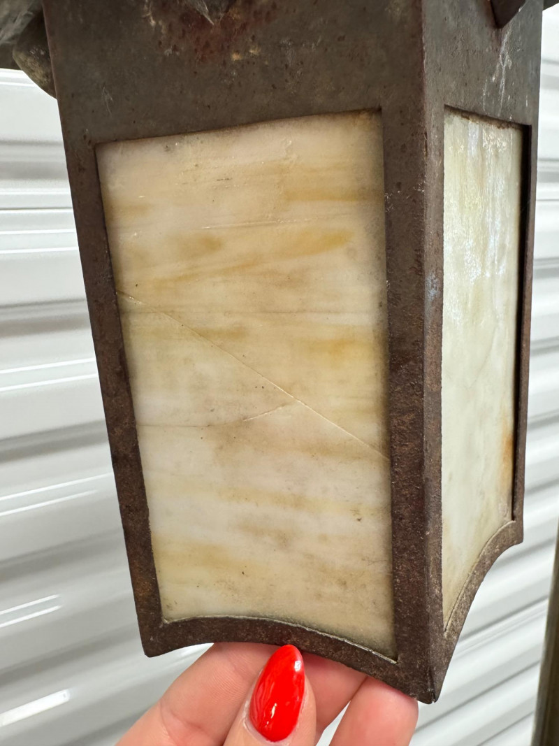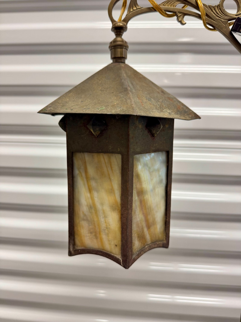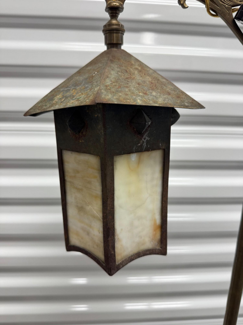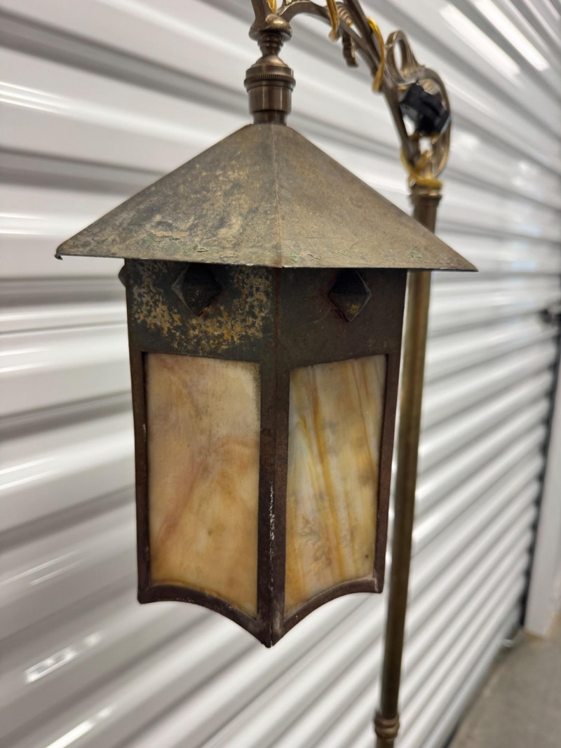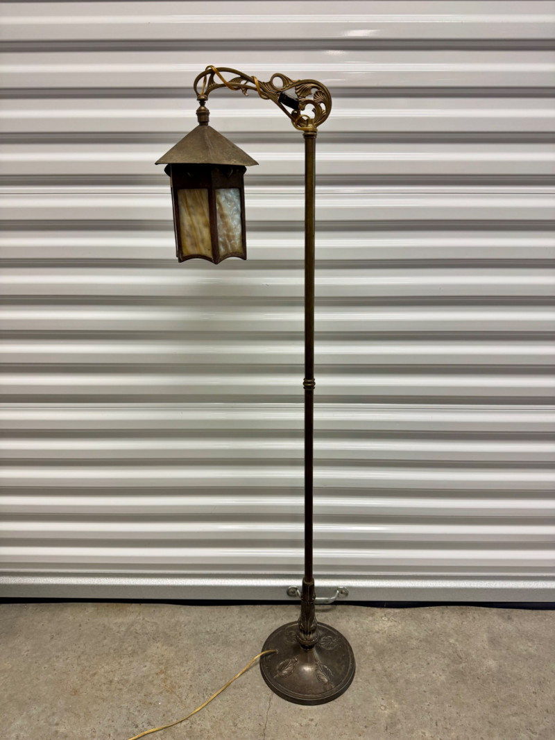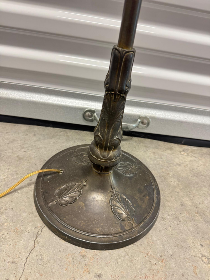 Antique Slag Glass Floor Lamp – 52″ Tall w/ Ornate Metal Base. 52” Tall Condition: One glass panel has a minor crack (hardly noticeable); lamp is untested and requires bulb. PICK UP DETAILS
