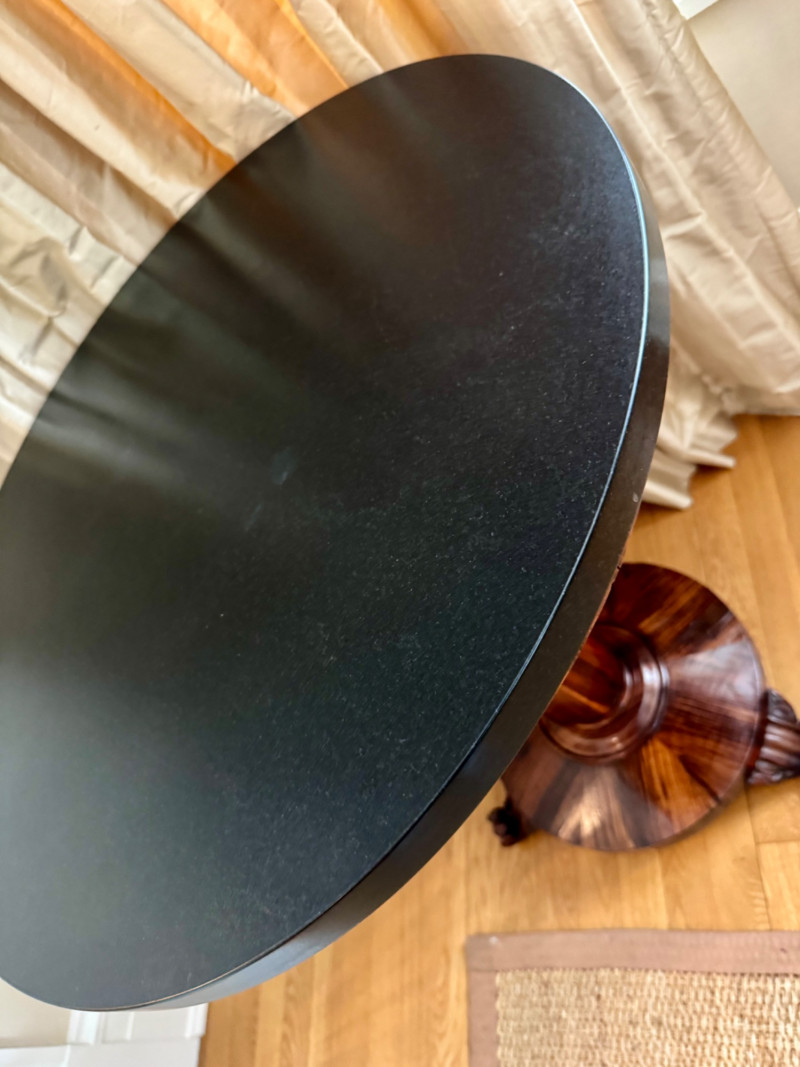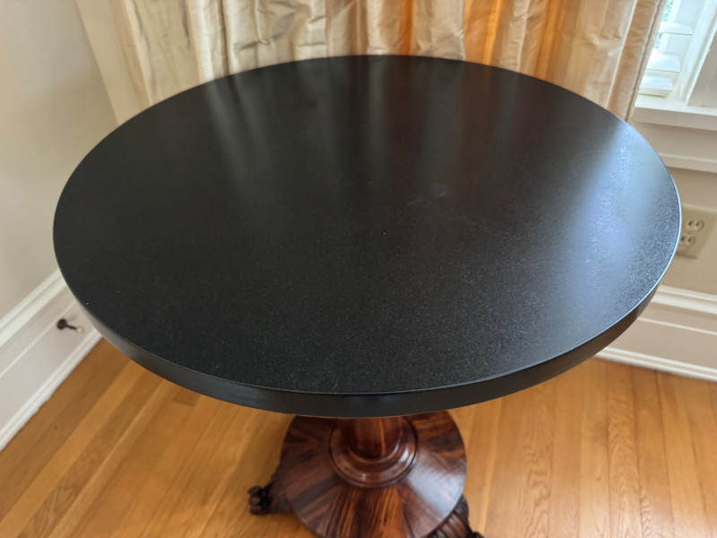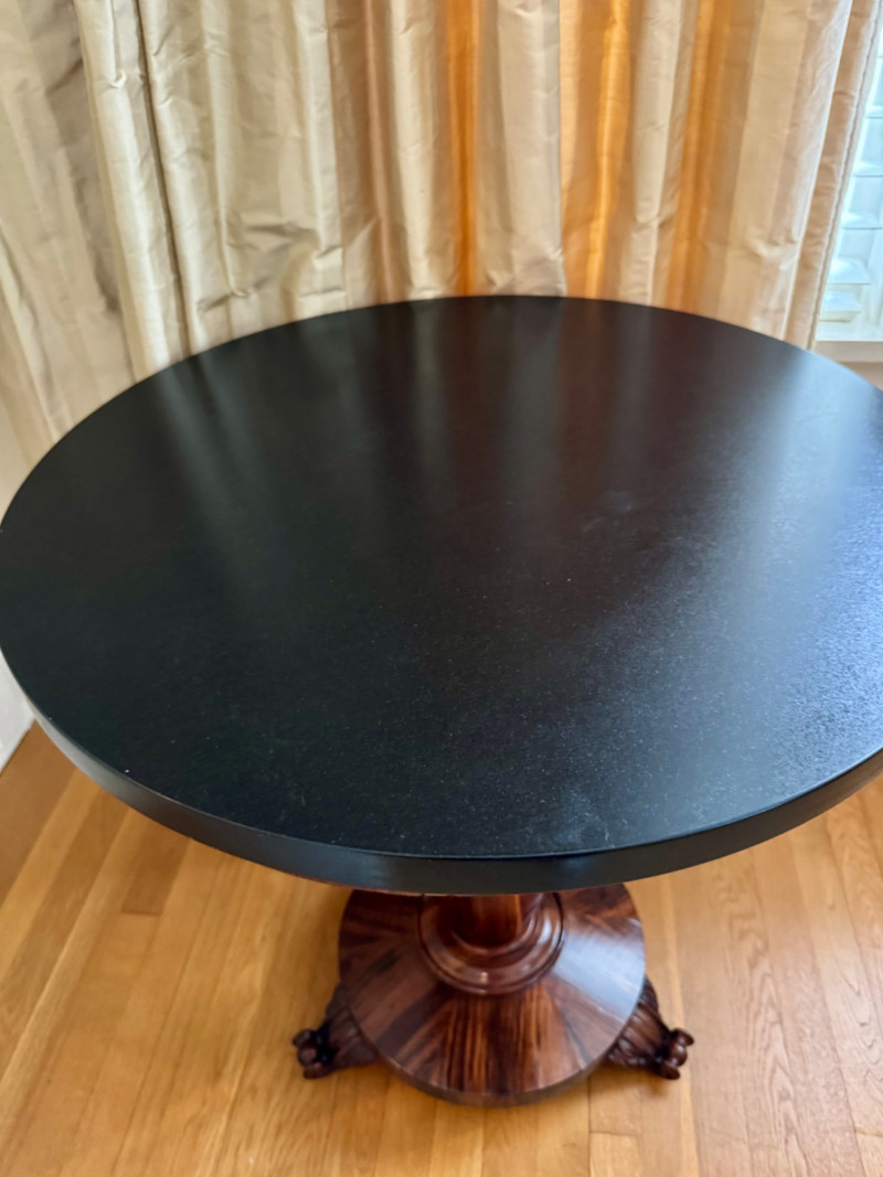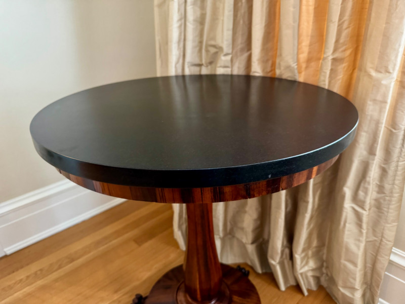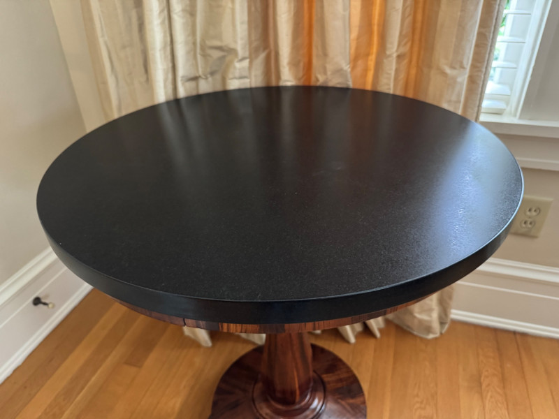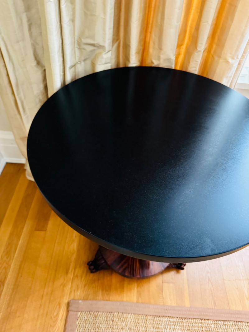 Heavy 26″ Round Stone-Top Pedestal Table on Solid Wood Base. Top: 26″ diameter heavy natural stone slab (removable for transport) Height: 29.5″ Tall PICK UP DETAILS