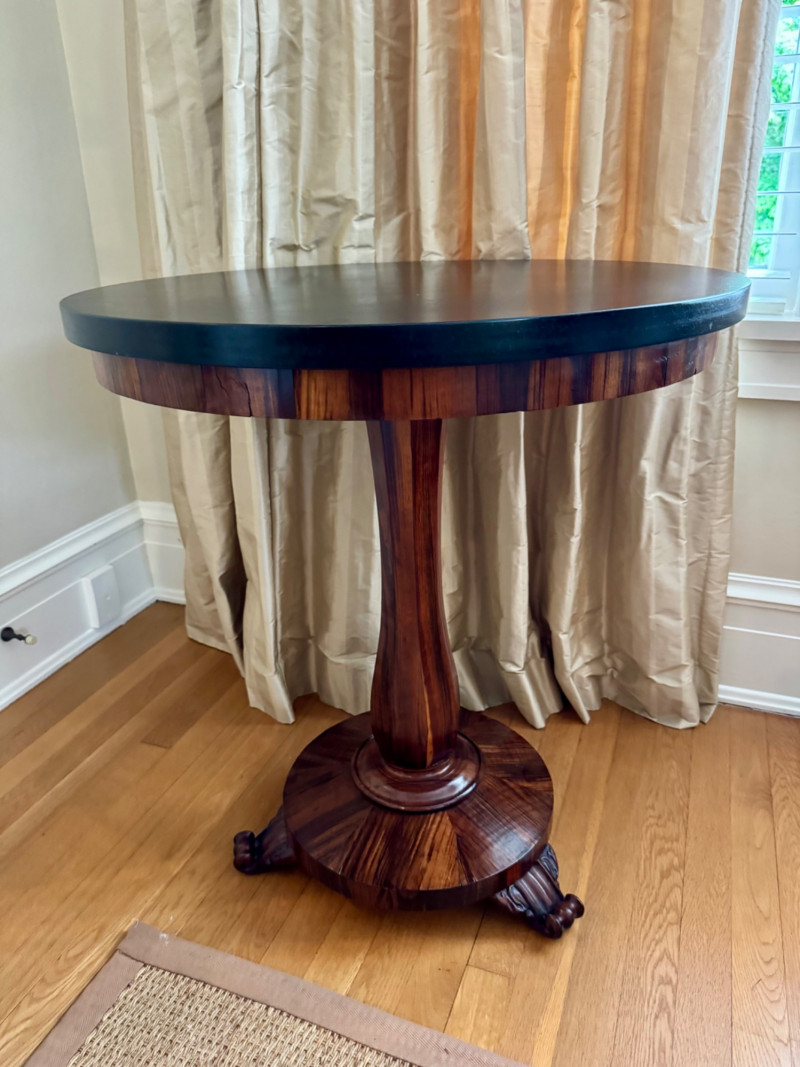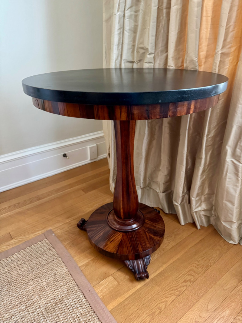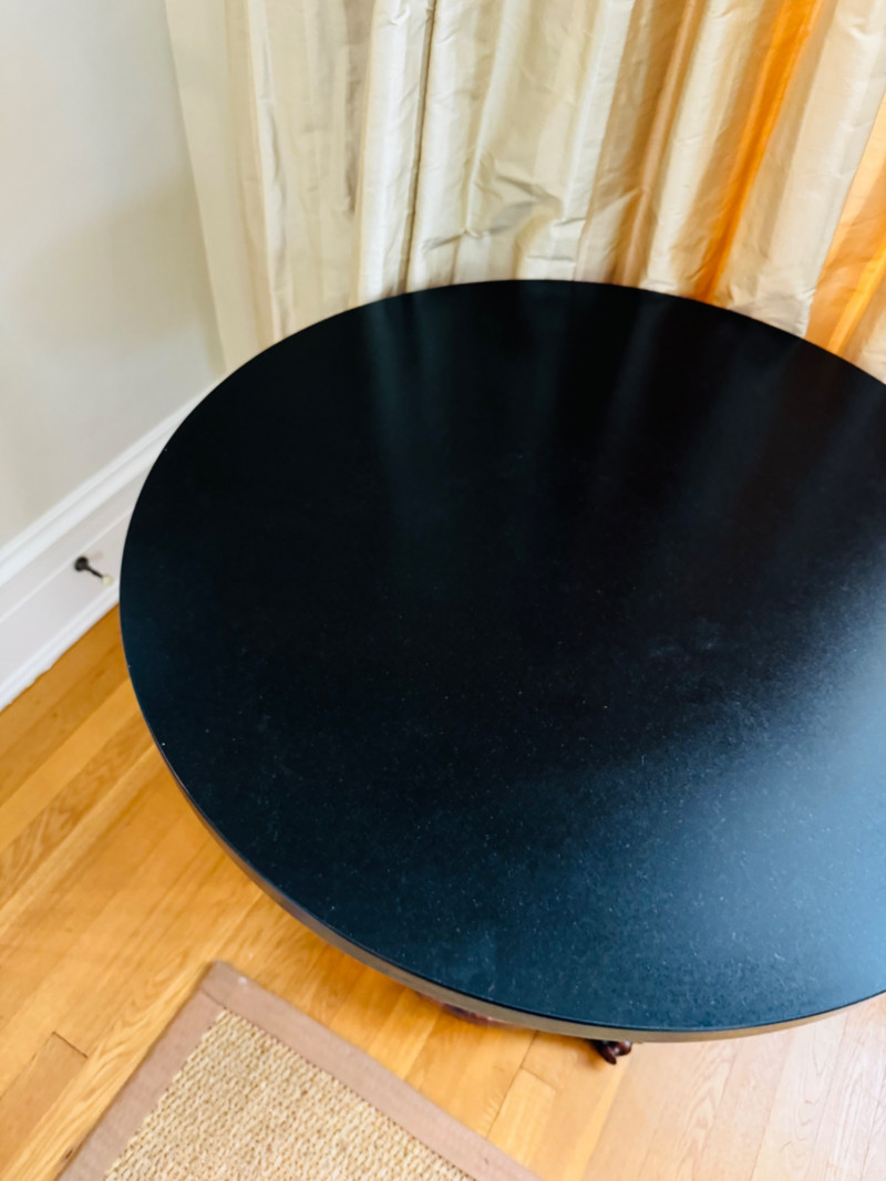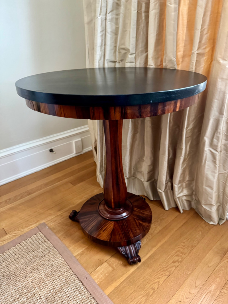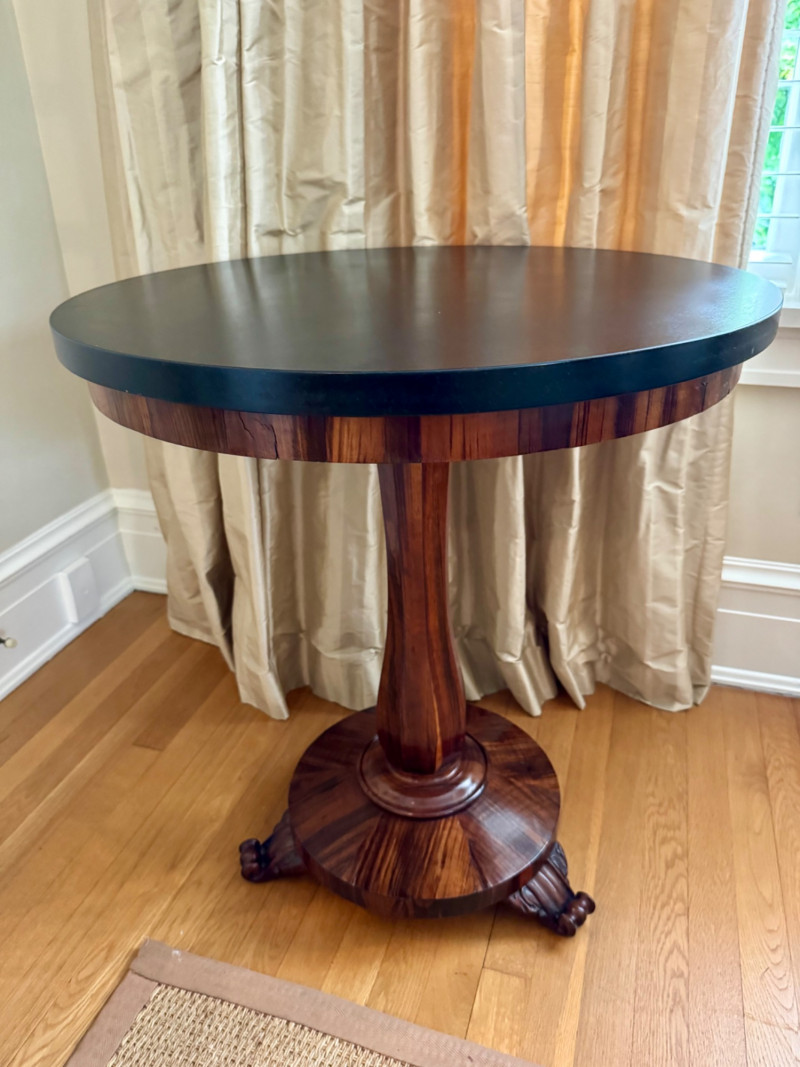 Heavy 26″ Round Stone-Top Pedestal Table on Solid Wood Base. Top: 26″ diameter heavy natural stone slab (removable for transport) Height: 29.5″ Tall PICK UP DETAILS