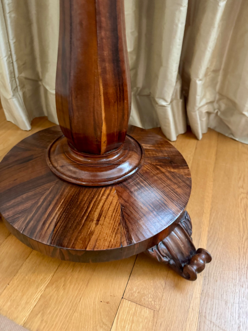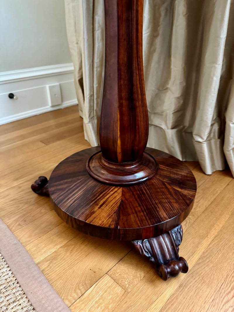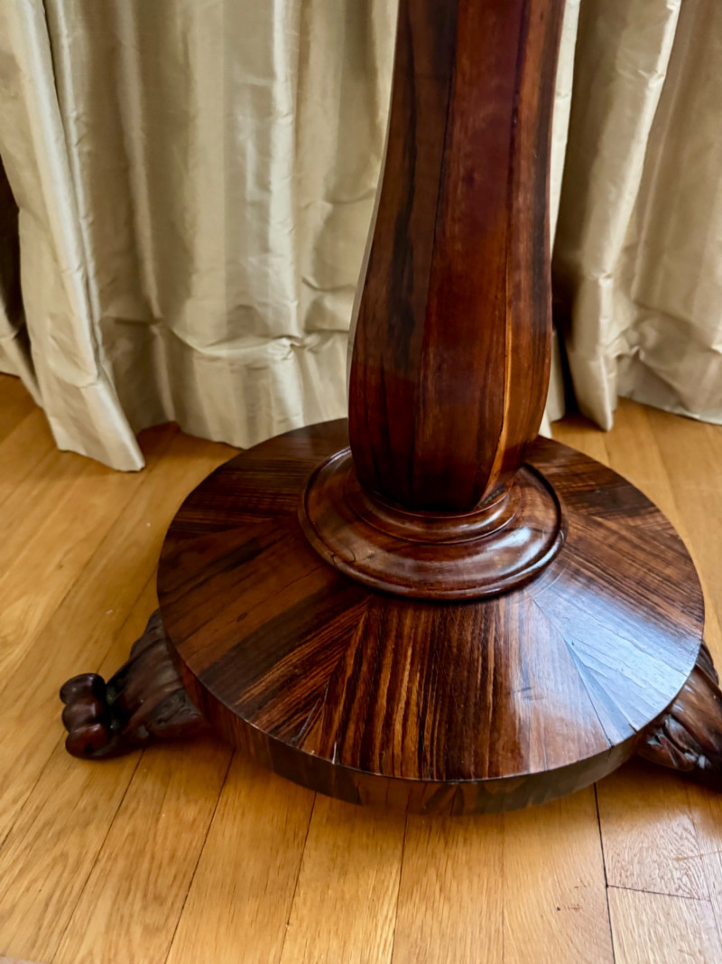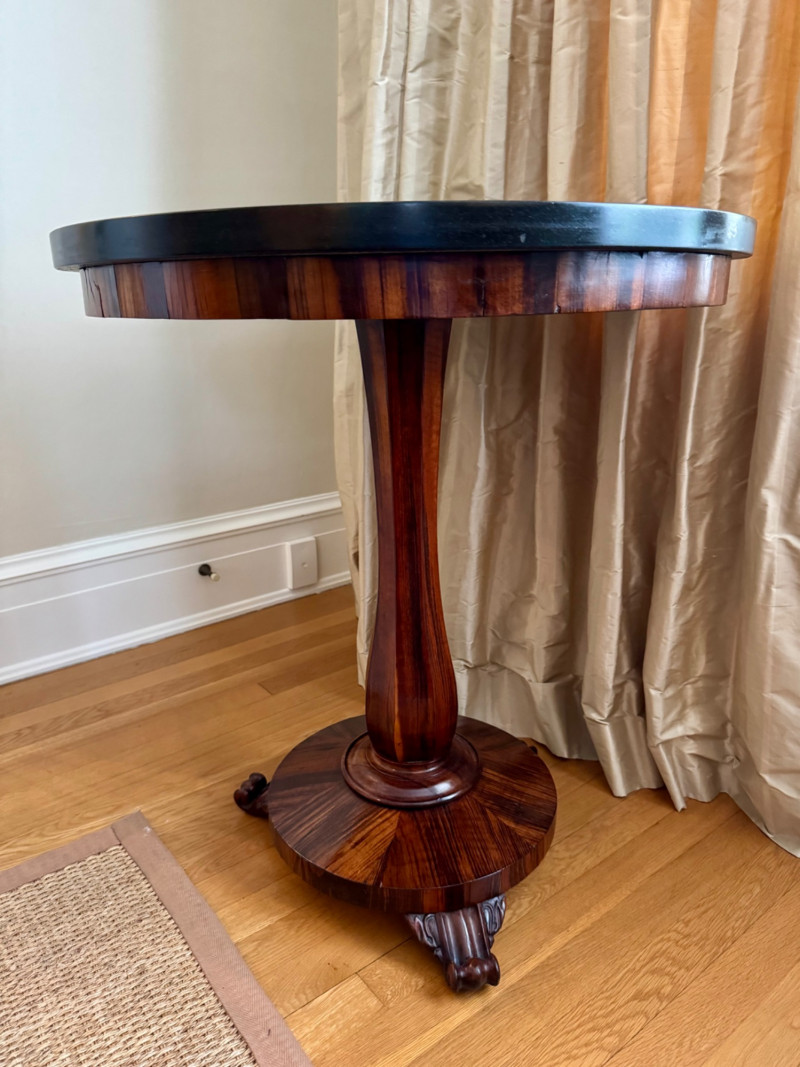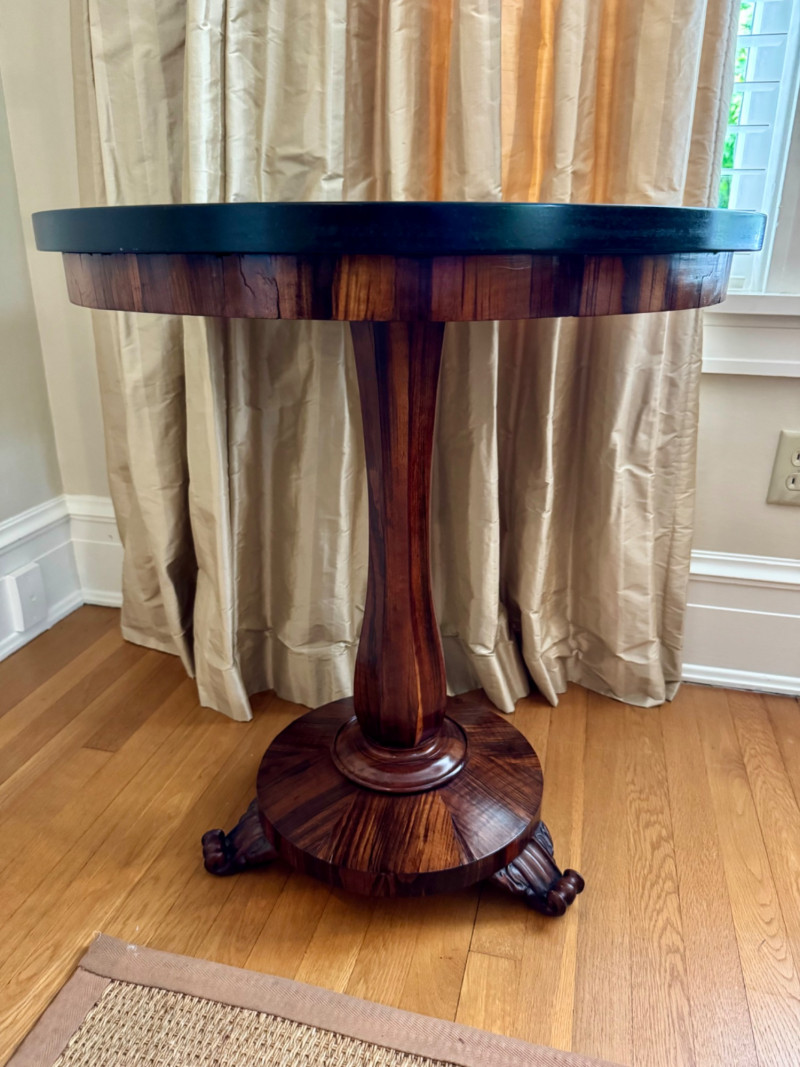 Heavy 26″ Round Stone-Top Pedestal Table on Solid Wood Base. Top: 26″ diameter heavy natural stone slab (removable for transport) Height: 29.5″ Tall PICK UP DETAILS