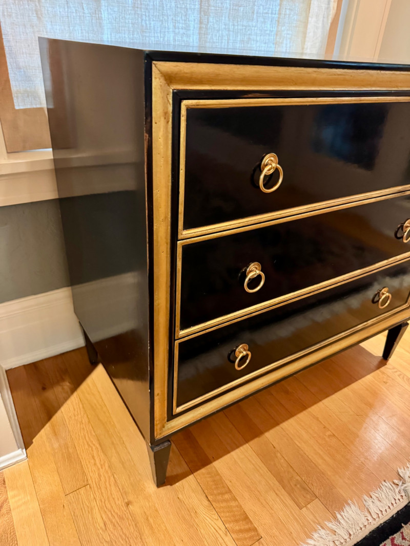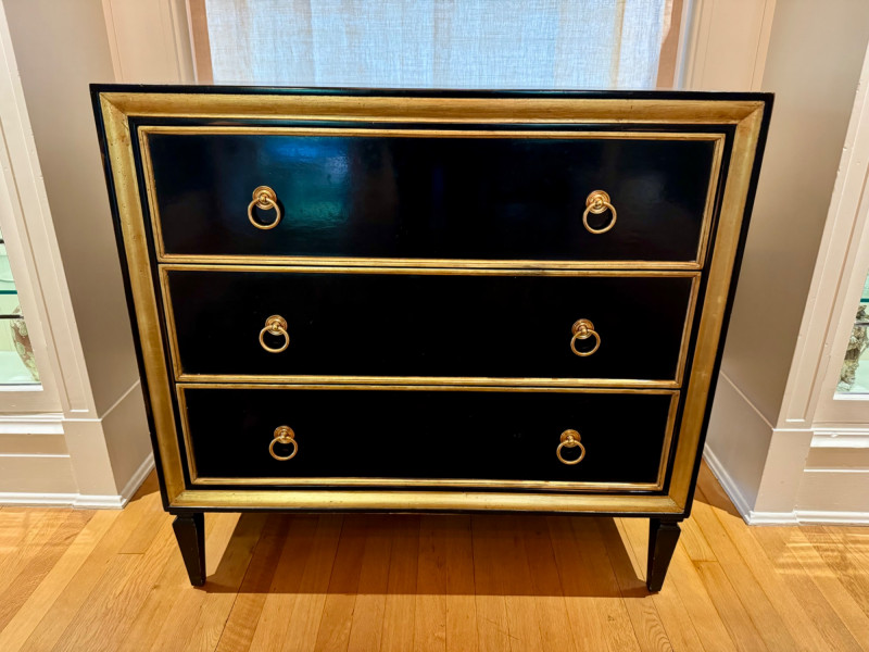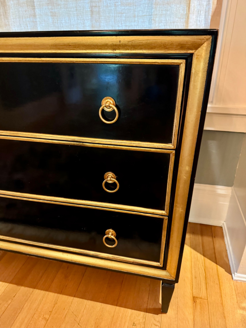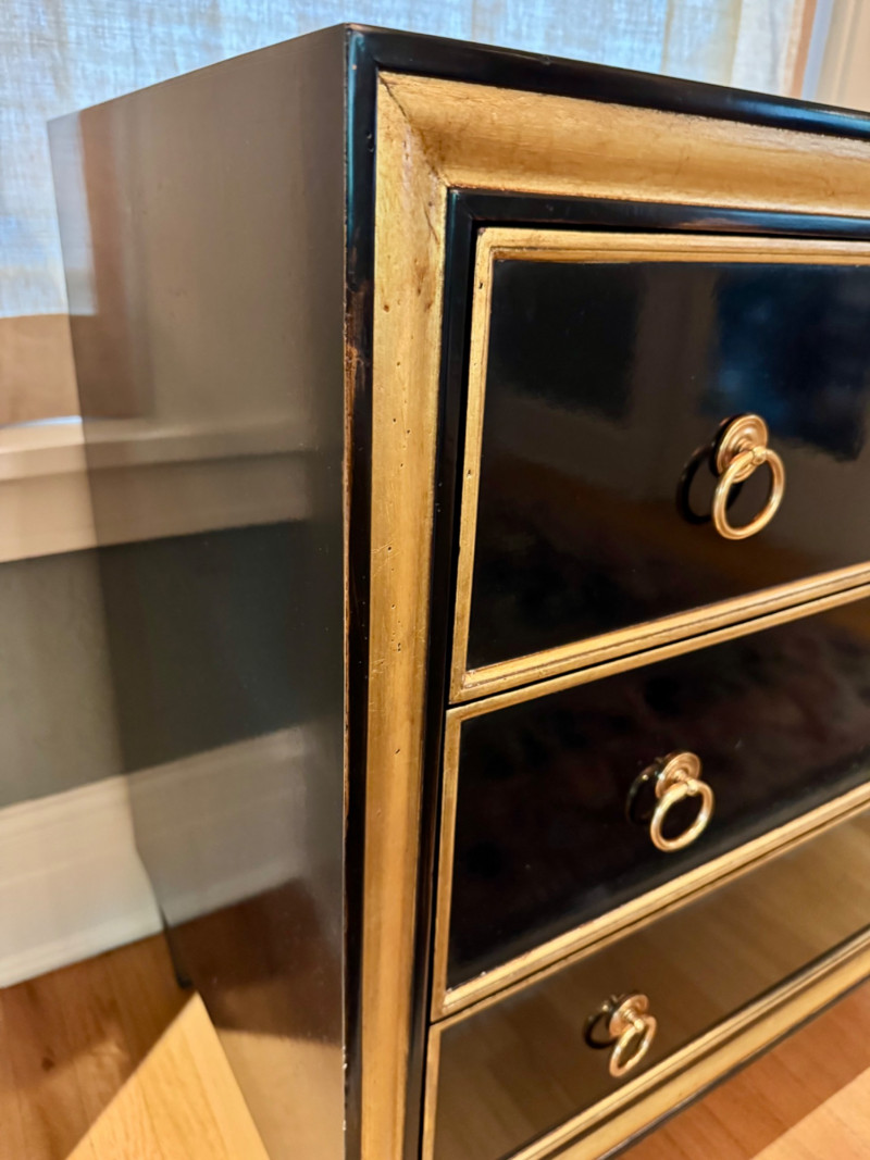 Black Lacquer Three-Drawer Chest w/ Gold Leaf Trim. Dimensions: 37″ Long × 21″ Deep × 36″ Tall Condition: PICK UP DETAILS