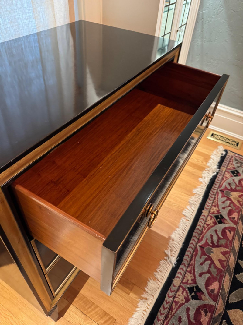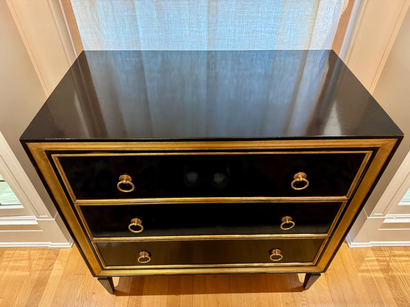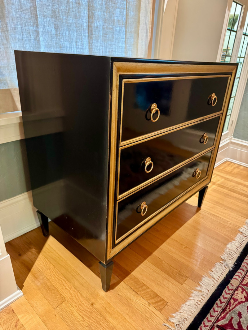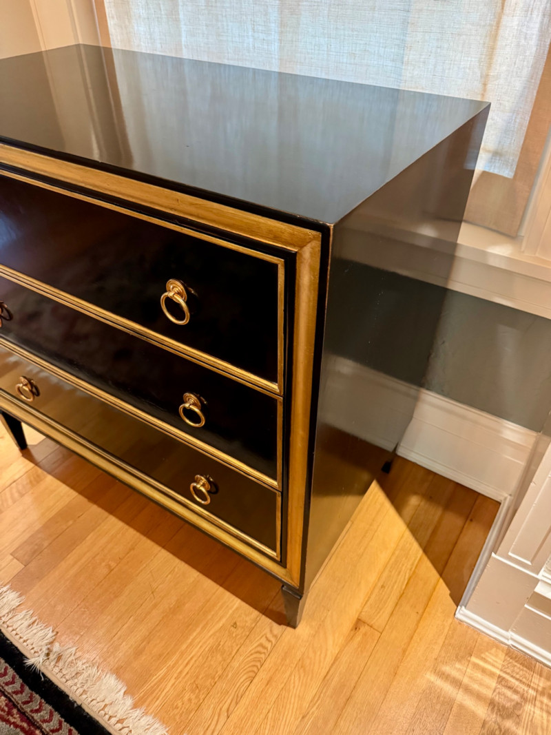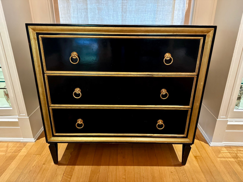 Black Lacquer Three-Drawer Chest w/ Gold Leaf Trim. Dimensions: 37″ Long × 21″ Deep × 36″ Tall Condition: PICK UP DETAILS