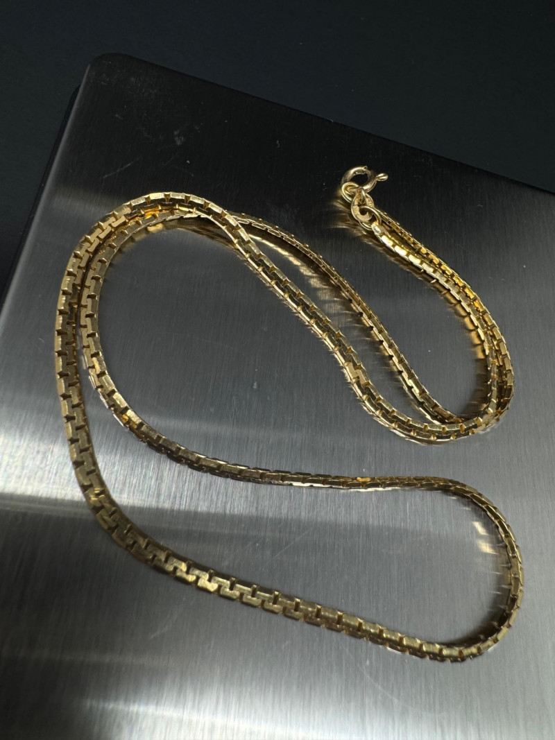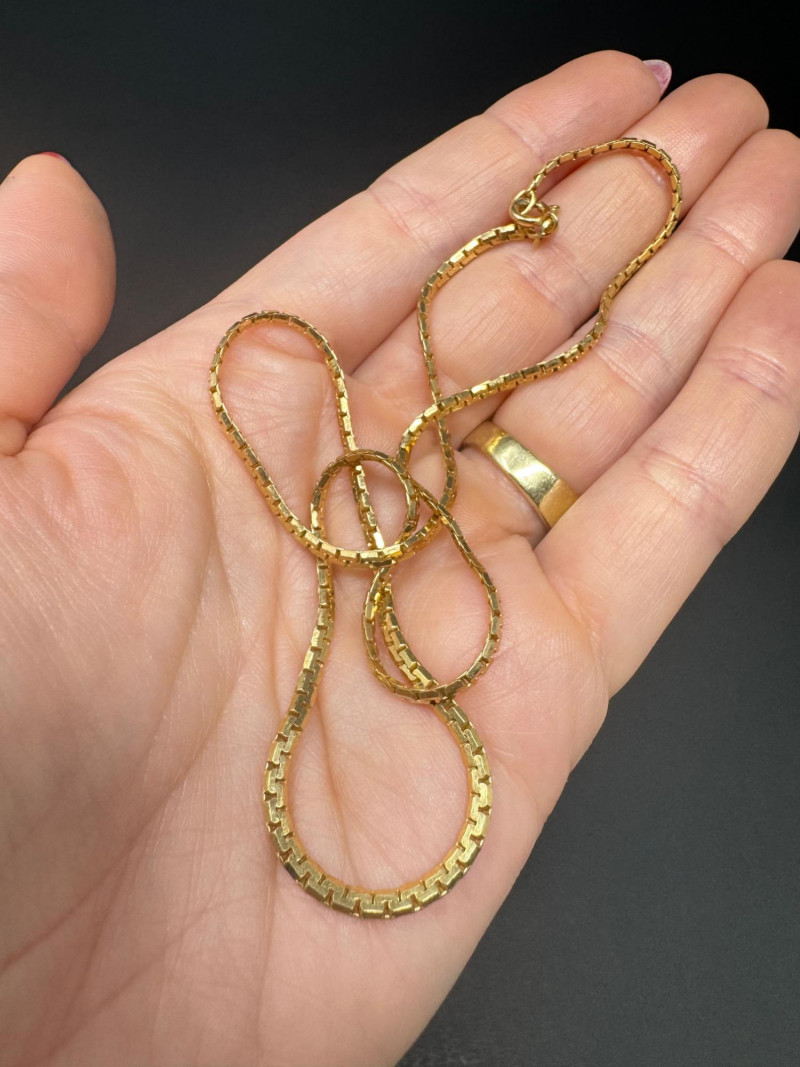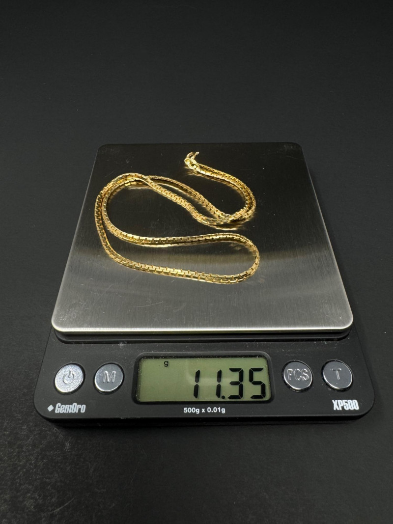 14K Gold Chunky Box-Style Necklace – 16.5″, Approx. 11.35 g. Disclaimer: All jewelry has been inspected and tested by a jeweler. However, items are sold "as is" with no guarantees regarding metal quality, content, or purity. By placing a bid, you acknowledge and agree to these terms. Refunds will not be issued based on these factors. PICK UP DETAILS