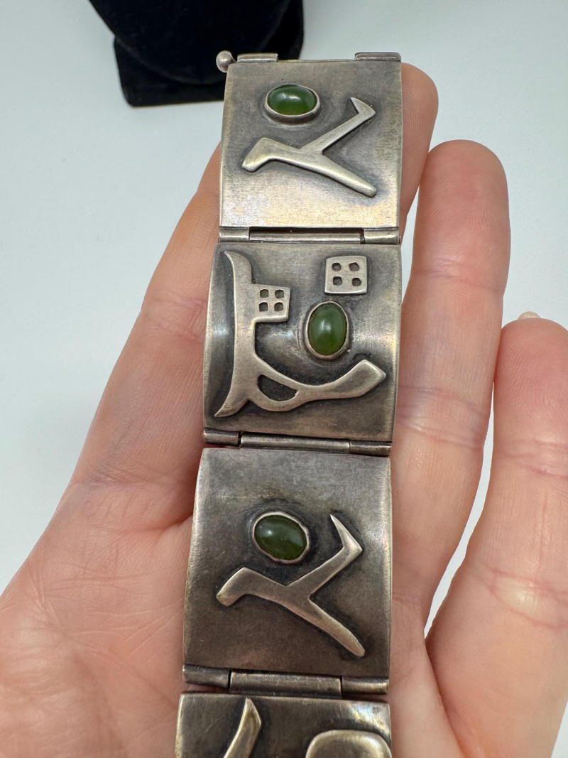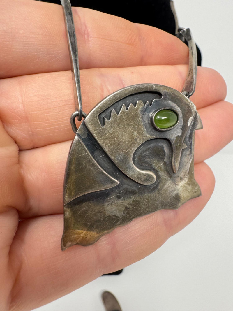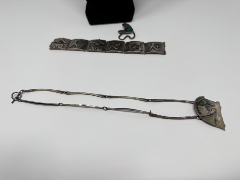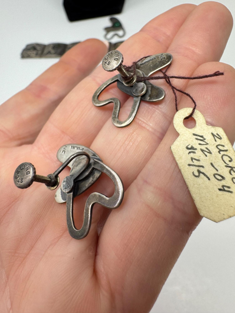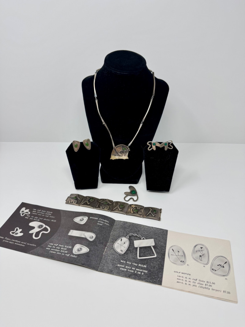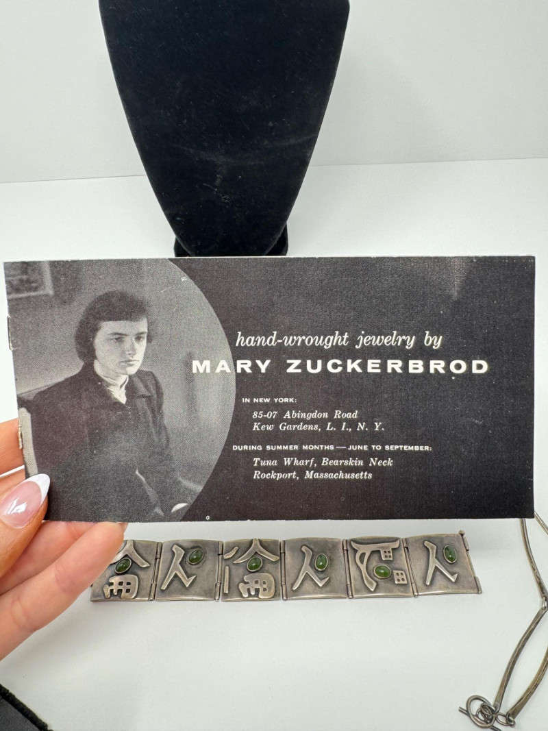 Signed Mary Zuckerbrod Mid-Century Sterling & Green Onyx Jewelry Set. Original informational pamphlet is not included. PICK UP DETAILS Please plan accordingly—pickup times and locations are strictly by lot number, with no exceptions. Disclaimer: All jewelry has been inspected and tested by a jeweler. However, items are sold "as is" with no guarantees regarding metal quality, content, or purity. By placing a bid, you acknowledge and agree to these terms. Refunds will not be issued based on these factors.