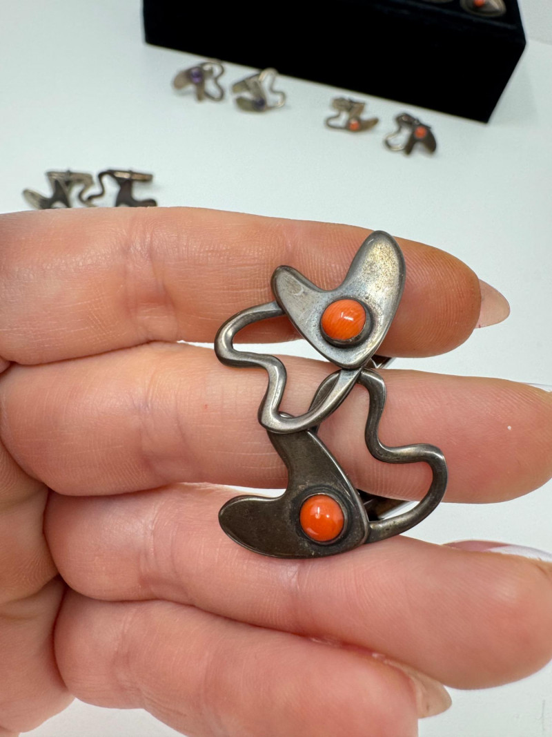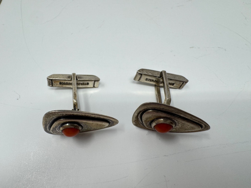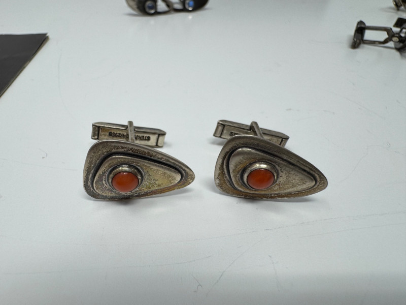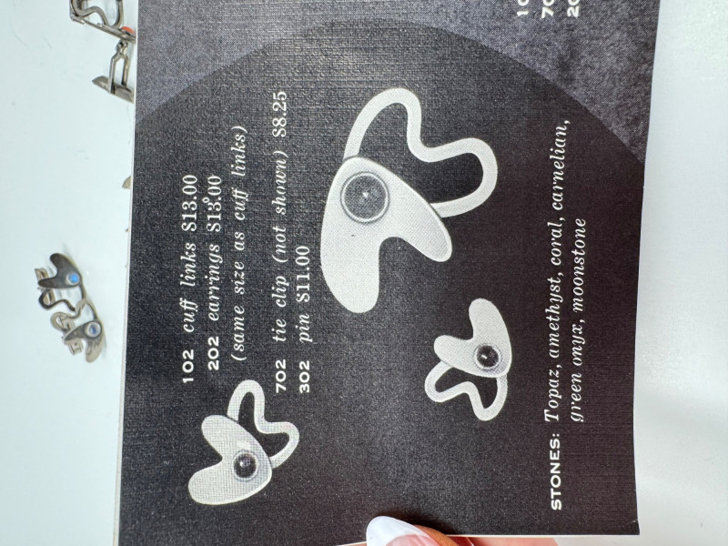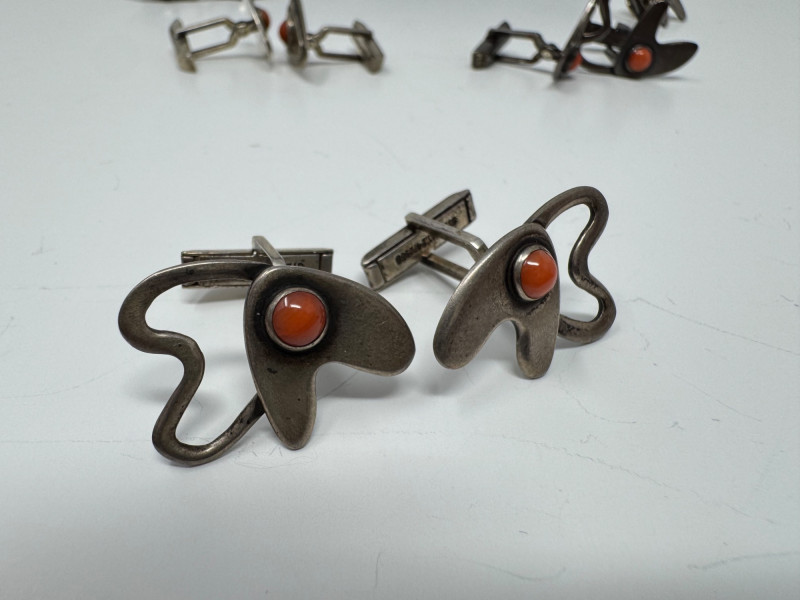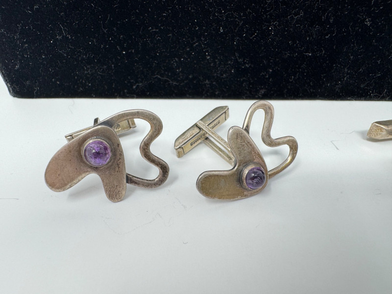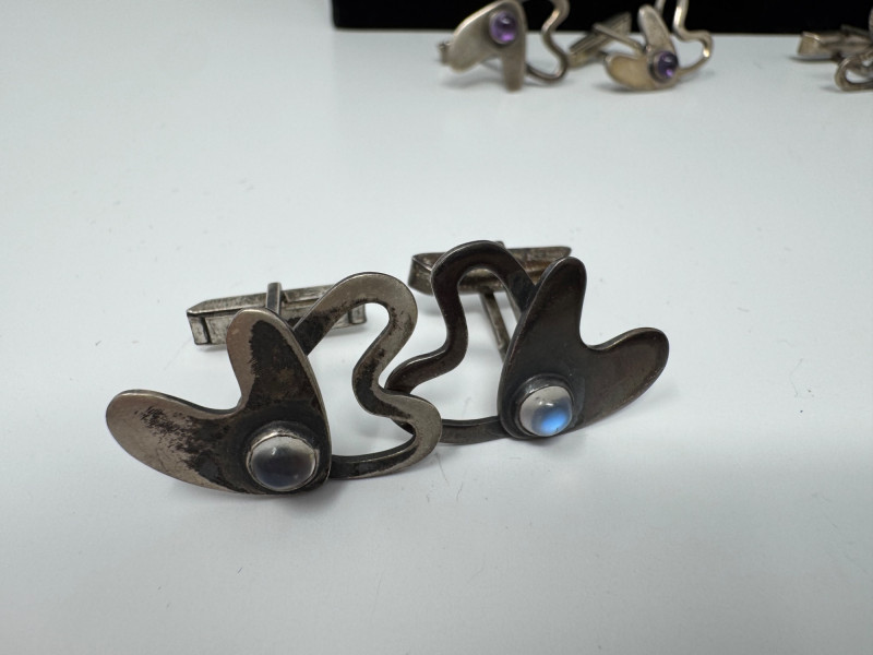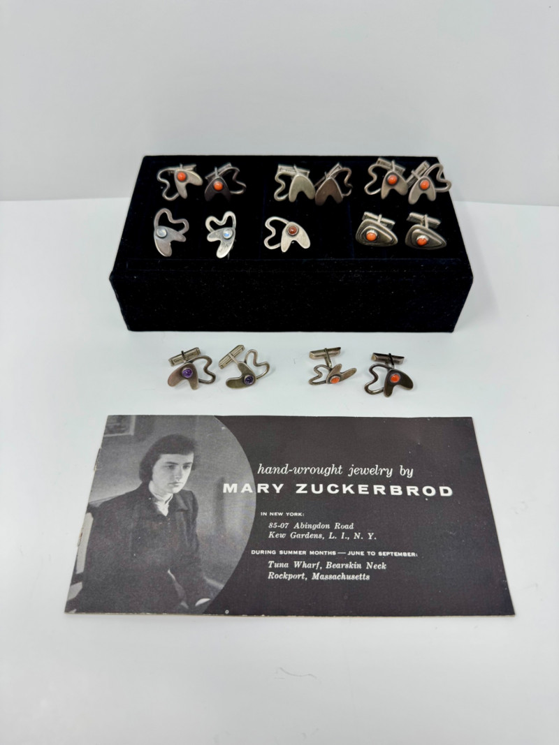 Mary Zuckerbrod Mid-Century Sterling - Carnelian, Moonstone, Amethyst - Signed. 7 pairs cufflinks & 1 pin. Sterling silver with carnelian, moonstone, amethyst. Pamphlet not included. PICK UP DETAILS Please plan accordingly—pickup times and locations are strictly by lot number, with no exceptions. Disclaimer: All jewelry has been inspected and tested by a jeweler. However, items are sold "as is" with no guarantees regarding metal quality, content, or purity. By placing a bid, you acknowledge and agree to these terms. Refunds will not be issued based on these factors.