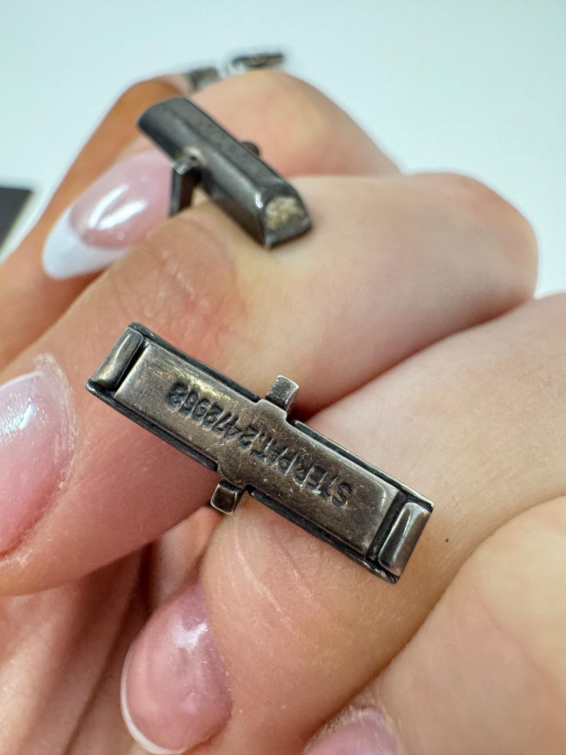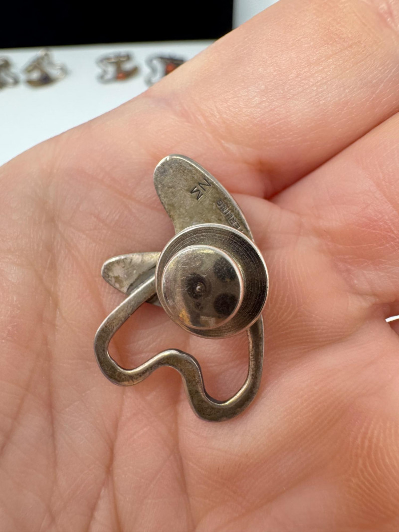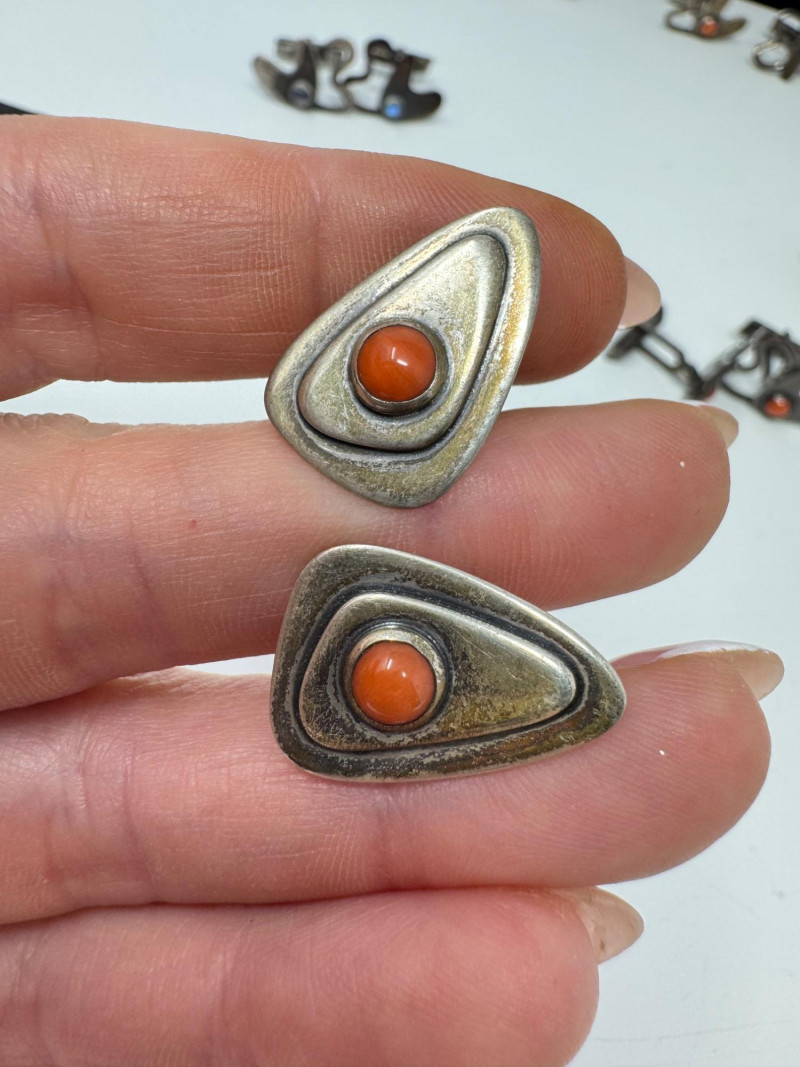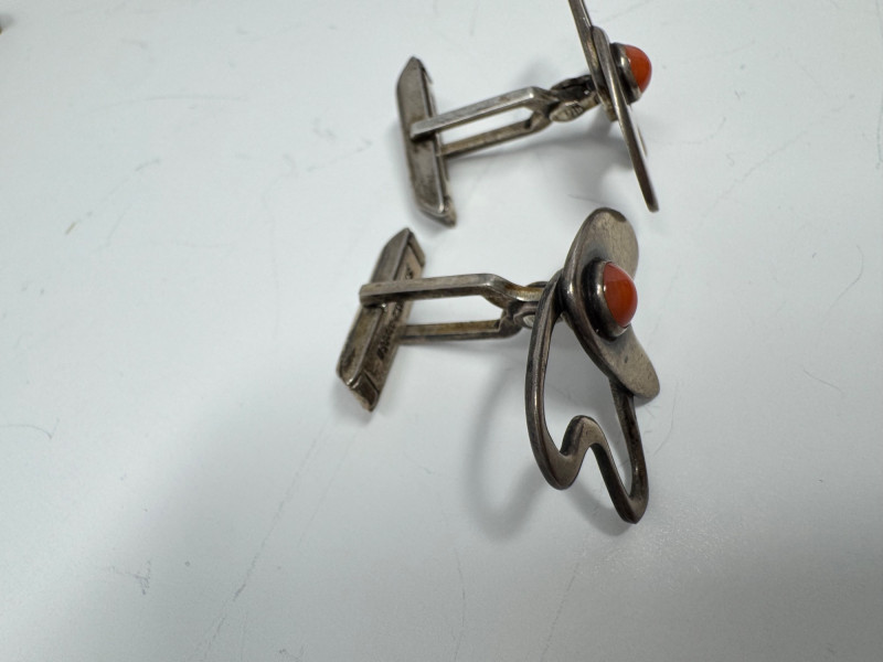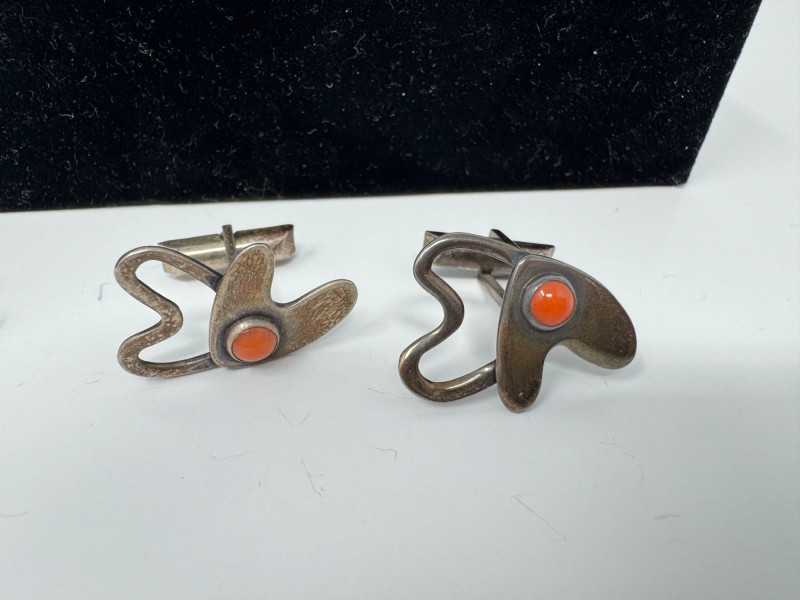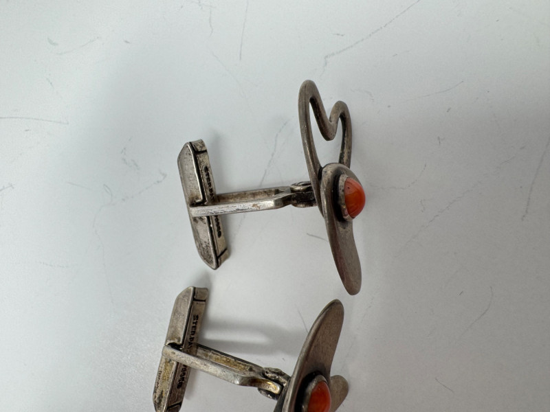 Mary Zuckerbrod Mid-Century Sterling - Carnelian, Moonstone, Amethyst - Signed. 7 pairs cufflinks & 1 pin. Sterling silver with carnelian, moonstone, amethyst. Pamphlet not included. PICK UP DETAILS Please plan accordingly—pickup times and locations are strictly by lot number, with no exceptions. Disclaimer: All jewelry has been inspected and tested by a jeweler. However, items are sold "as is" with no guarantees regarding metal quality, content, or purity. By placing a bid, you acknowledge and agree to these terms. Refunds will not be issued based on these factors.