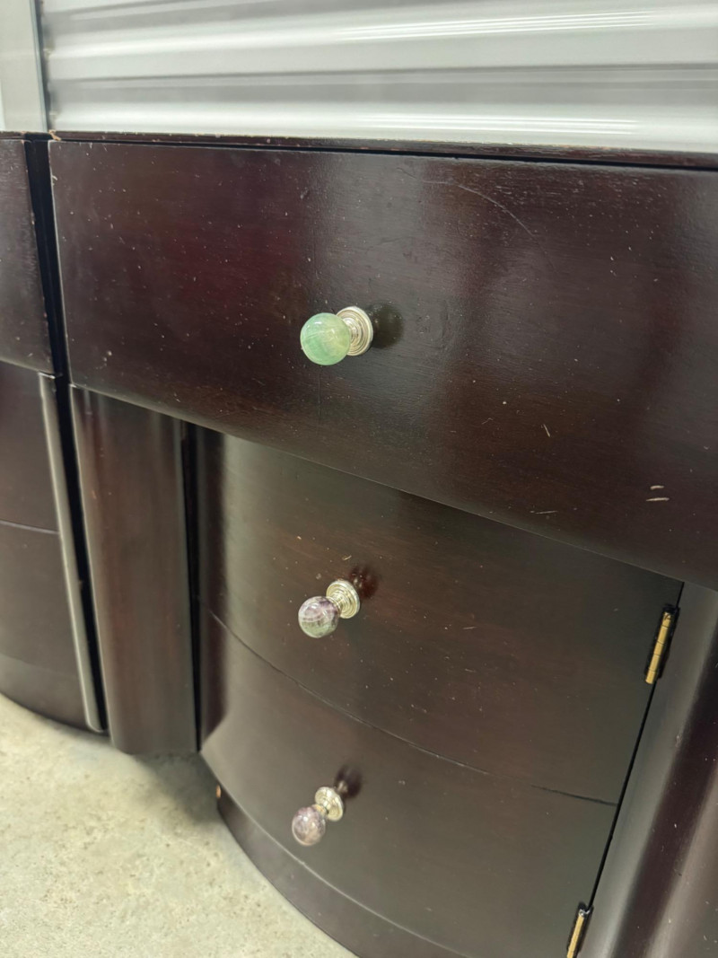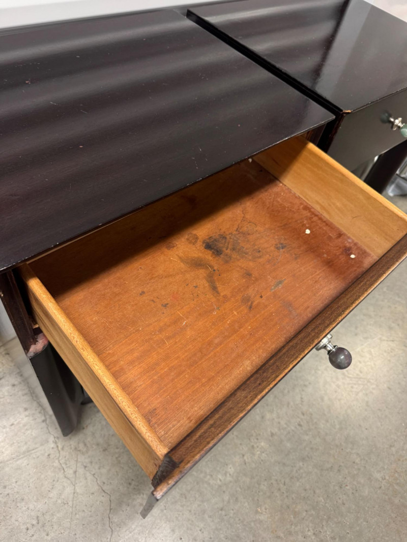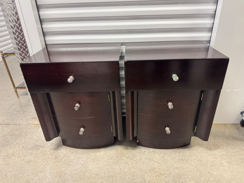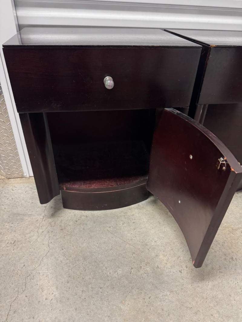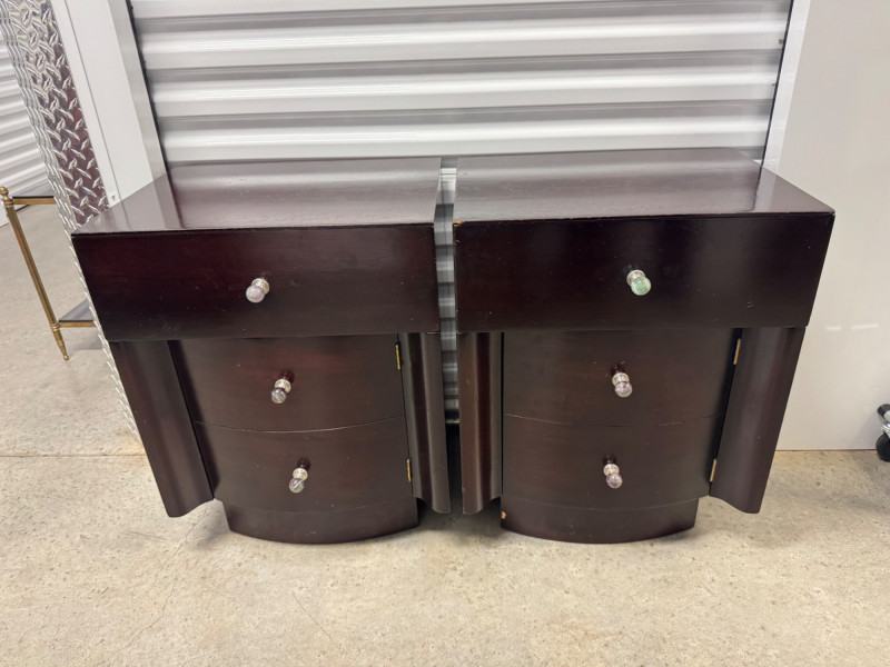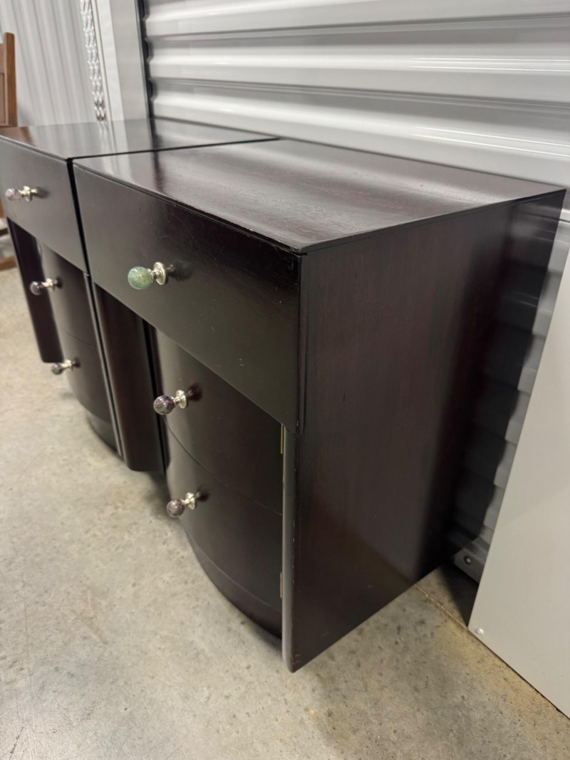 Pair of Vintage Dark Wood Side Tables w/ Stone Drawer Pulls. 20” Wide 15” Deep 25” Tall Features Single Dovetailed Drawer Over A Cabinet Door. Drawer Fronts With Unique Round Stone Pulls In Varying Colors. Note: Both Tables Show Age-Related Wear—Light Surface Scratches And Areas Of Chipping Along The Edges And Corners (See Photos). PICK UP DETAILS Please plan accordingly—pickup times and locations are strictly by lot number, with no exceptions.