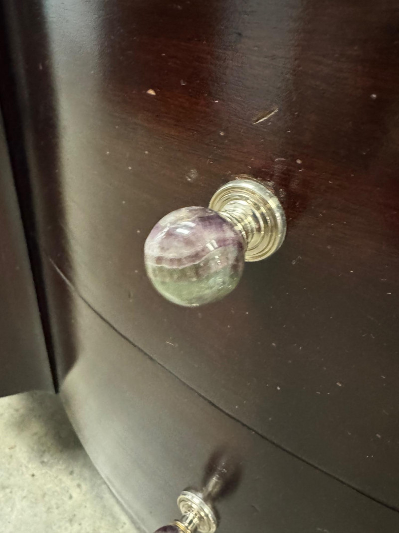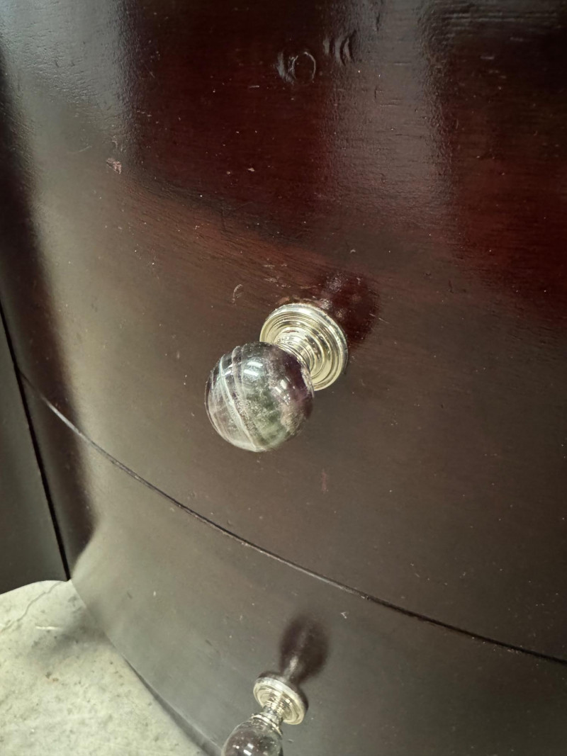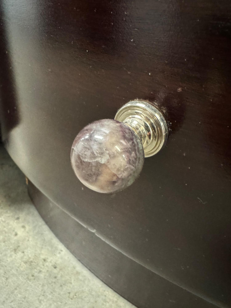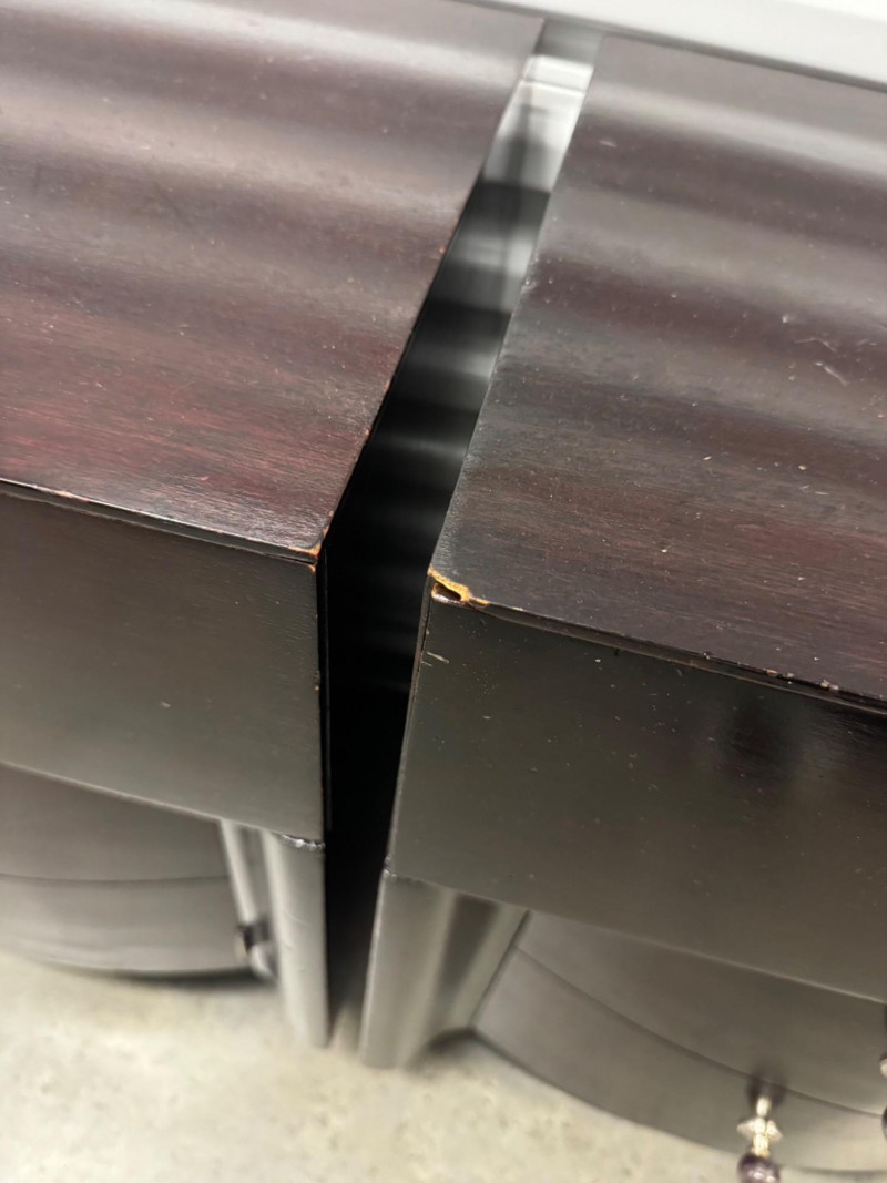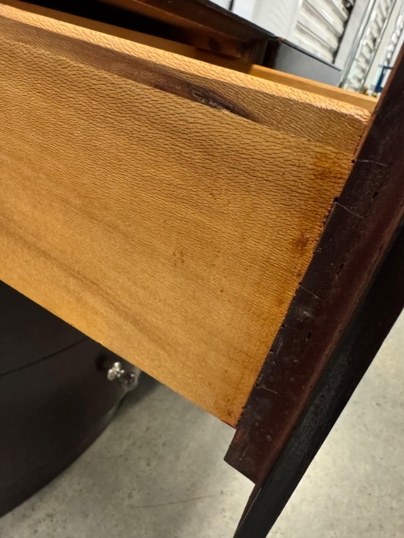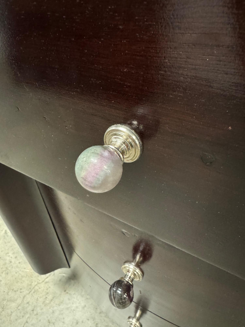 Pair of Vintage Dark Wood Side Tables w/ Stone Drawer Pulls. 20” Wide 15” Deep 25” Tall Features Single Dovetailed Drawer Over A Cabinet Door. Drawer Fronts With Unique Round Stone Pulls In Varying Colors. Note: Both Tables Show Age-Related Wear—Light Surface Scratches And Areas Of Chipping Along The Edges And Corners (See Photos). PICK UP DETAILS Please plan accordingly—pickup times and locations are strictly by lot number, with no exceptions.