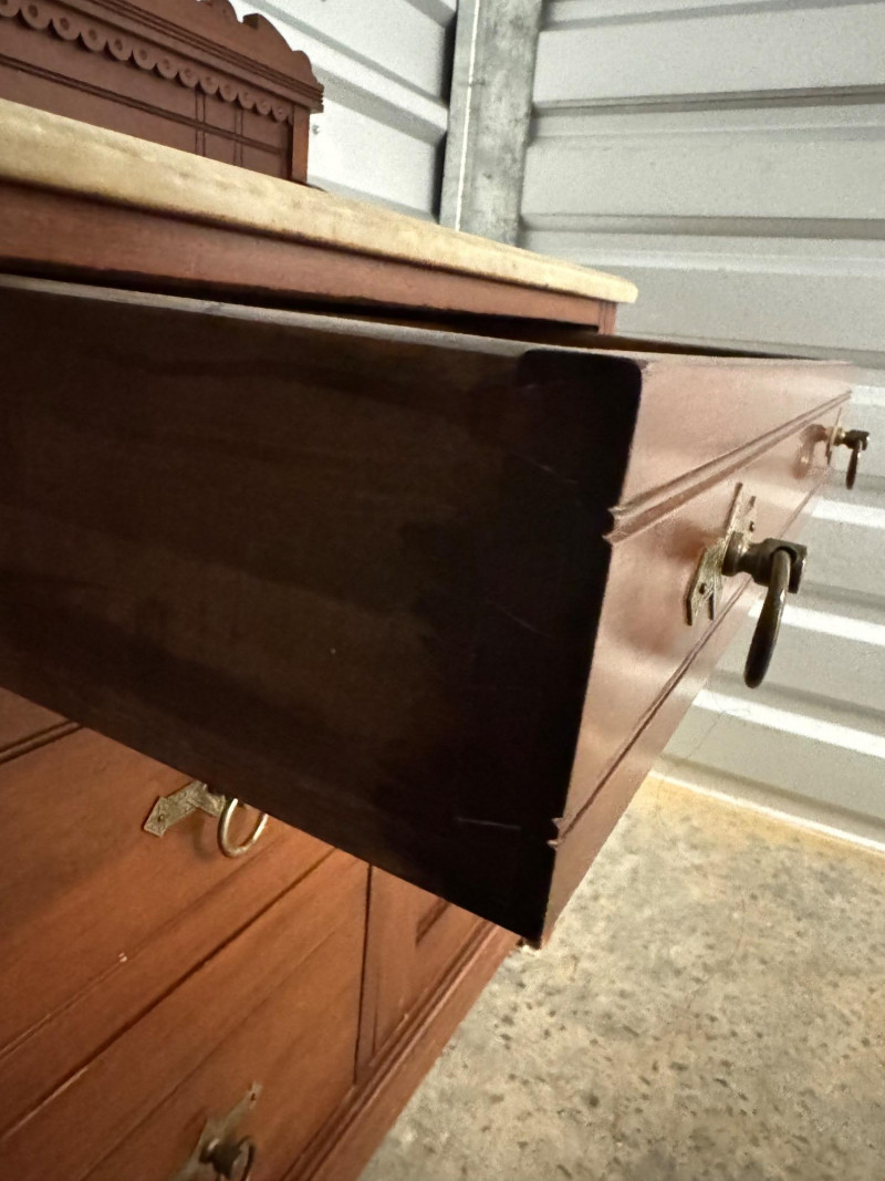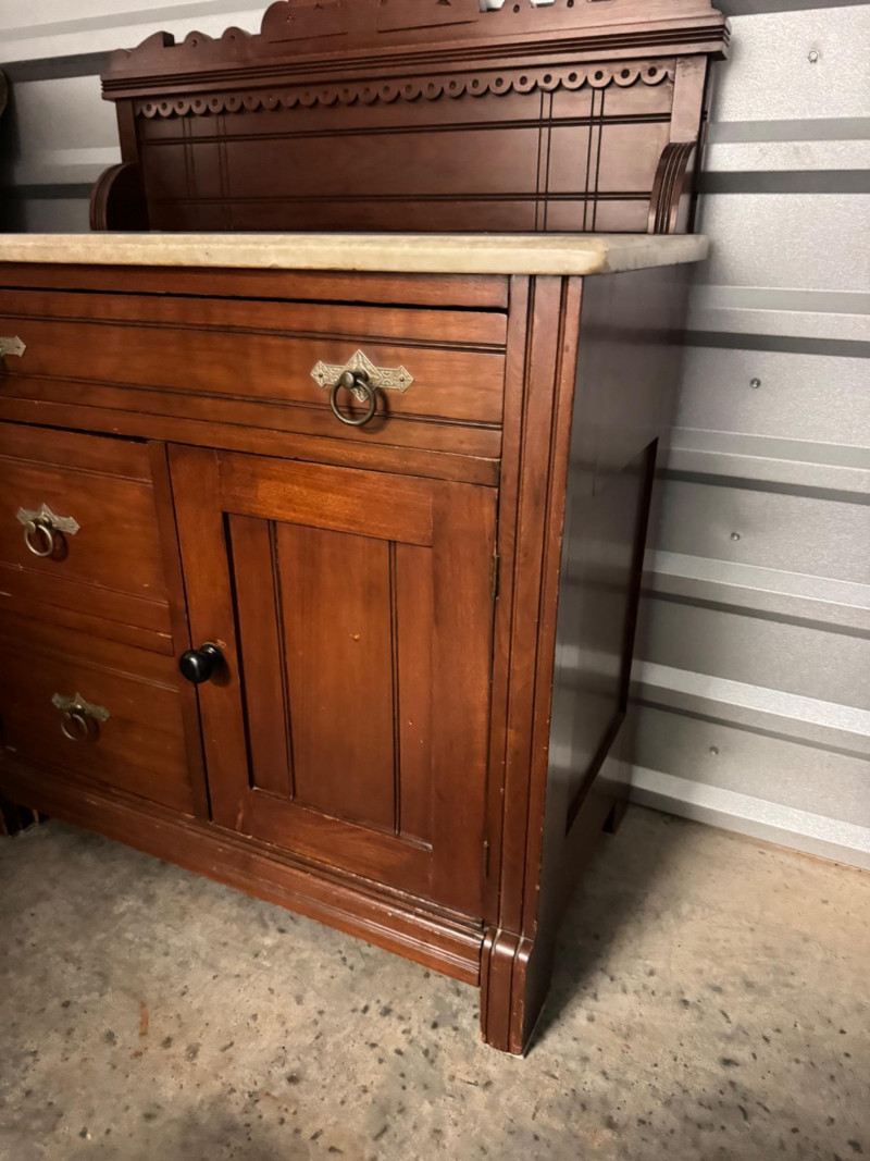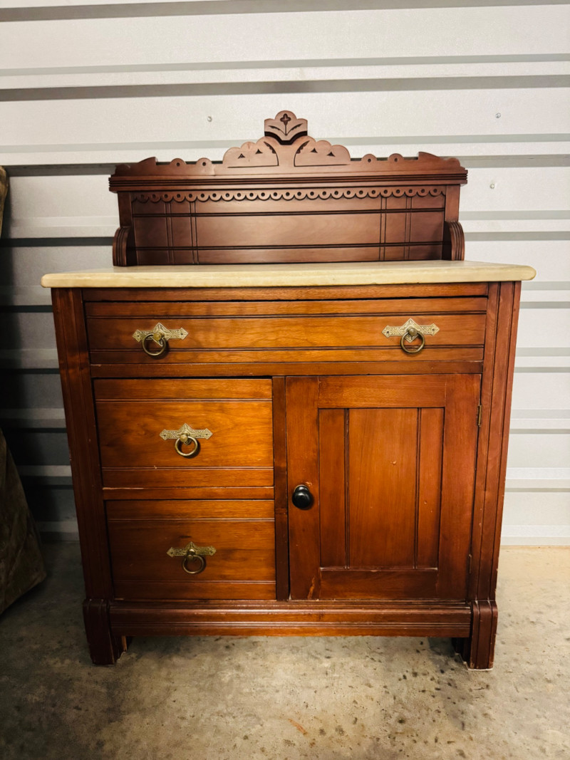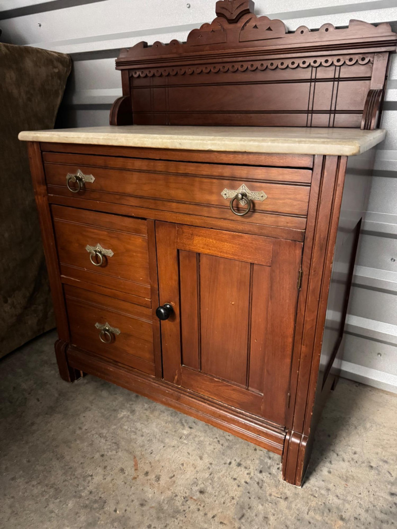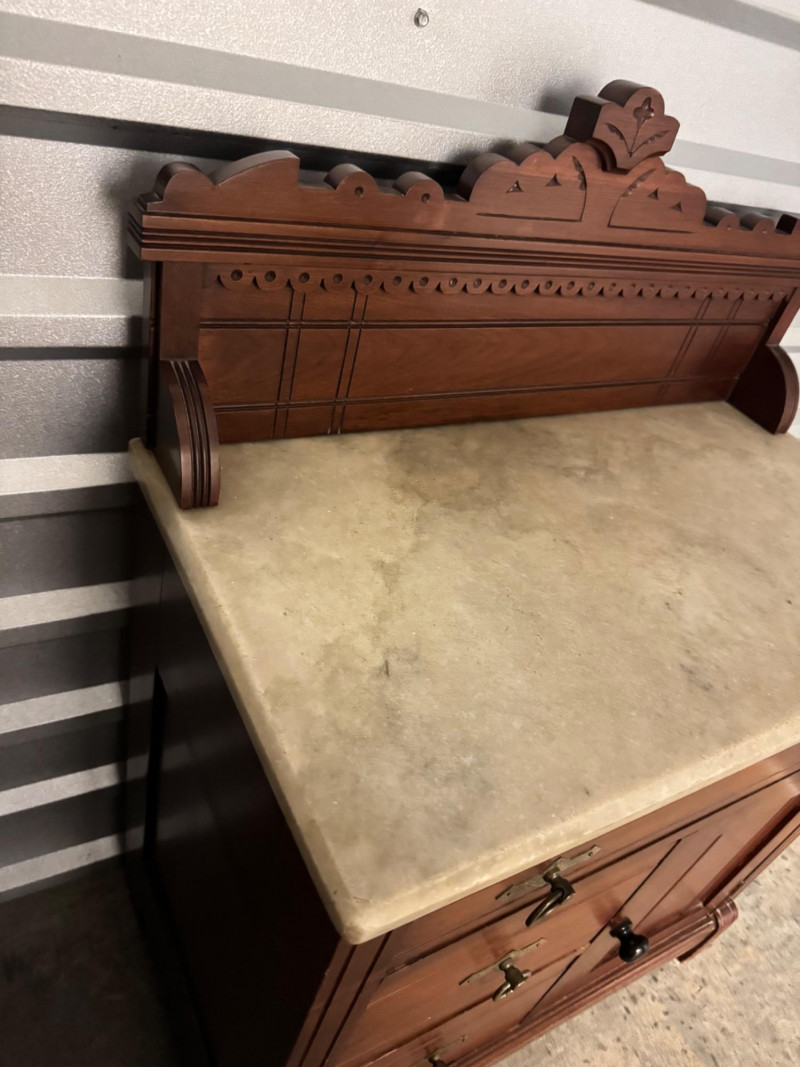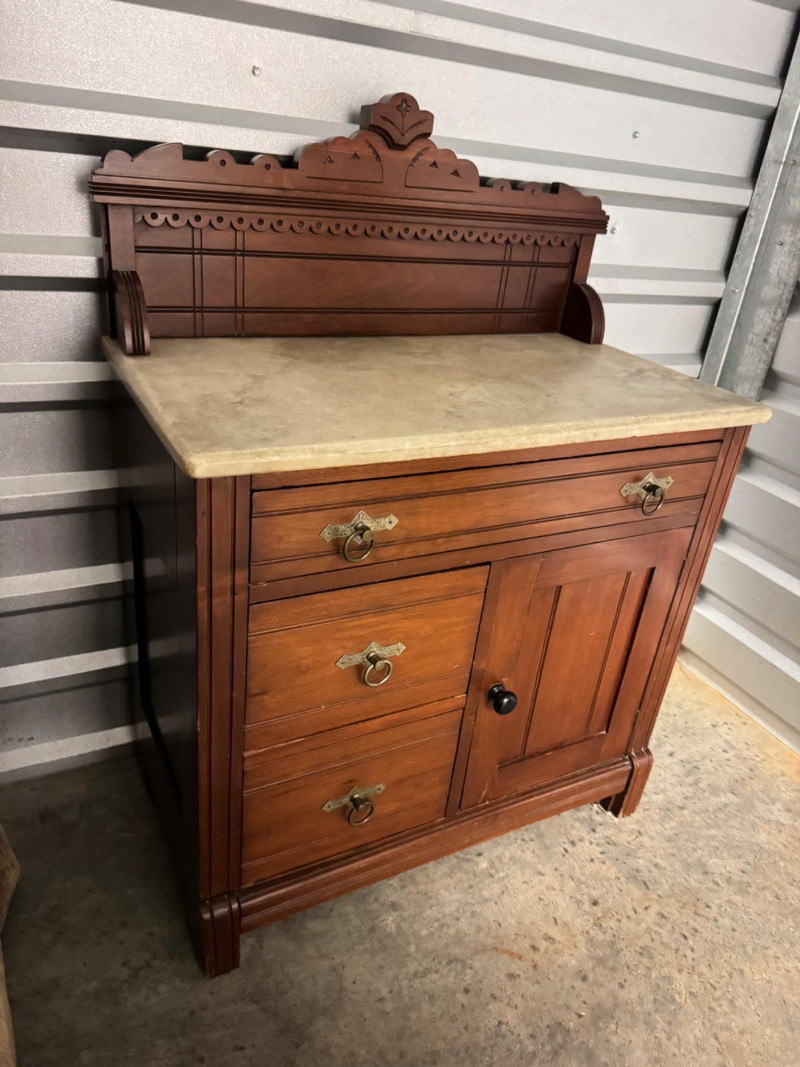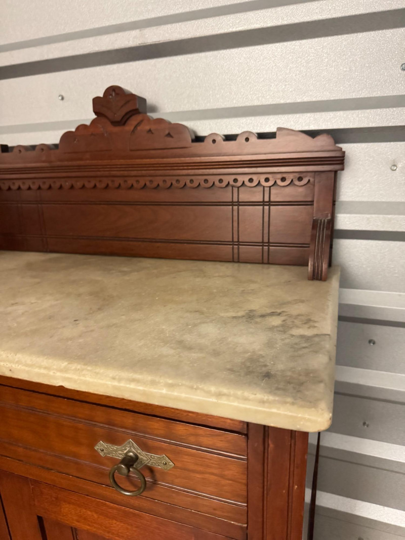 Antique Stone Top Washstand w/ Carved Wood Backsplash. 30” Wide 16” Deep 39” Tall PICK UP DETAILS Please plan accordingly—pickup times and locations are strictly by lot number, with no exceptions. Bidding on this lot is an agreement that: (1.) You will have at least 2 capable, able bodied persons to lift and load at a minimum. (2.) You will bring a hand truck and/or any other tools needed to remove this item. If these steps are not followed your item will be forfeit and no refund given.