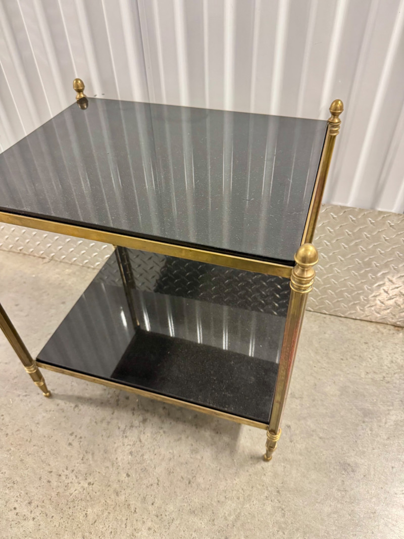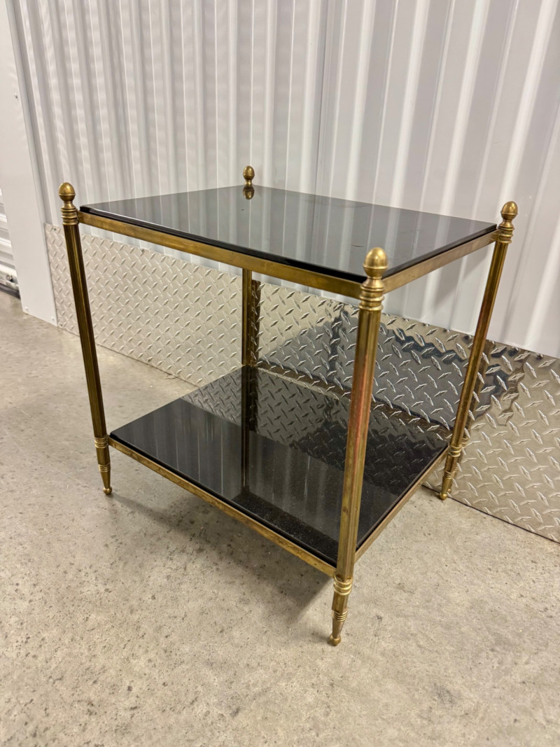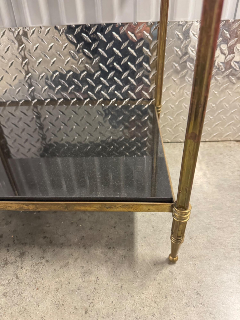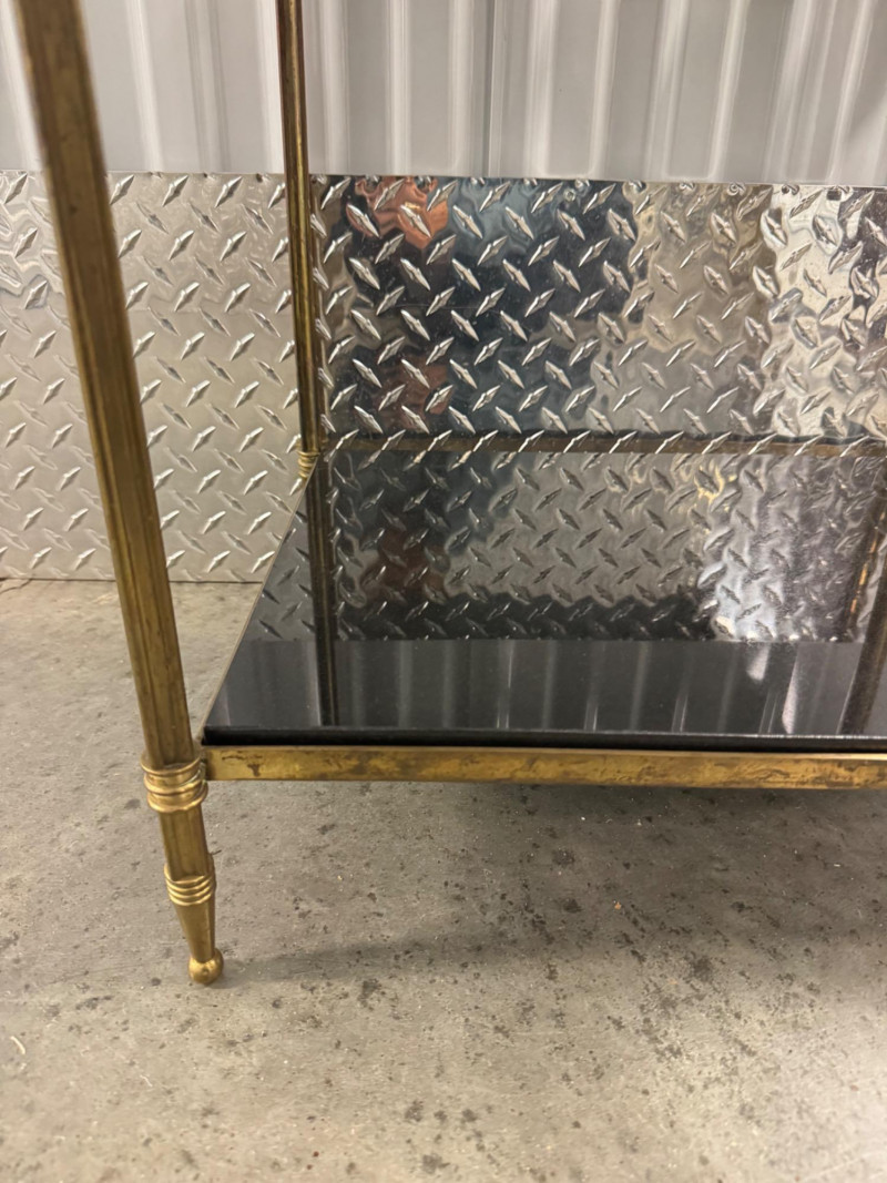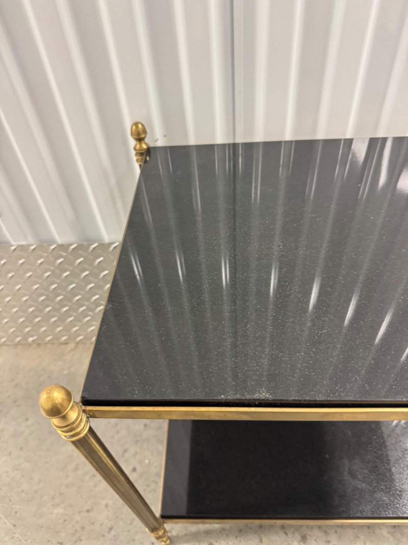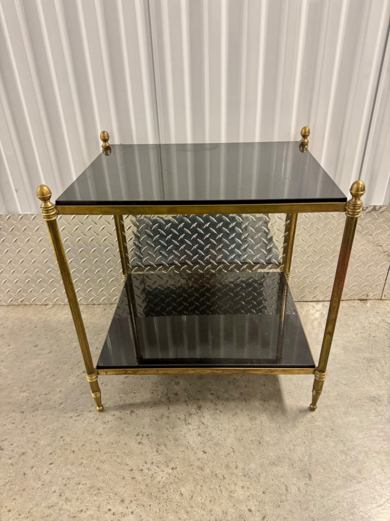 Two-Tier Side Table w/ Black Stone Tops & Gold-Tone Metal Frame. 19” Wide 15” Deep 20” Tall PICK UP DETAILS Please plan accordingly—pickup times and locations are strictly by lot number, with no exceptions. Bidding on this lot is an agreement that: (1.) You will have at least 2 capable, able bodied persons to lift and load at a minimum. (2.) You will bring a hand truck and/or any other tools needed to remove this item. If these steps are not followed your item will be forfeit and no refund given.