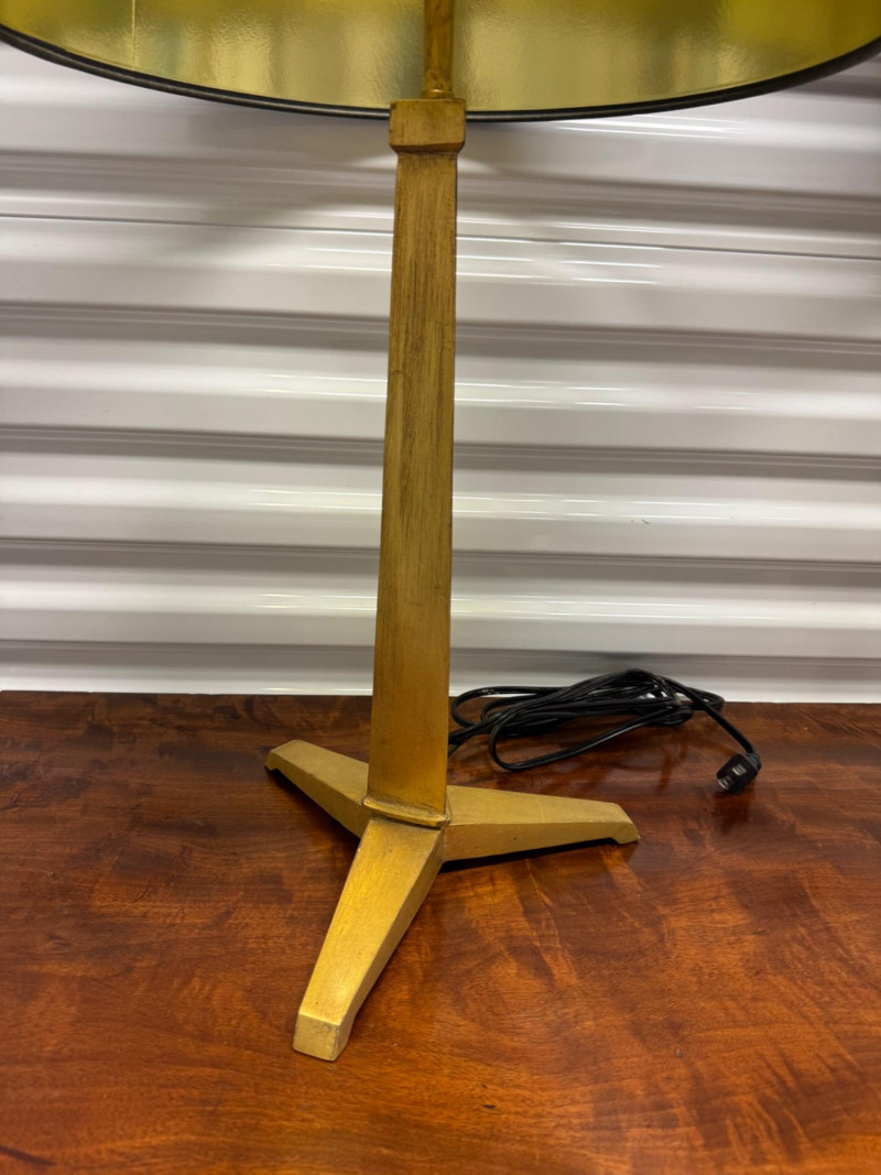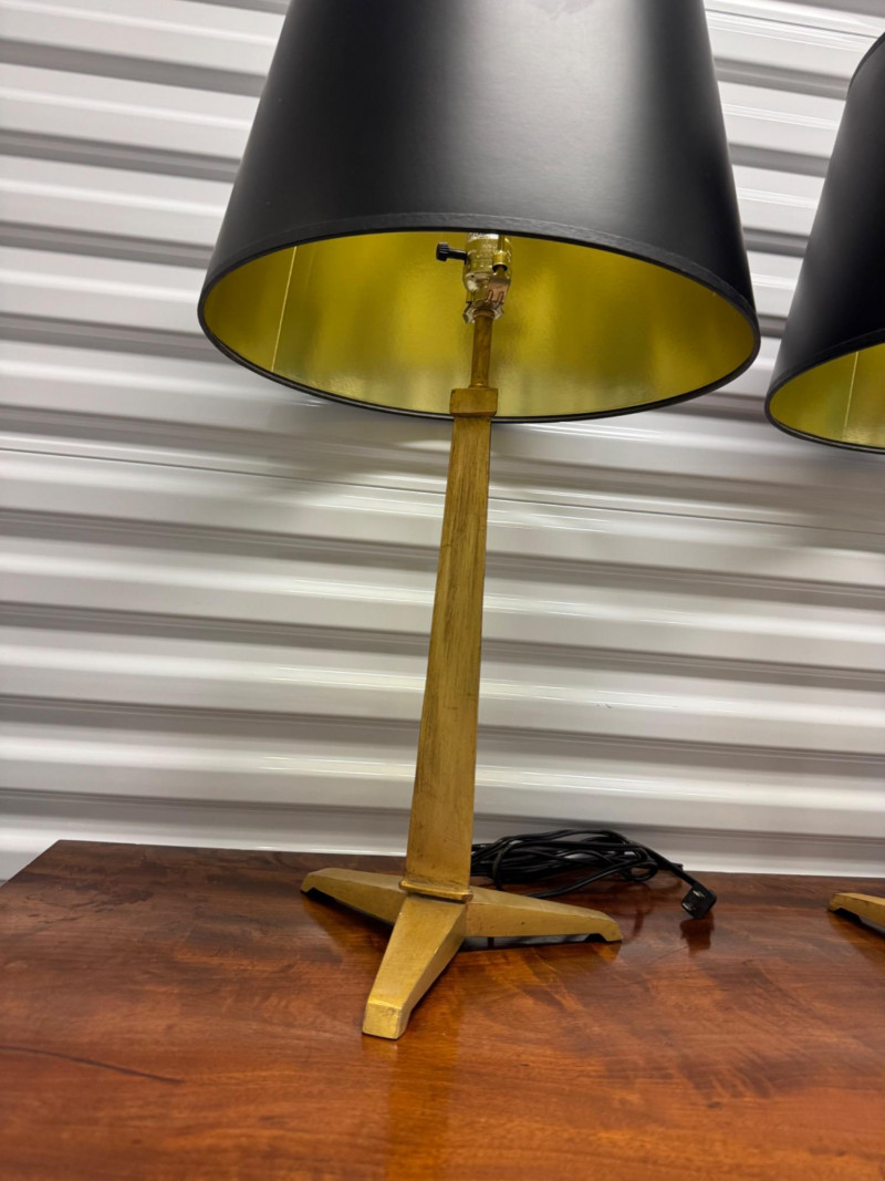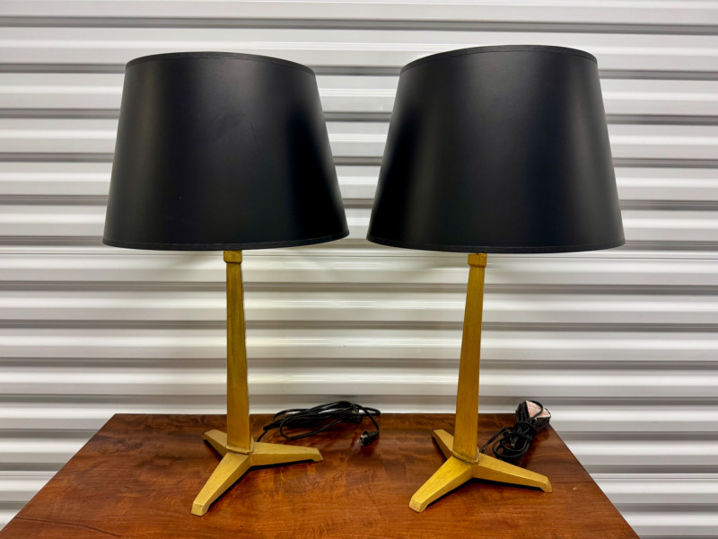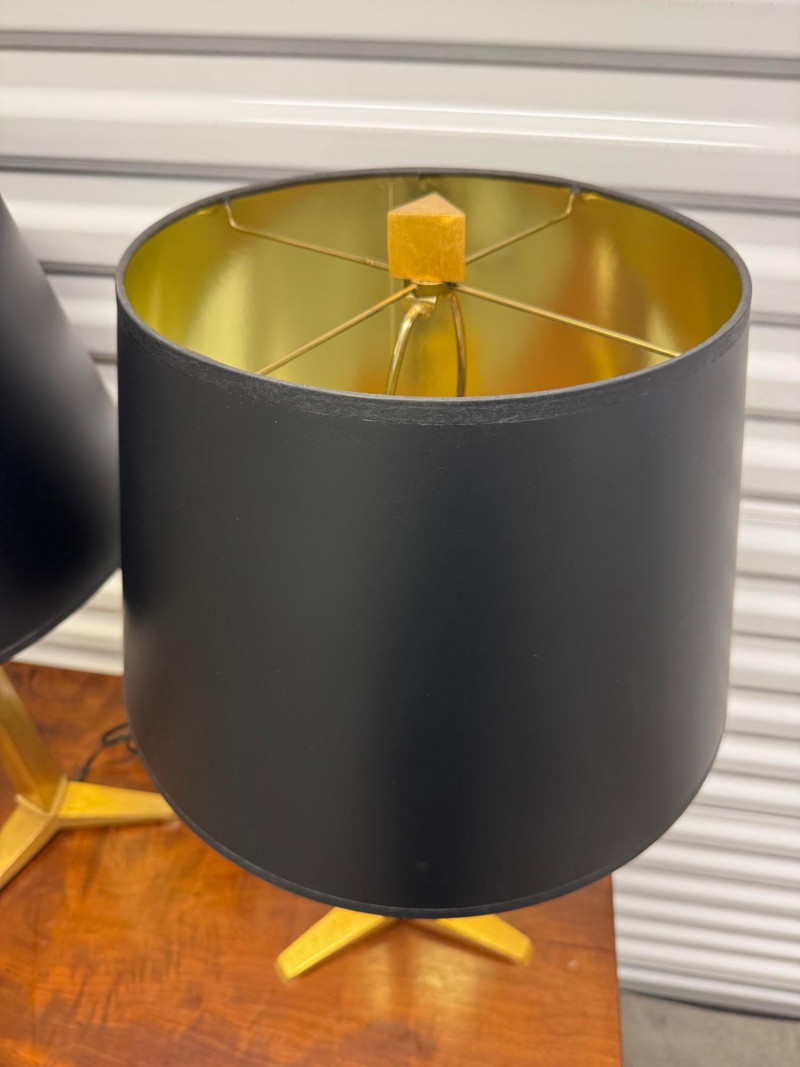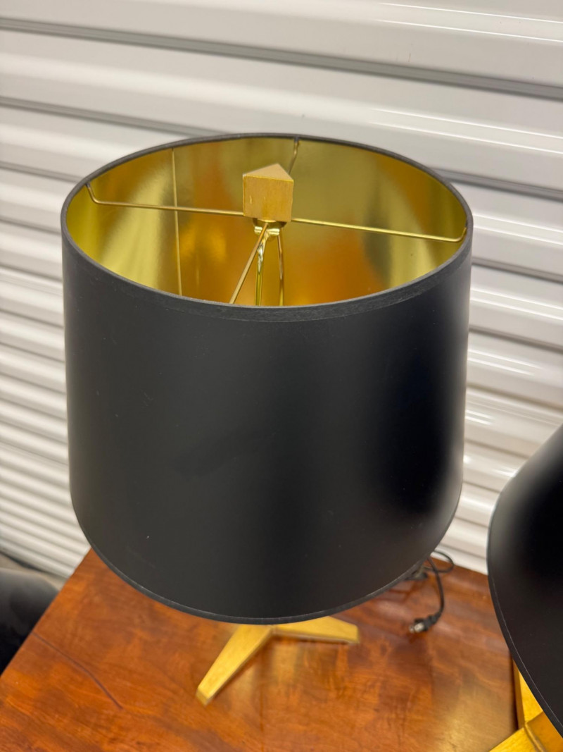 Pair of Gold-Tone Metal Table Lamps w/ Black Drum Shades & Tripod Base. 27” Tall PICK UP DETAILS Please plan accordingly—pickup times and locations are strictly by lot number, with no exceptions.