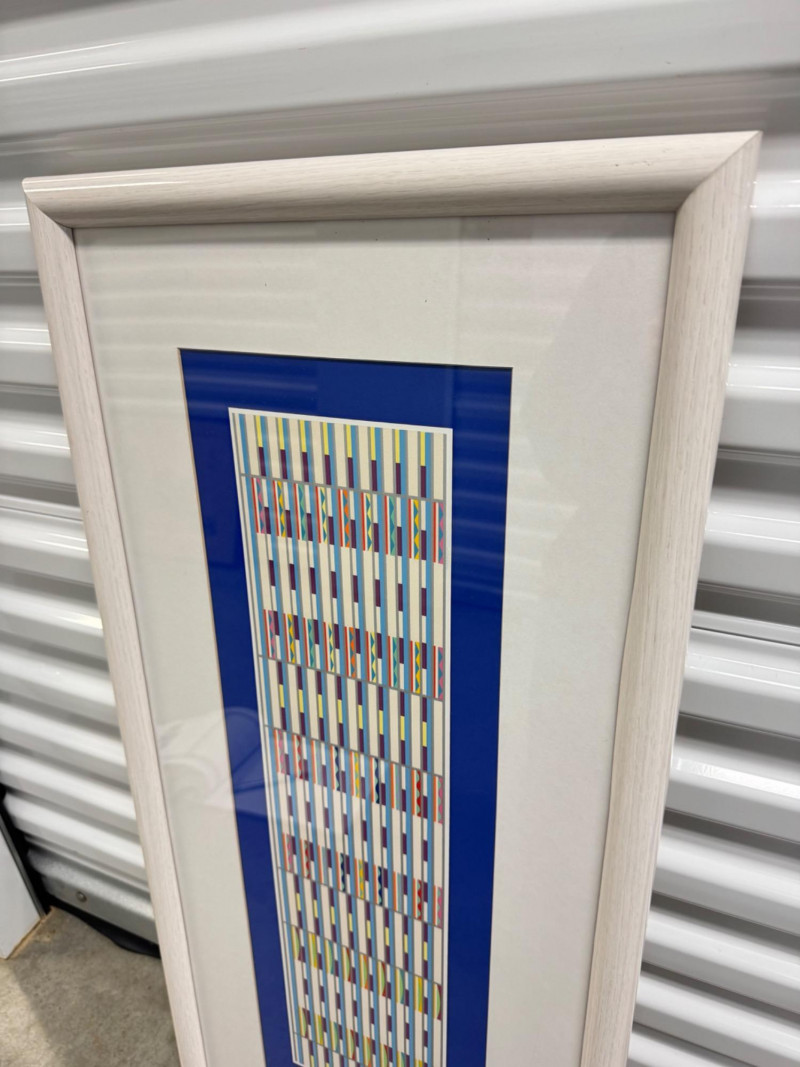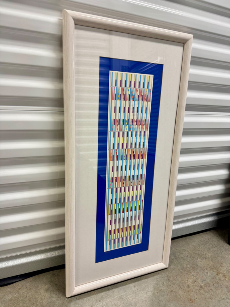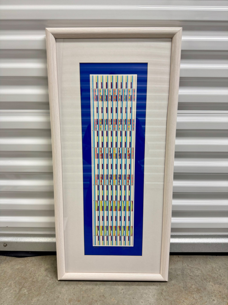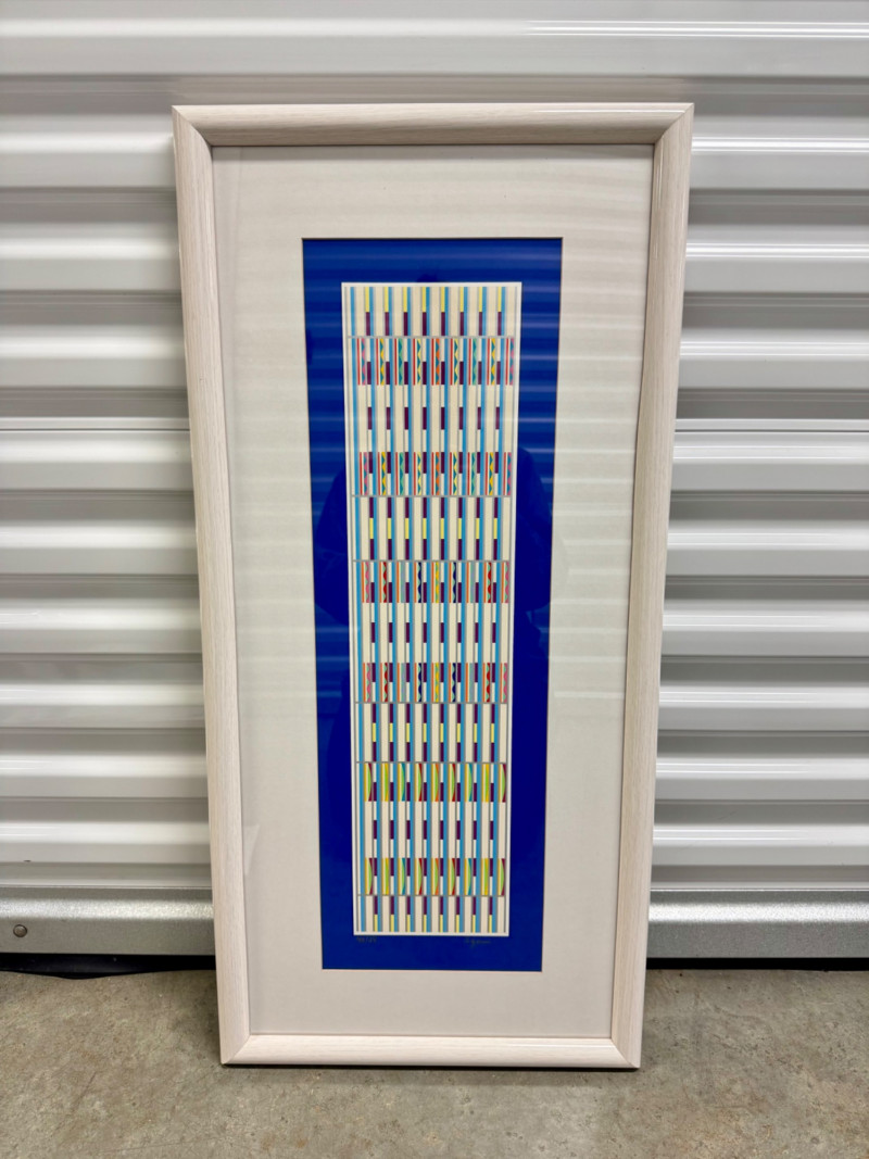 Yaacov Agam “Vertical Orchestration Blue” Framed, Signed & Numbered. PICK UP DETAILS Please plan accordingly—pickup times and locations are strictly by lot number, with no exceptions.