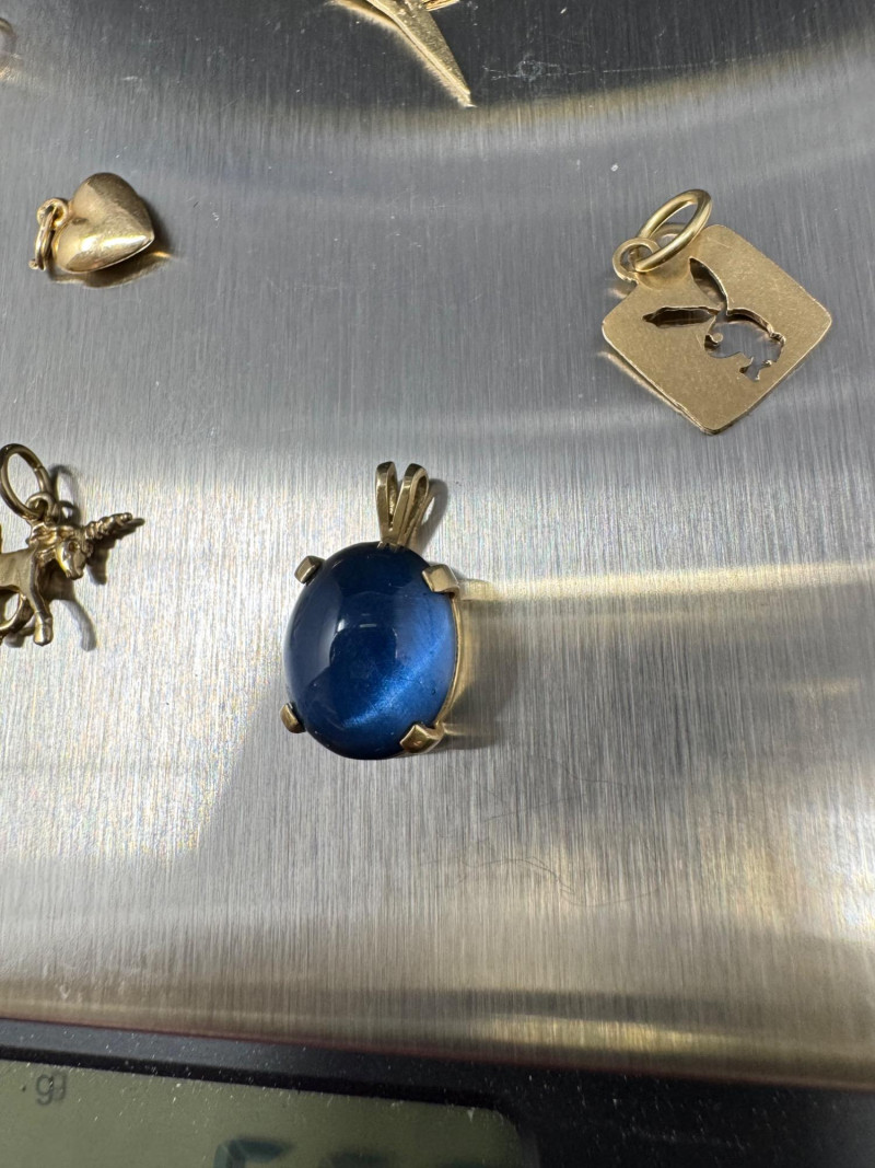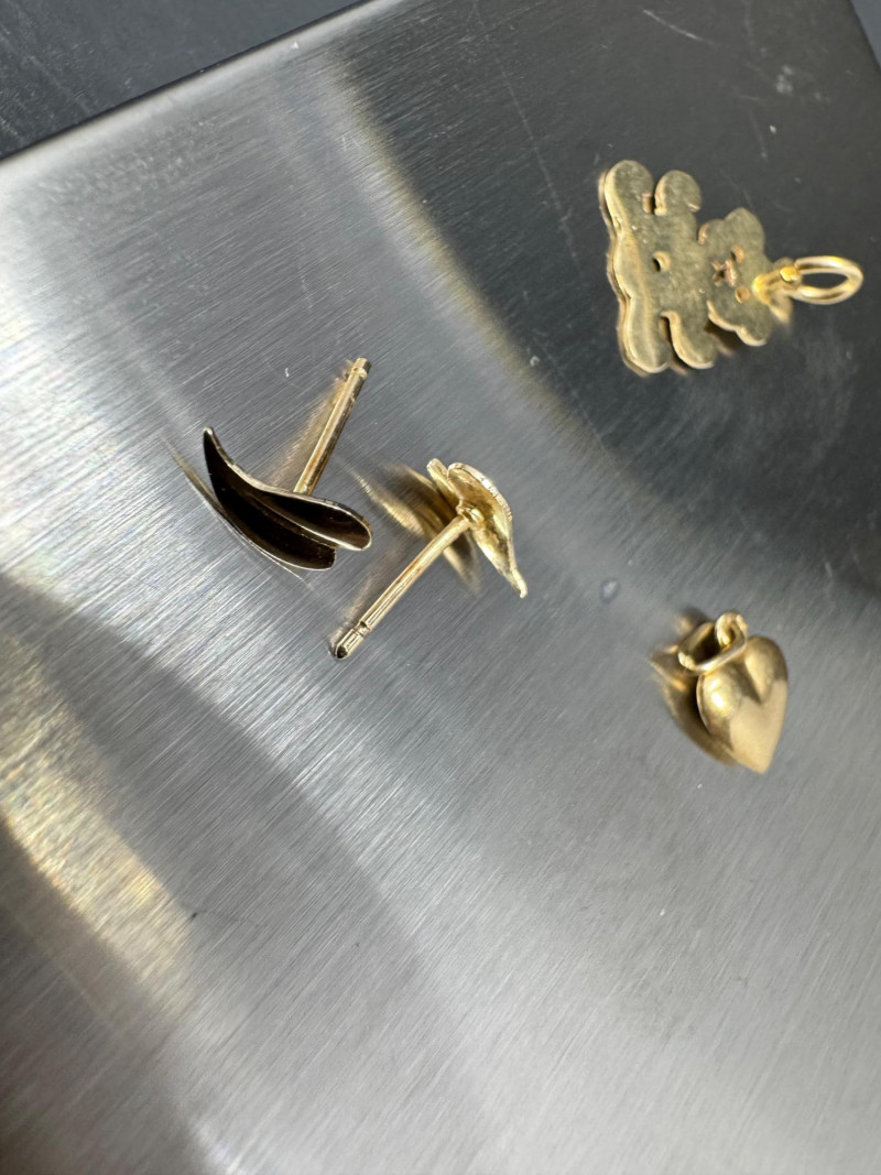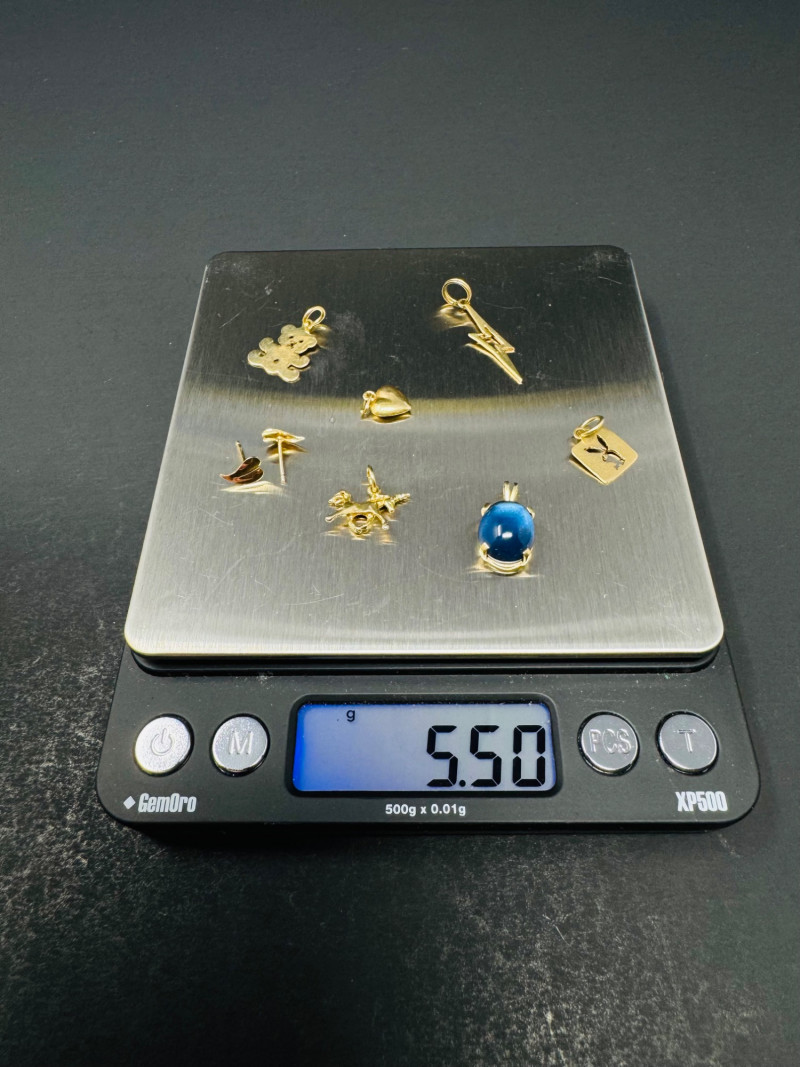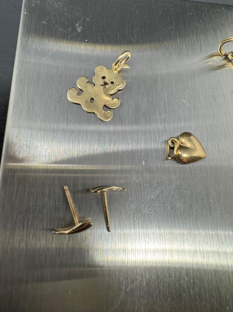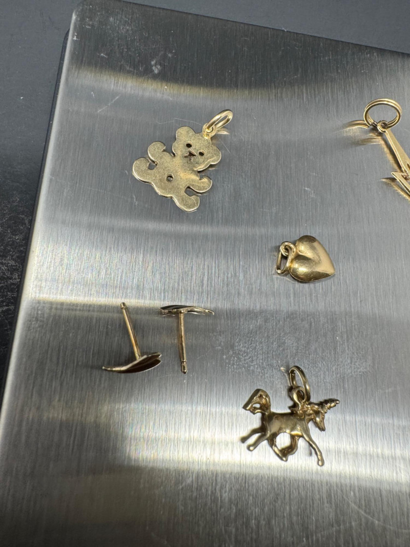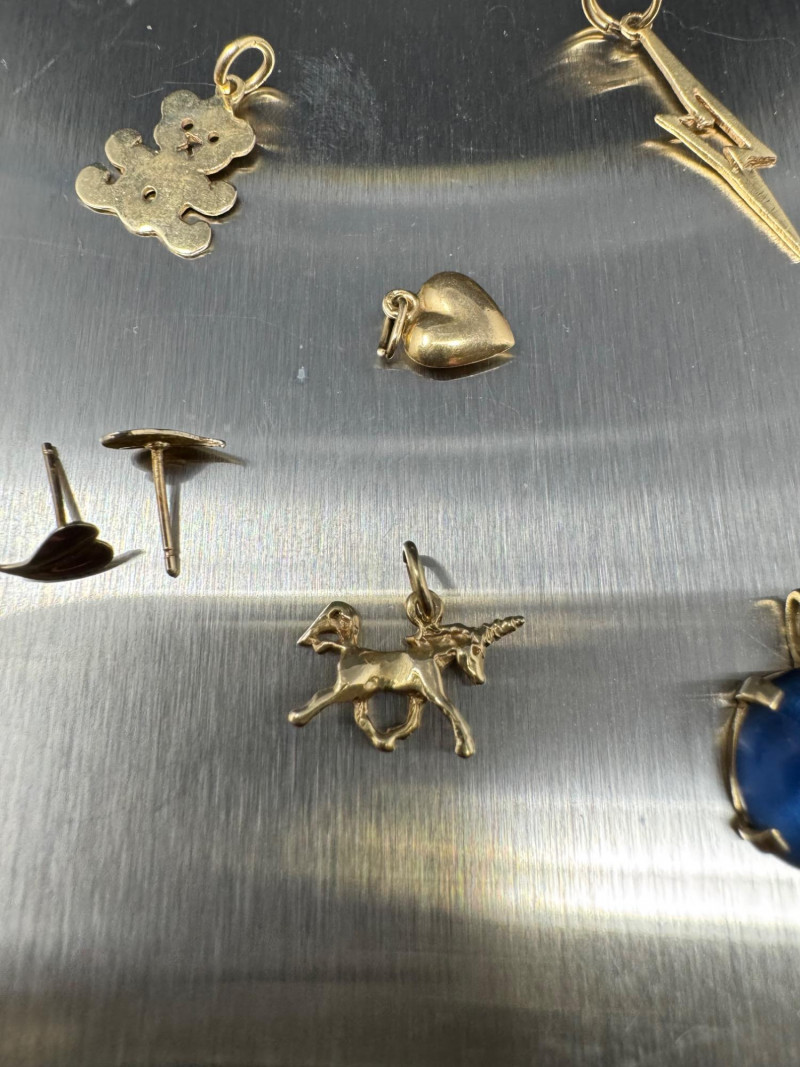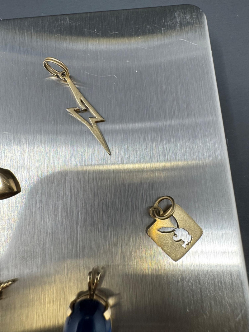 14K Gold Charm & Pendant Lot - Teddy, Lightning & More, 5.50grams. This collection includes a teddy bear, lightning bolt, heart, animal, and Playboy bunny charms, along with a blue cabochon pendant and earring posts. Note: The lightning bolt charm has a small area of damage. These items have been jeweler-inspected, but metal purities are not guaranteed; please bid accordingly. PICK UP DETAILS Please plan accordingly—pickup times and locations are strictly by lot number, with no exceptions.