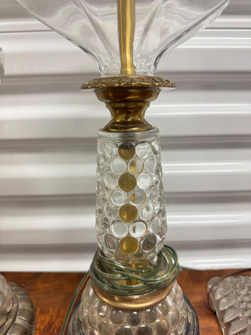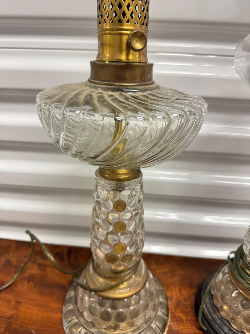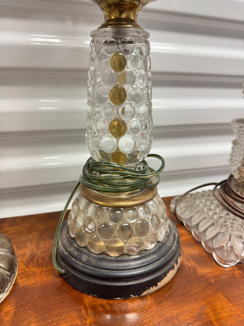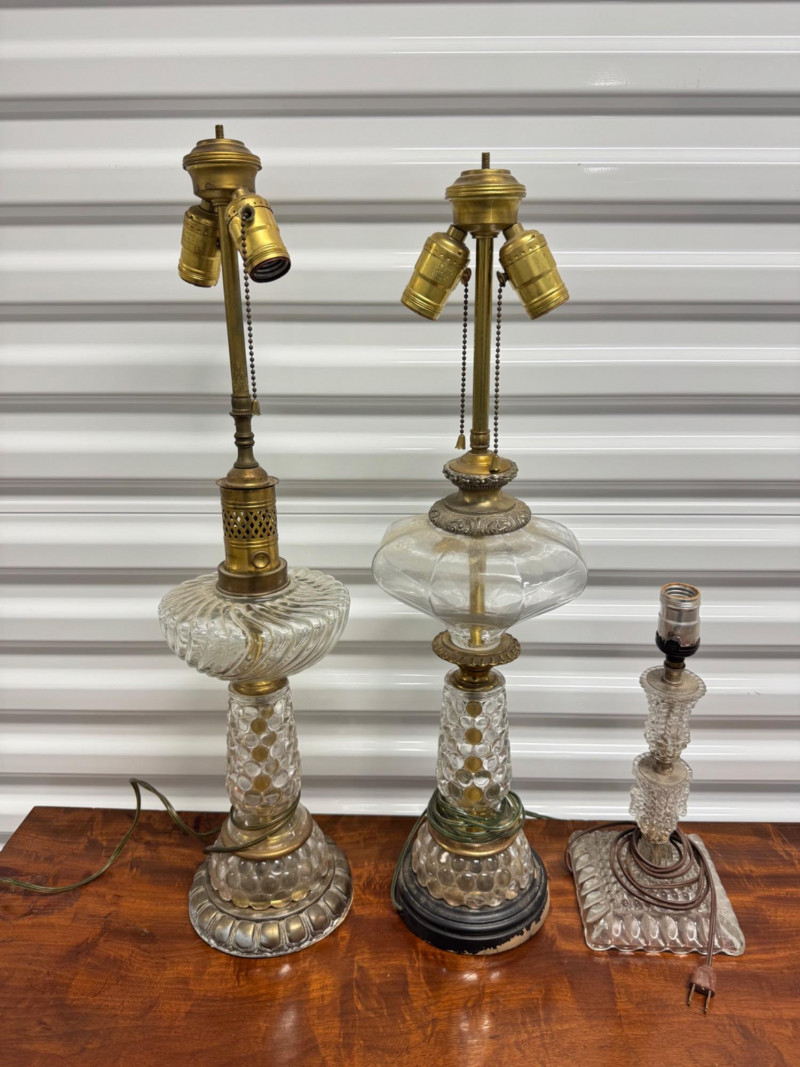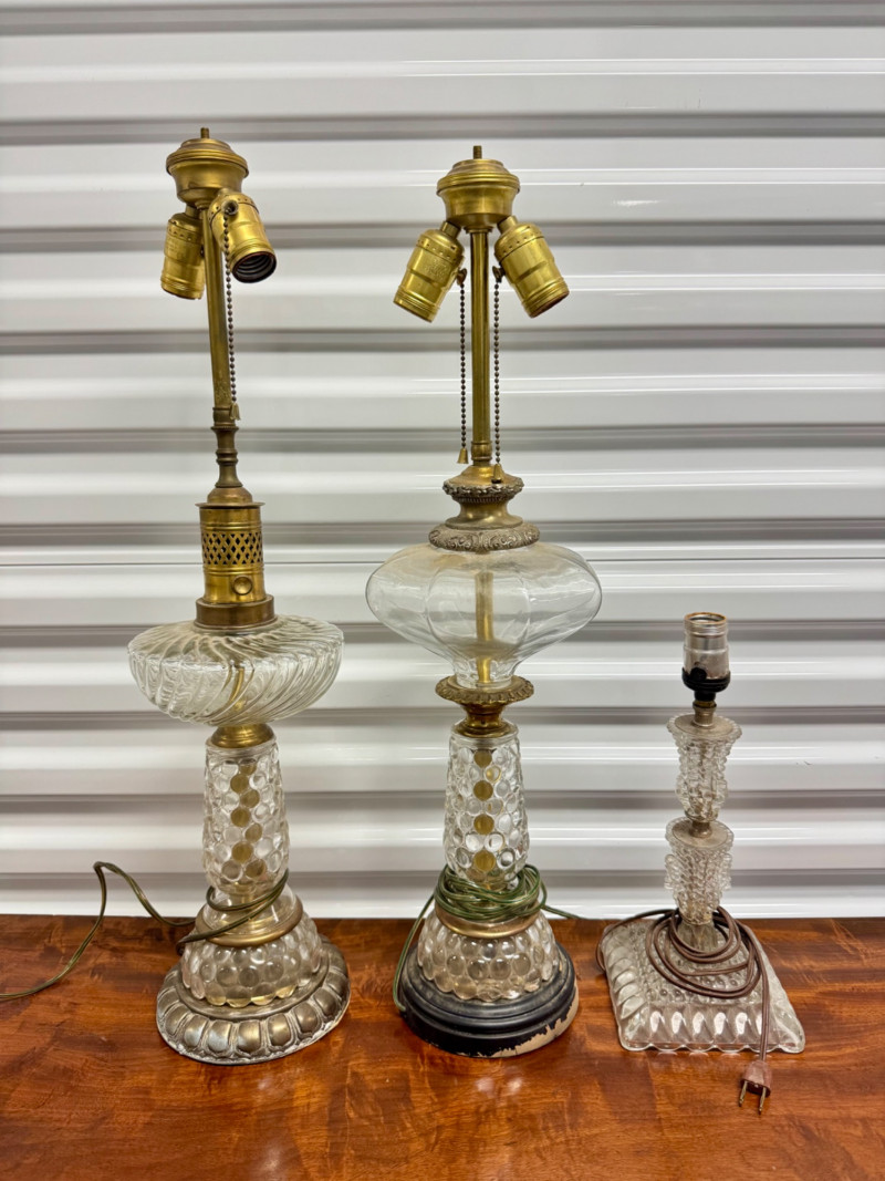Antique Electrified Oil Lamps, Victorian Empire Style & Hobnail Bases. 13-26” Tall Untested, Some Wear To Finish Bases. PICK UP DETAILS Please plan accordingly—pickup times and locations are strictly by lot number, with no exceptions.