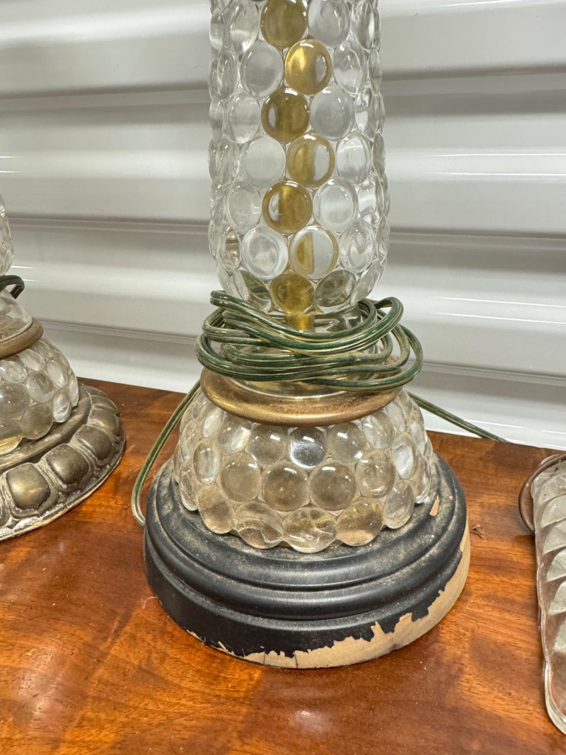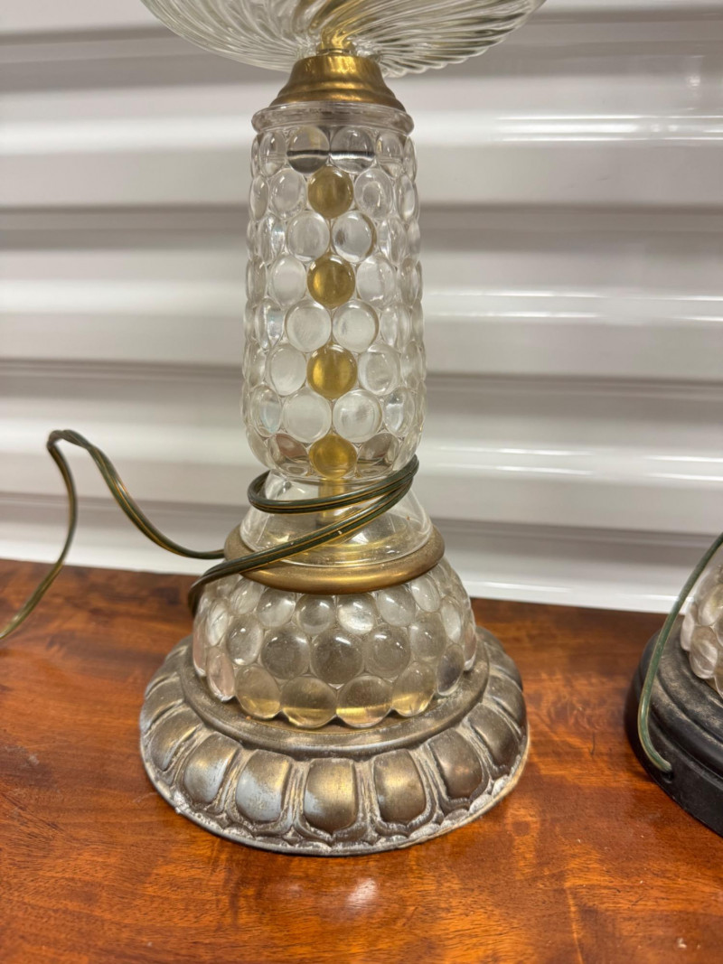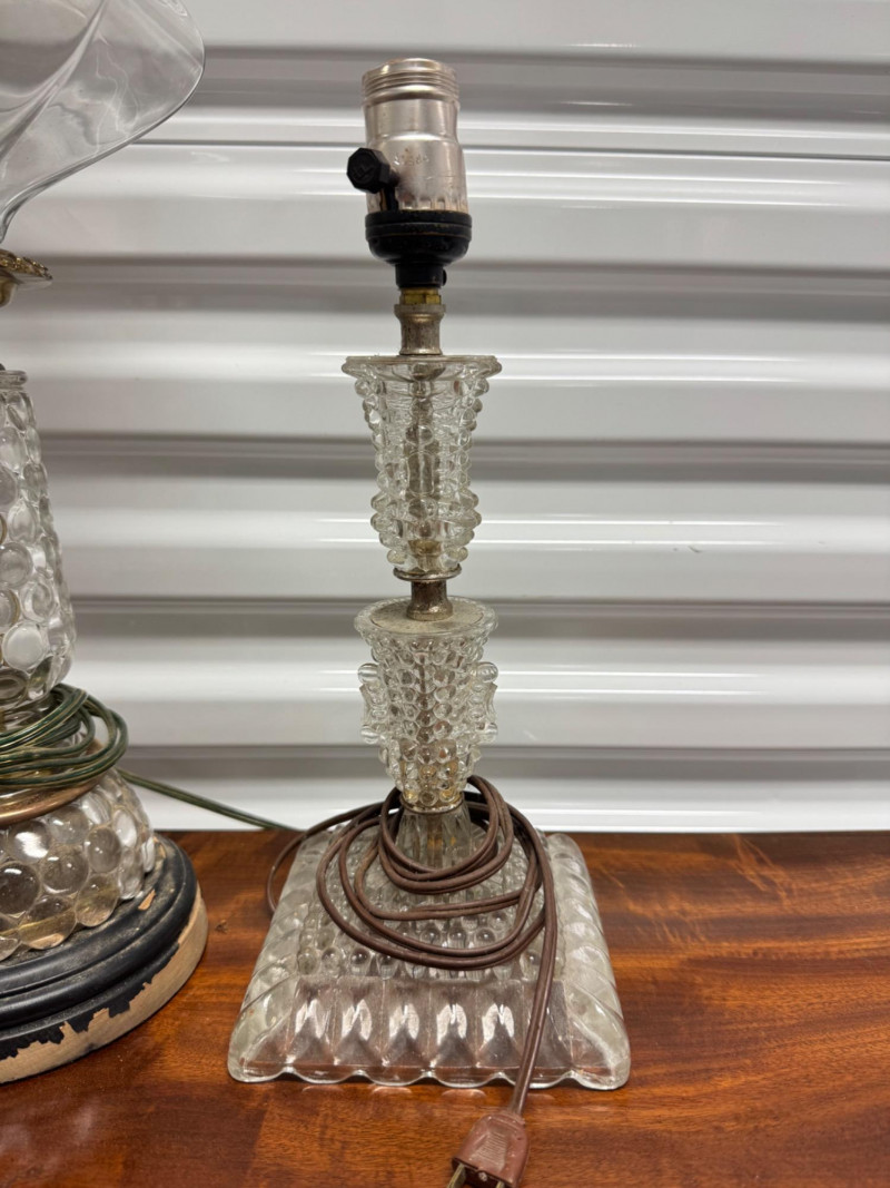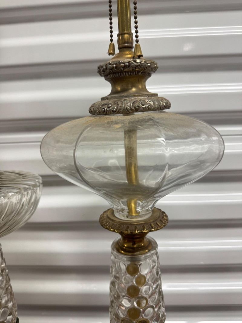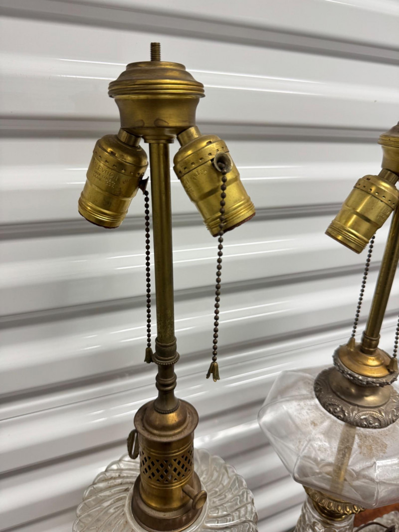 Antique Electrified Oil Lamps, Victorian Empire Style & Hobnail Bases. 13-26” Tall Untested, Some Wear To Finish Bases. PICK UP DETAILS Please plan accordingly—pickup times and locations are strictly by lot number, with no exceptions.