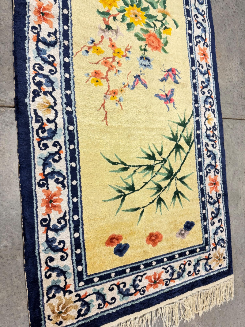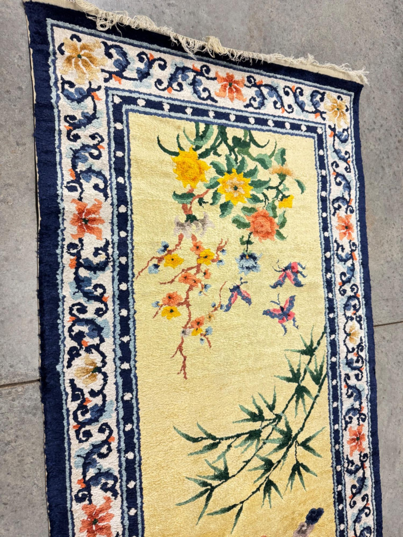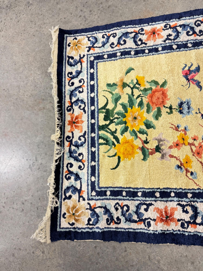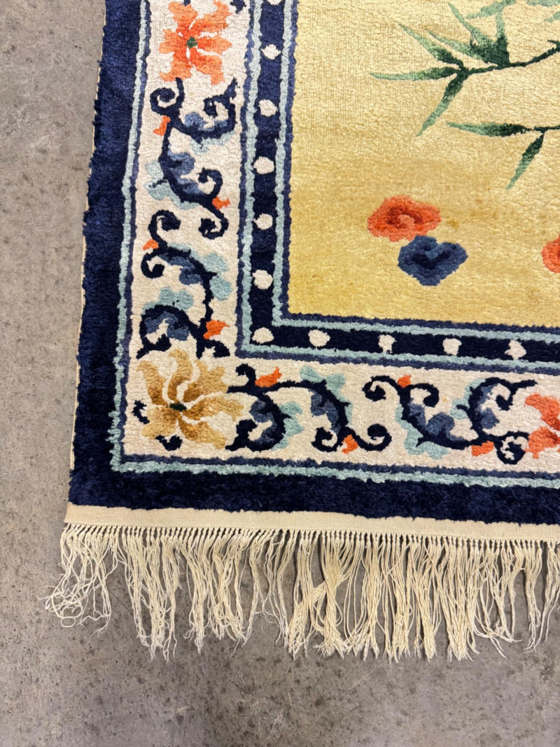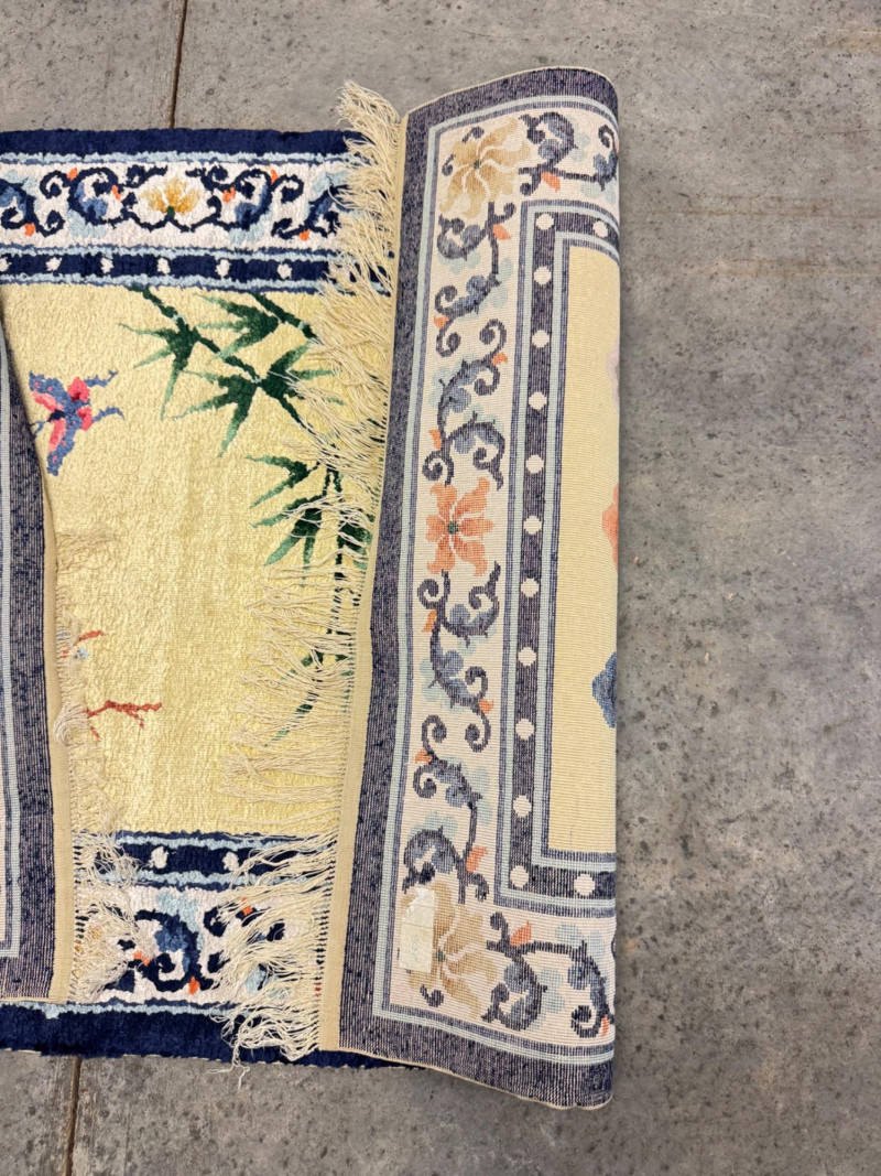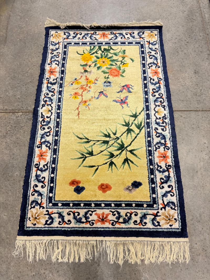 Hand-Knotted Silk Rug w/ Floral & Bamboo Motif, Multicolor Accents. 61 x 37” Disclaimer: Material authenticity is not guaranteed. Although this rug appears to be pure silk, fiber content is sold “as-is” without certification. The fringe also shows wear consistent with age. PICK UP DETAILS Please plan accordingly—pickup times and locations are strictly by lot number, with no exceptions.