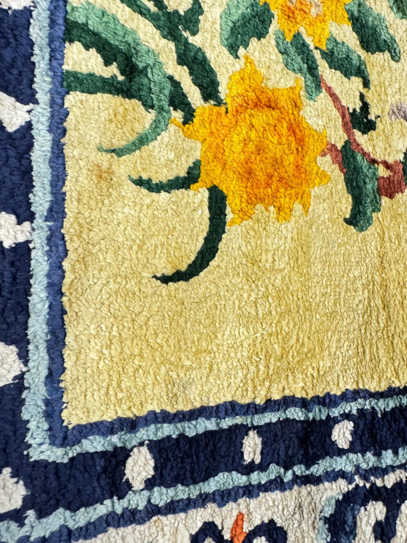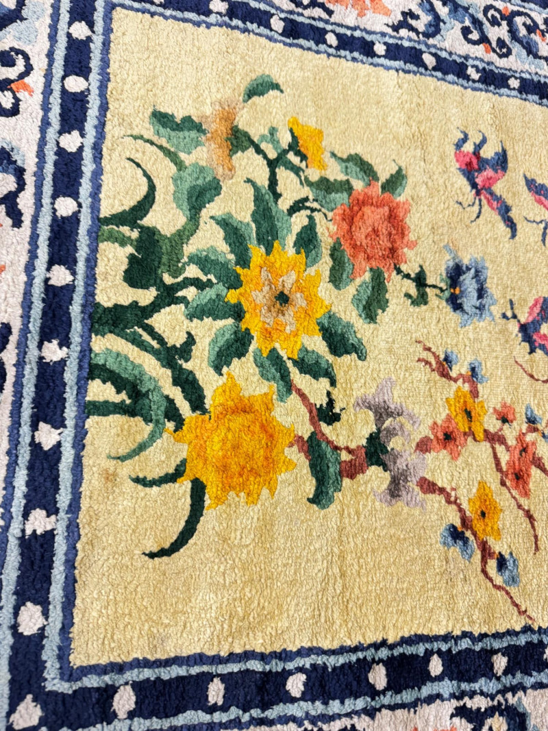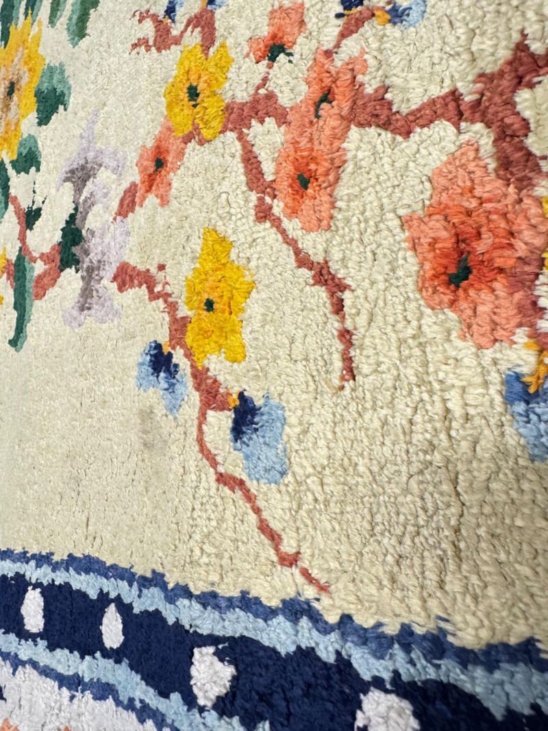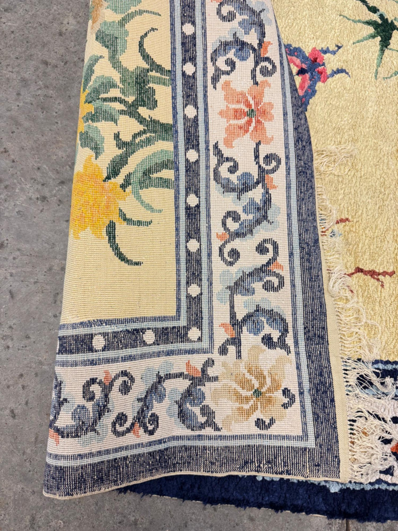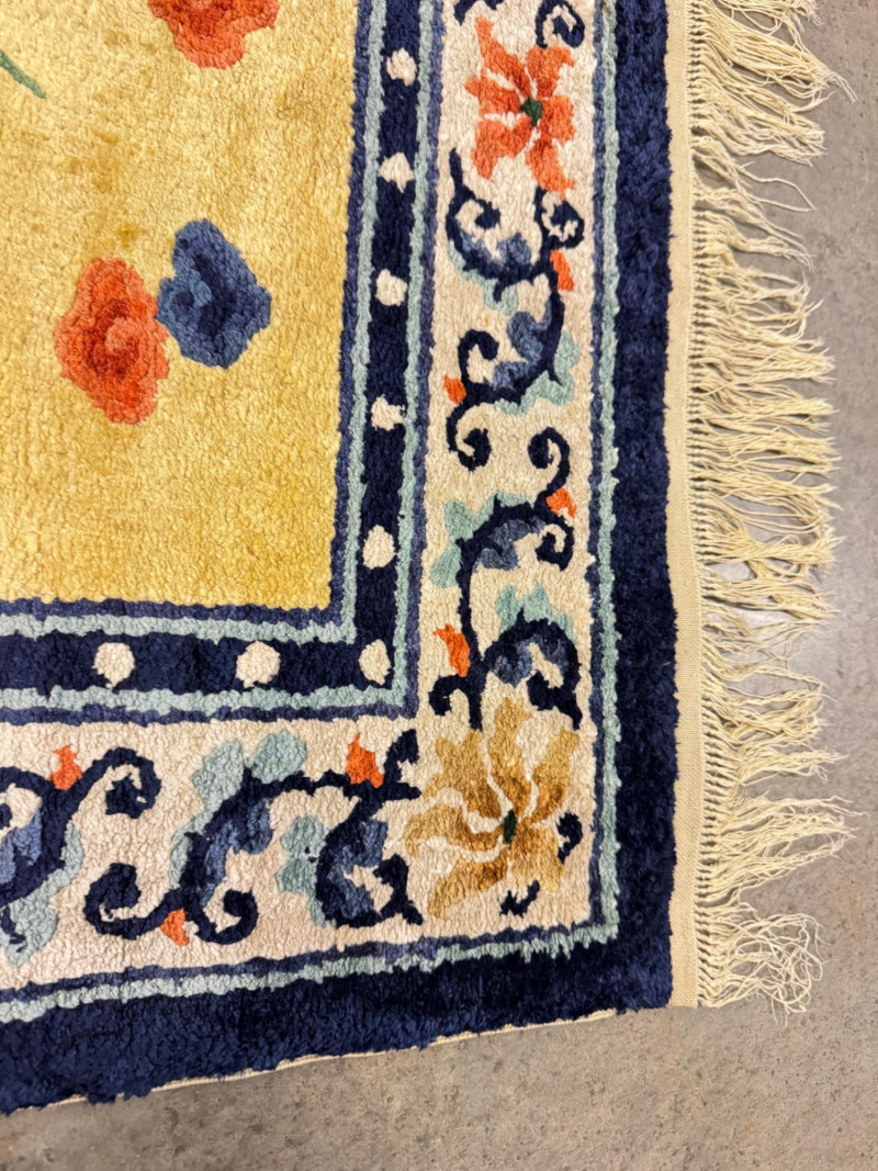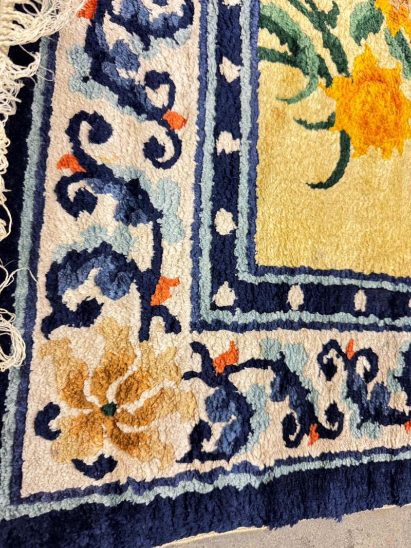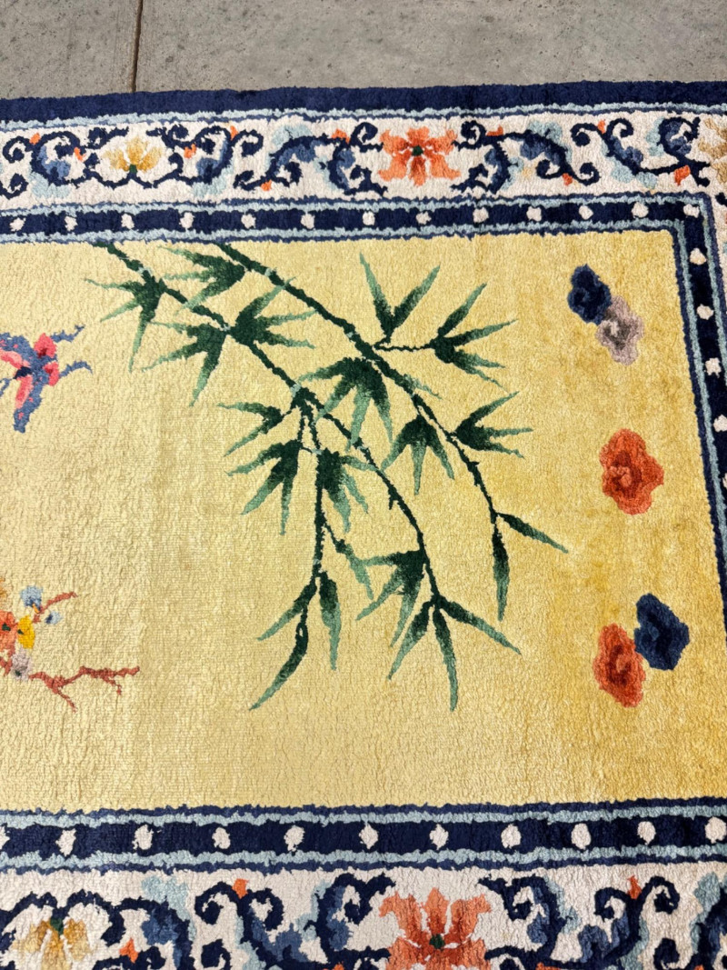 Hand-Knotted Silk Rug w/ Floral & Bamboo Motif, Multicolor Accents. 61 x 37” Disclaimer: Material authenticity is not guaranteed. Although this rug appears to be pure silk, fiber content is sold “as-is” without certification. The fringe also shows wear consistent with age. PICK UP DETAILS Please plan accordingly—pickup times and locations are strictly by lot number, with no exceptions.
