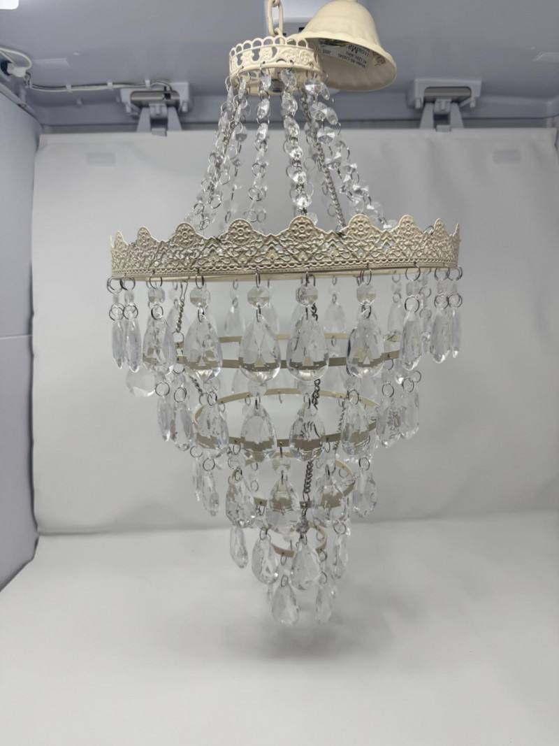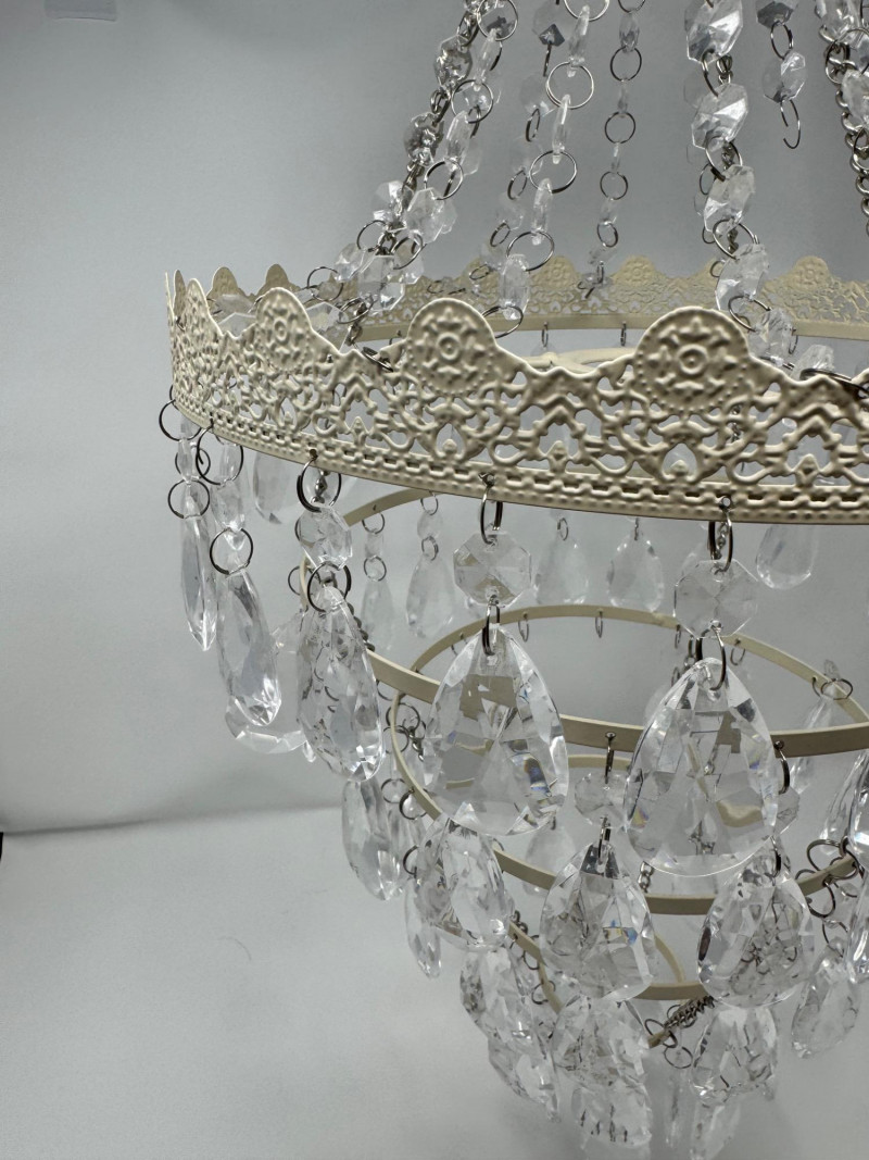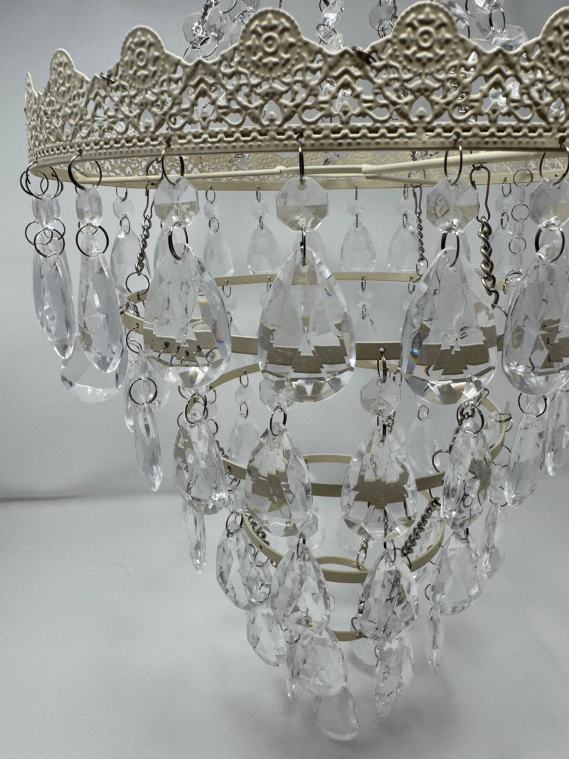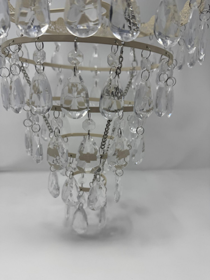 Ornate White Mini Chandelier w/ Tiered Clear Plastic Teardrop Crystals. Dimensions: 11.5 inches diameter, 36 inches long (hanging)