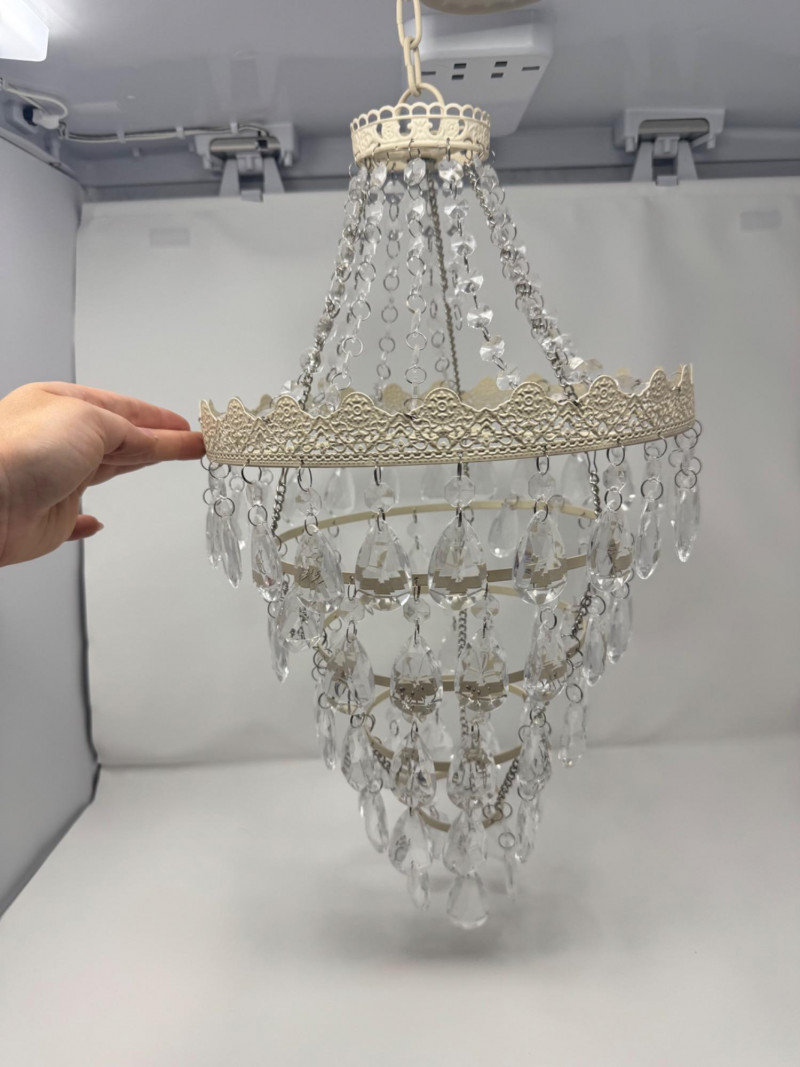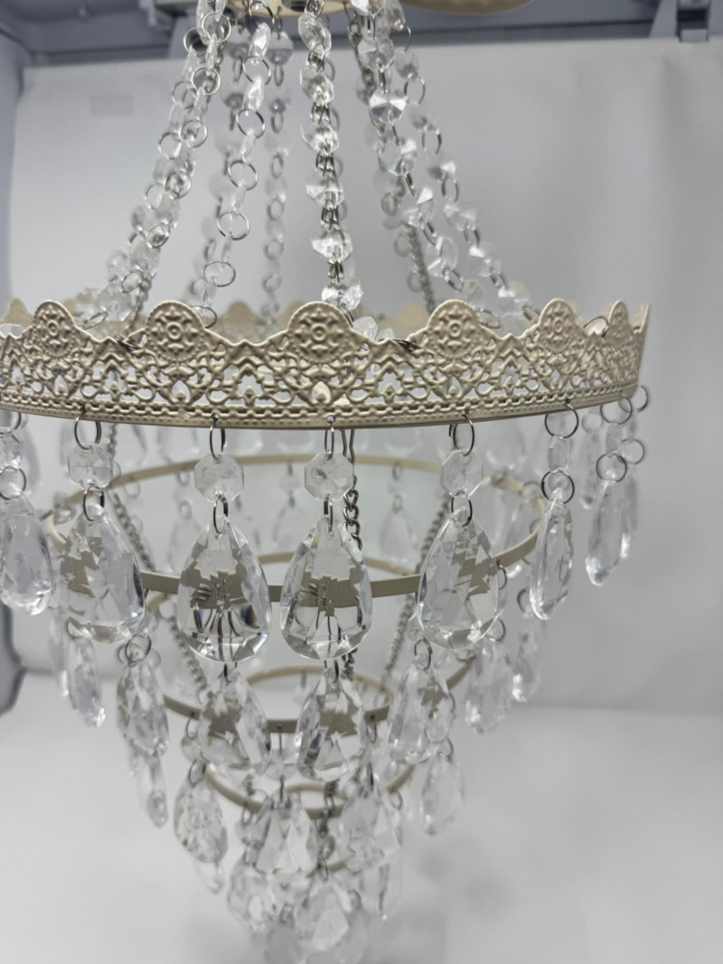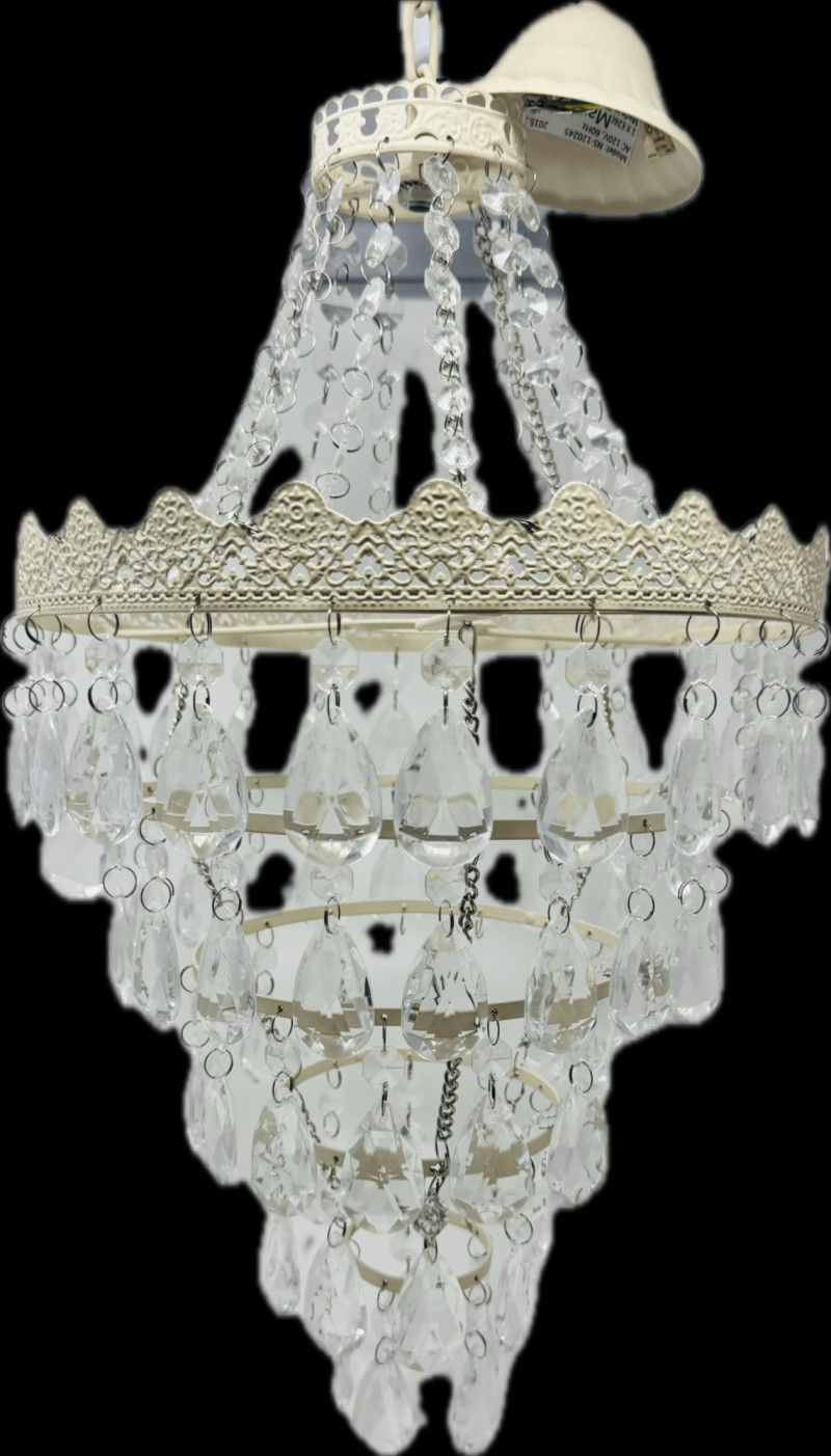 Ornate White Mini Chandelier w/ Tiered Clear Plastic Teardrop Crystals. Dimensions: 11.5 inches diameter, 36 inches long (hanging)