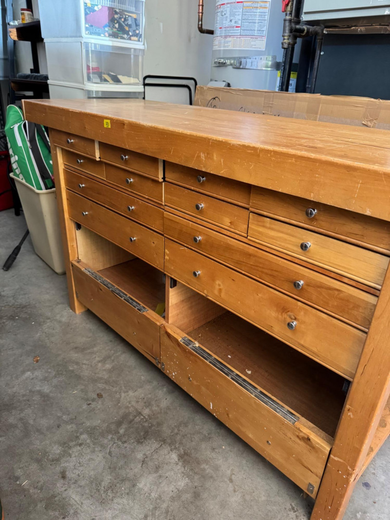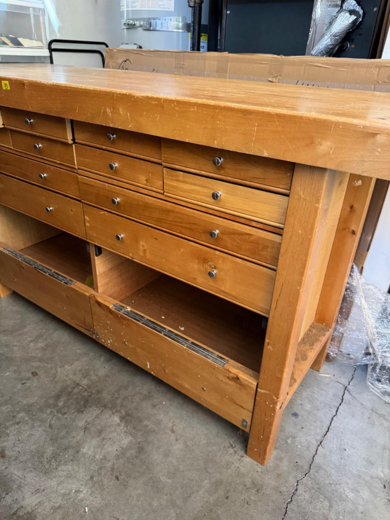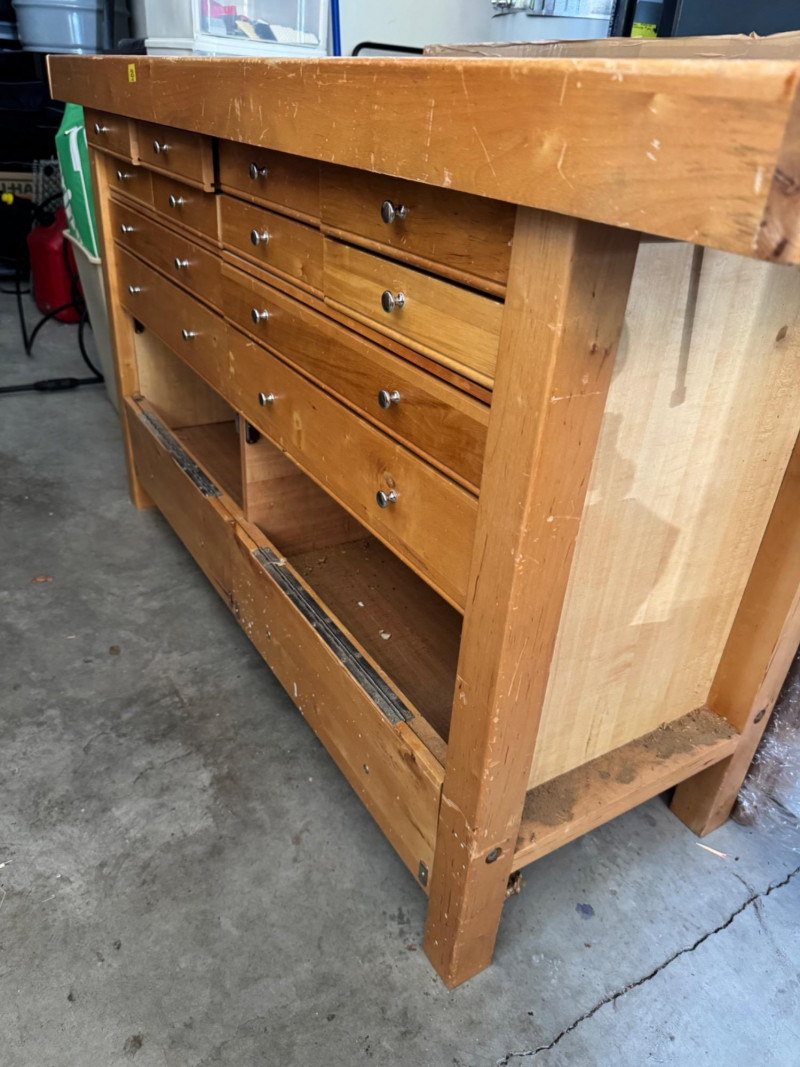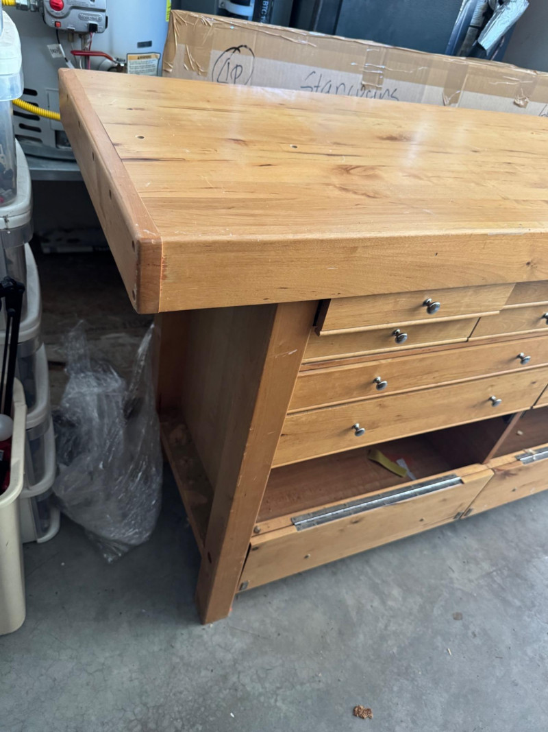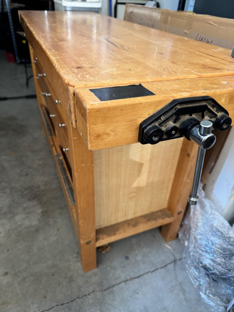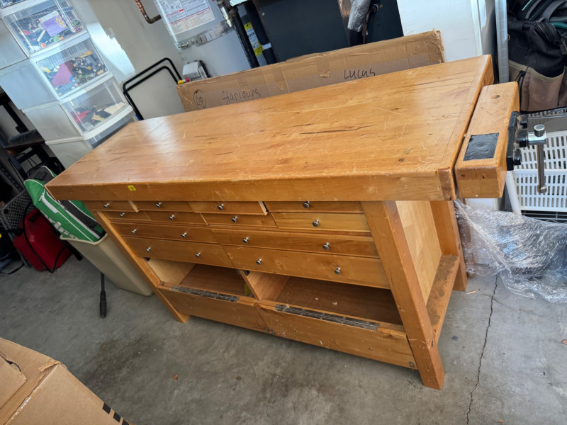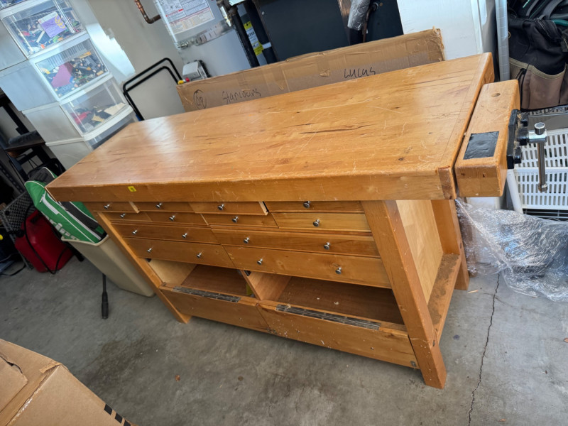 Solid Hardwood Workbench w/ Multiple Drawers & Attached Metal Vise. Remaining Drawer Contents Included. Height (floor to top): 32.5" PICK UP DETAILS Date: Friday, June 13, 2025