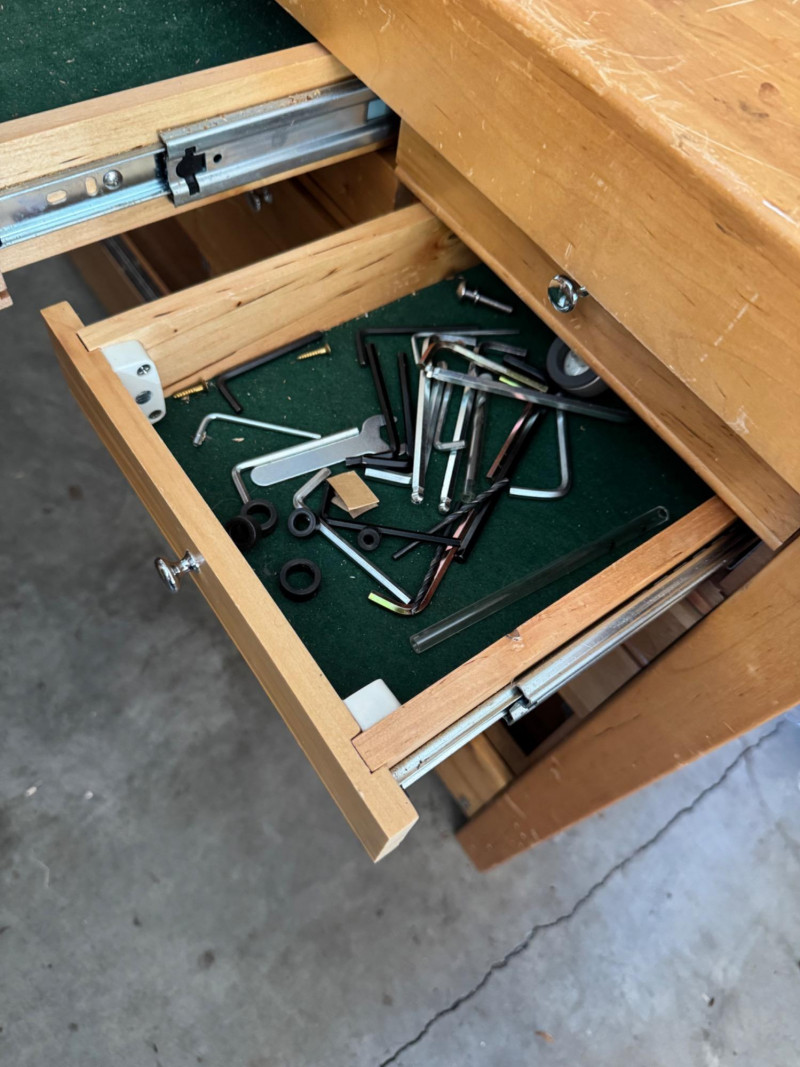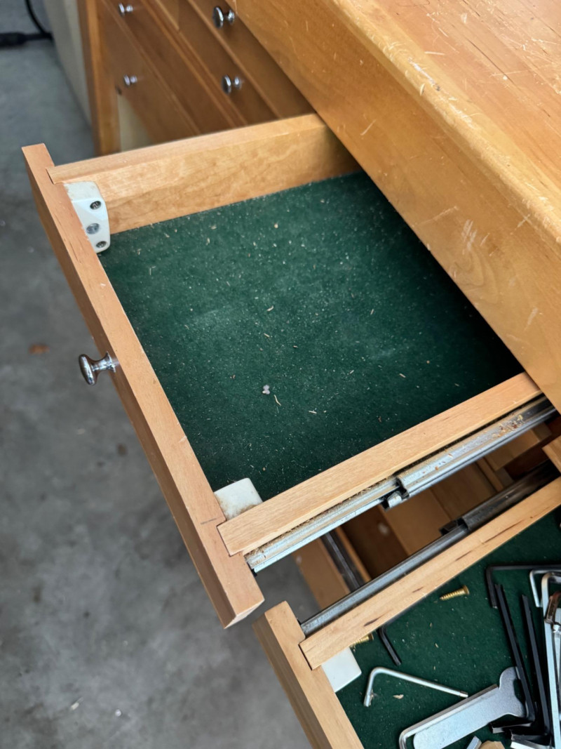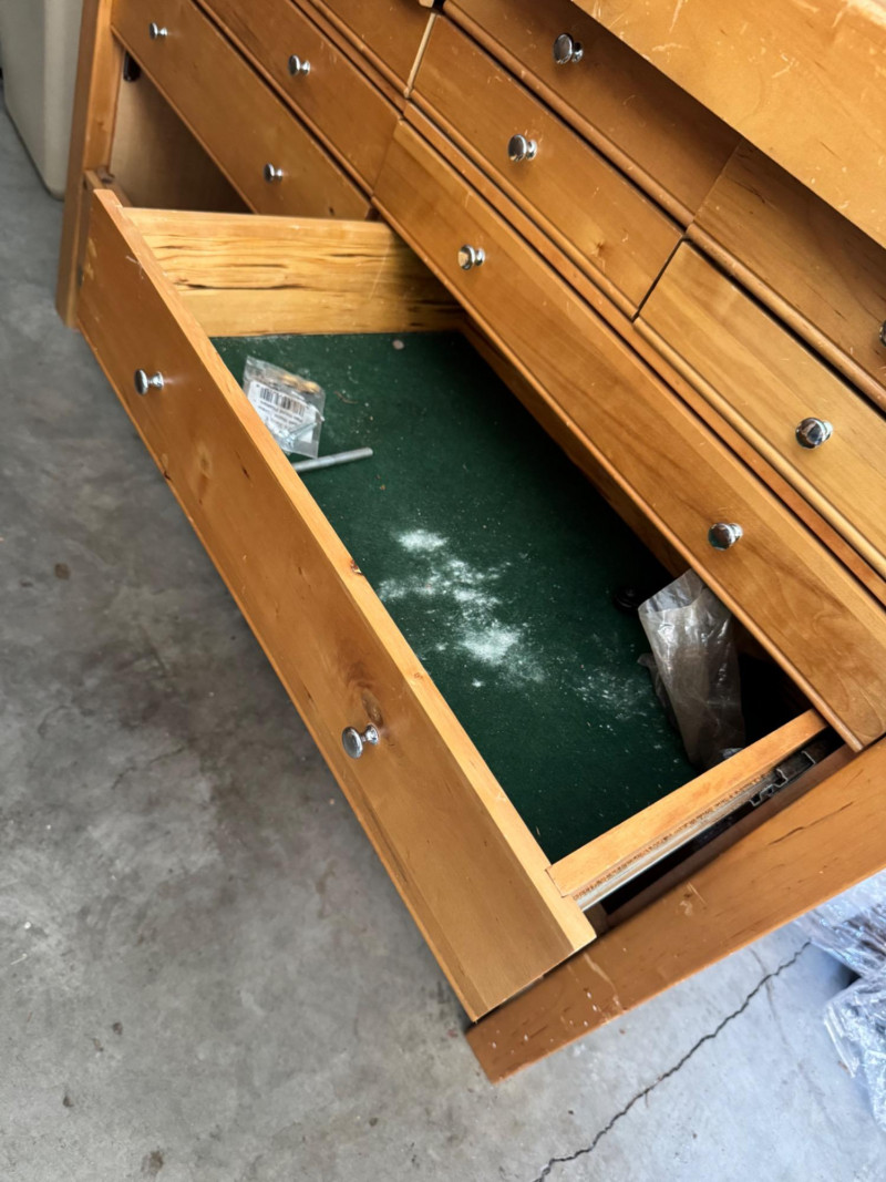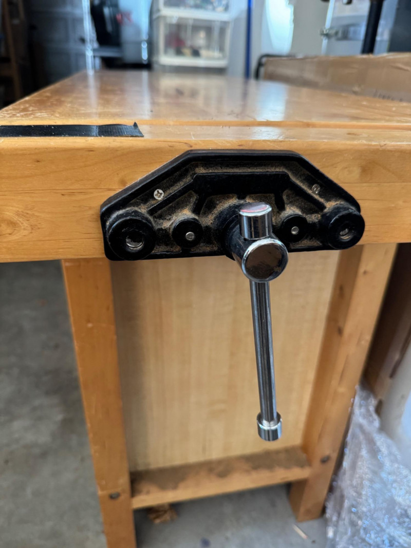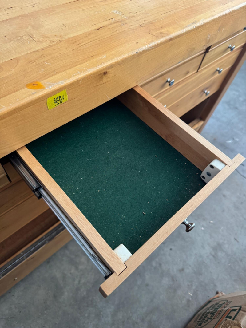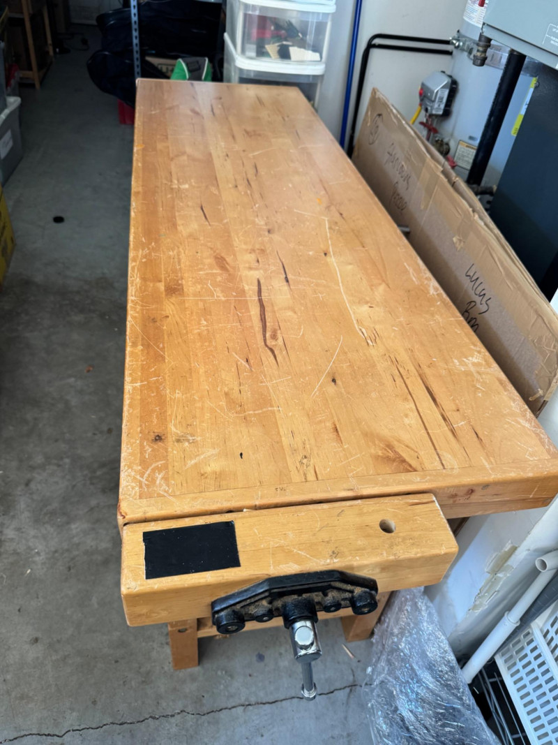 Solid Hardwood Workbench w/ Multiple Drawers & Attached Metal Vise. Remaining Drawer Contents Included. Height (floor to top): 32.5" PICK UP DETAILS Date: Friday, June 13, 2025
