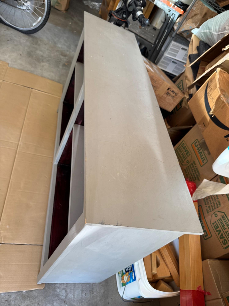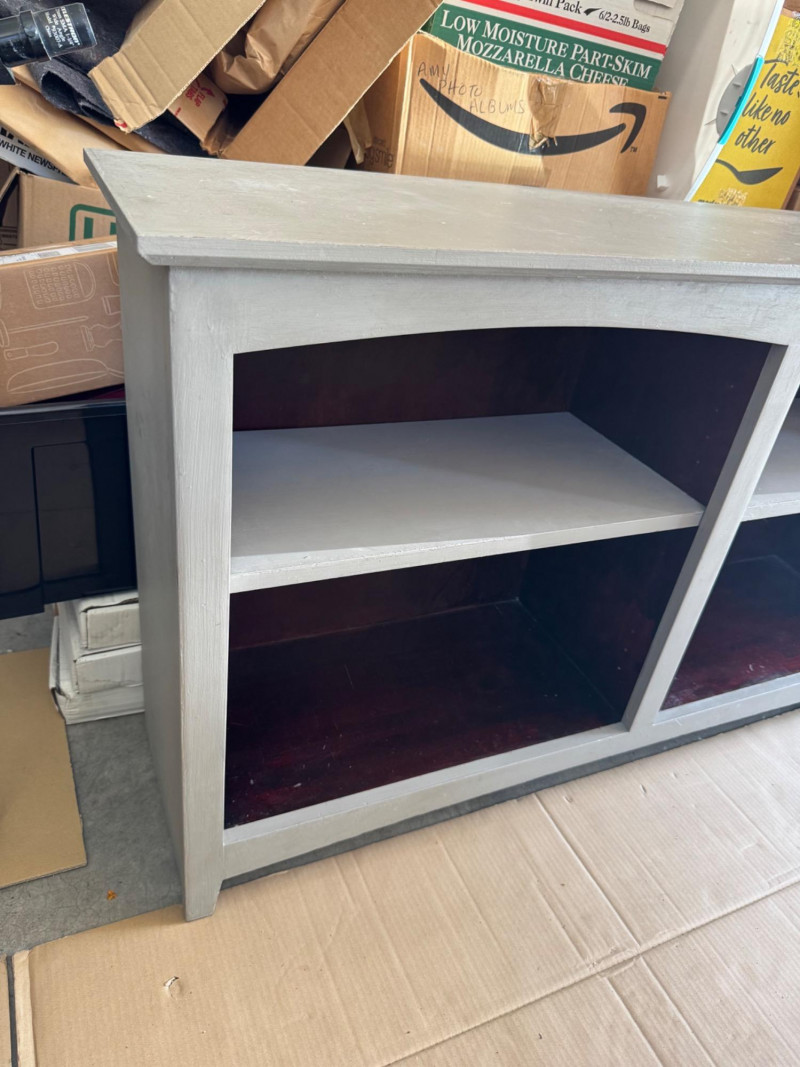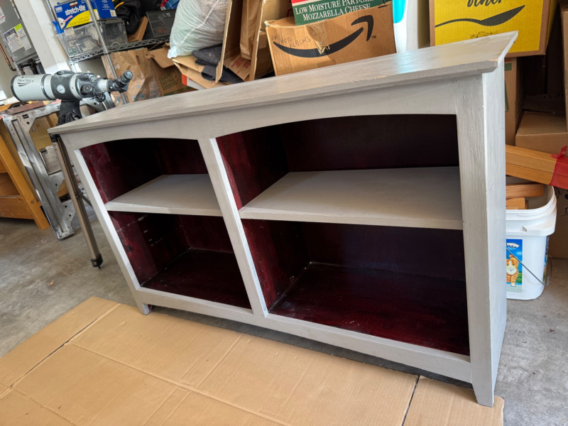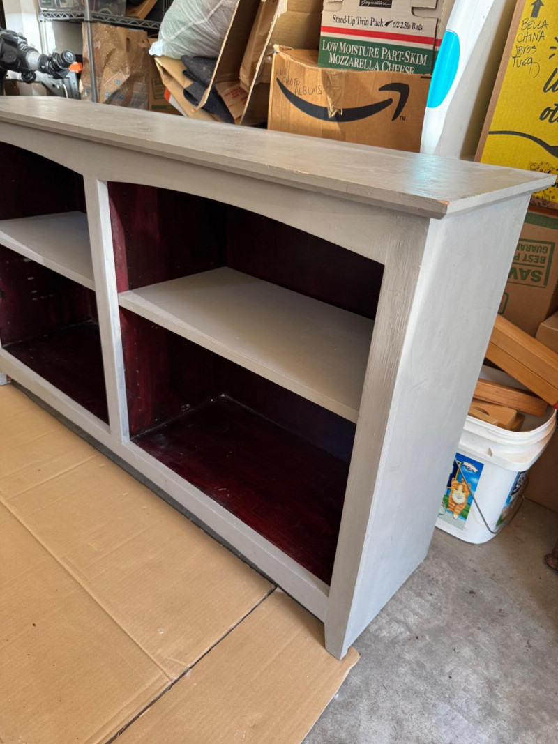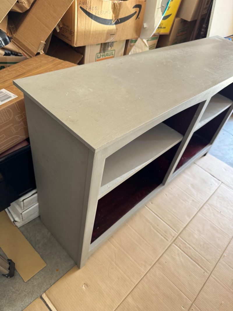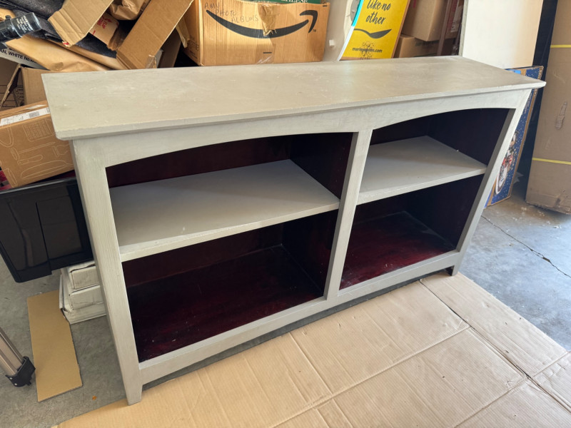 Wooden Console Cabinet w/ Red‐Stained Open Shelves. Depth: 13″ PICK UP DETAILS Date: Friday, June 13, 2025