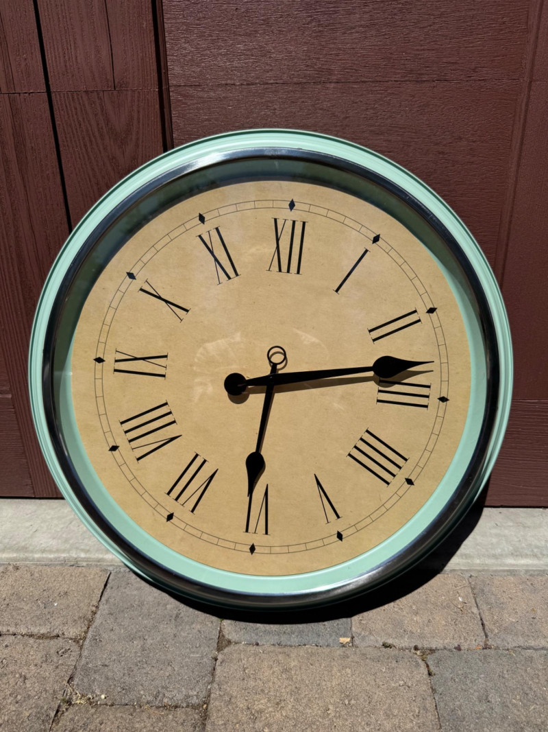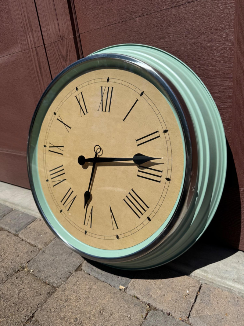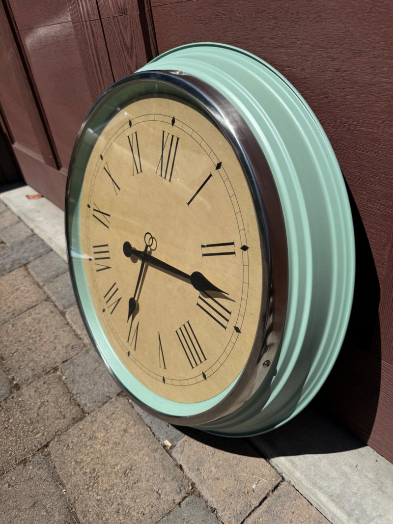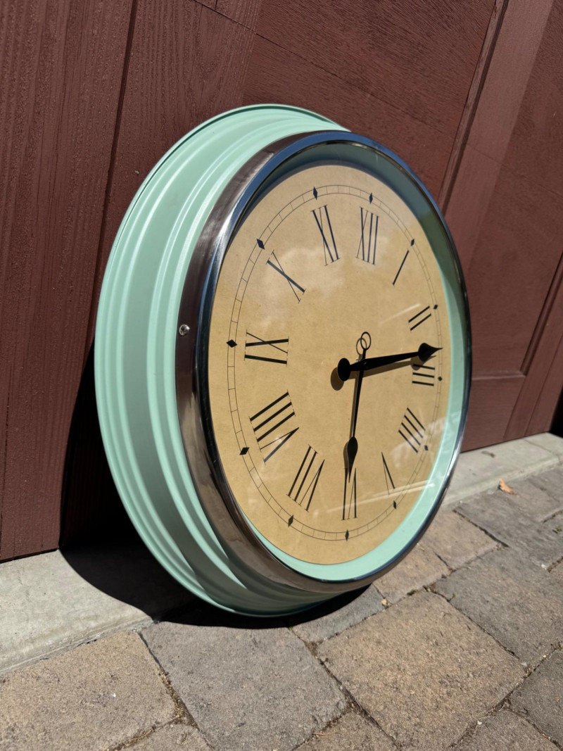 IKEA SKOVEL Retro Mint Metal Wall Clock w/ Roman Numerals. 23” Diameter. PICK UP DETAILS Date: Friday, June 13, 2025