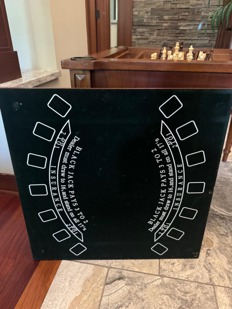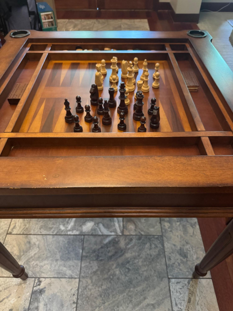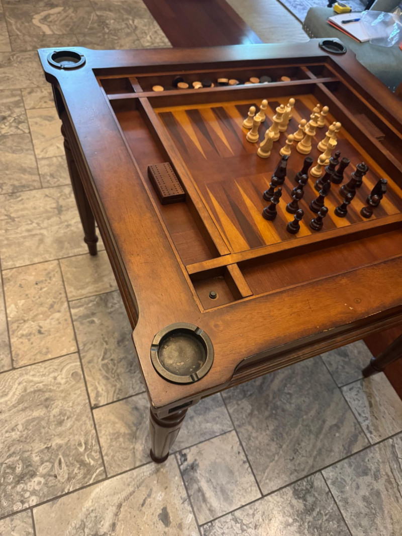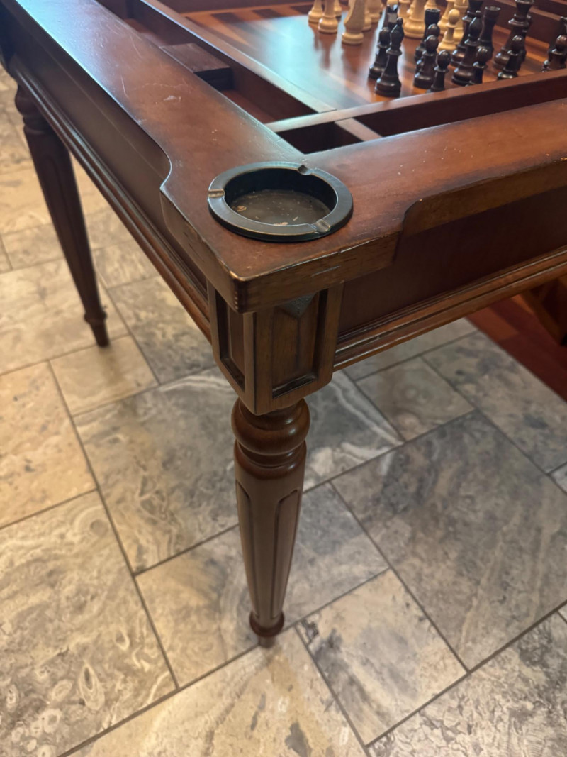Multi‐Game Game Table w/ Chess, Backgammon, Poker, Cribbage & Checkers. 36” x 36” Top 30” Tall Note: Minor wear to fabric. Legs spin off for easy transport. PICK UP DETAILS Date: Friday, June 13, 2025